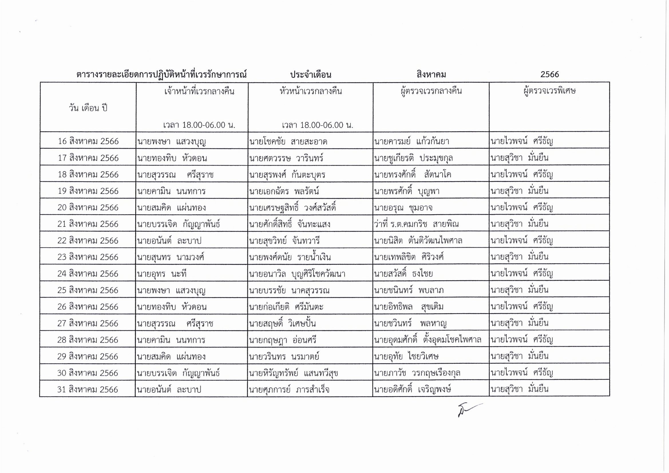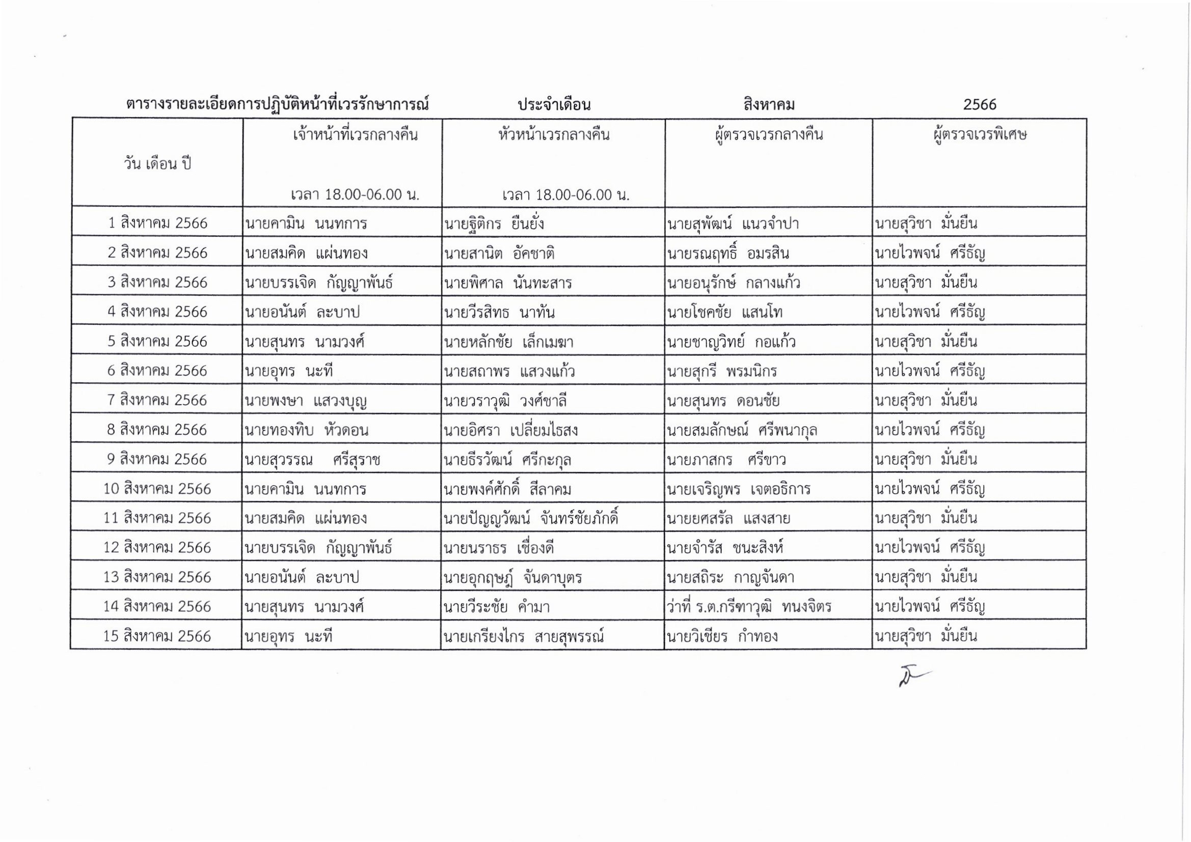 แต่งตั้งบุคคลากรในสังกัดปฏิบัติหน้าที่เวรรักษาการณ์ ภาคกลางคืน ประจำเดือนสิงหาคม 2565