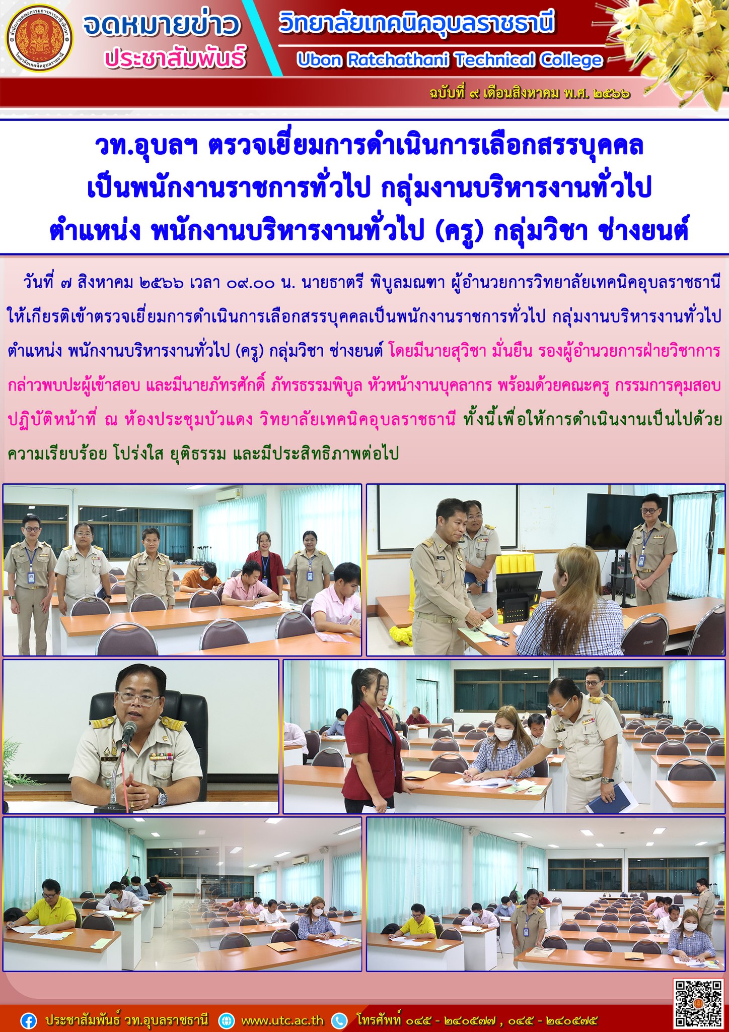 วันที่ ๗ สิงหาคม ๒๕๖๖ เวลา ๐๙.๐๐ น. นายธาตรี พิบูลมณฑา ผู้อำนวยการวิทยาลัยเทคนิคอุบลราชธานี ให้เกียรติเข้าตรวจเยี่ยมการดำเนินการเลือกสรรบุคคลเป็นพนักงานราชการทั่วไป กลุ่มงานบริหารงานทั่วไป ตำแหน่ง พนักงานบริหารงานทั่วไป (ครู) กลุ่มวิชา ช่างยนต์ โดยมีนายสุวิชา มั่นยืน รองผู้อำนวยการฝ่ายวิชาการ กล่าวพบปะผู้เข้าสอบ และมีนายภัทรศักดิ์ ภัทรธรรมพิบูล หัวหน้างานบุคลากร พร้อมด้วยคณะครู กรรมการคุมสอบ ปฏิบัติหน้าที่ ณ ห้องประชุมบัวแดง วิทยาลัยเทคนิคอุบลราชธานี ทั้งนี้เพื่อให้การดำเนินงานเป็นไปด้วยความเรียบร้อย โปร่งใส ยุติธรรม และมีประสิทธิภาพต่อไป