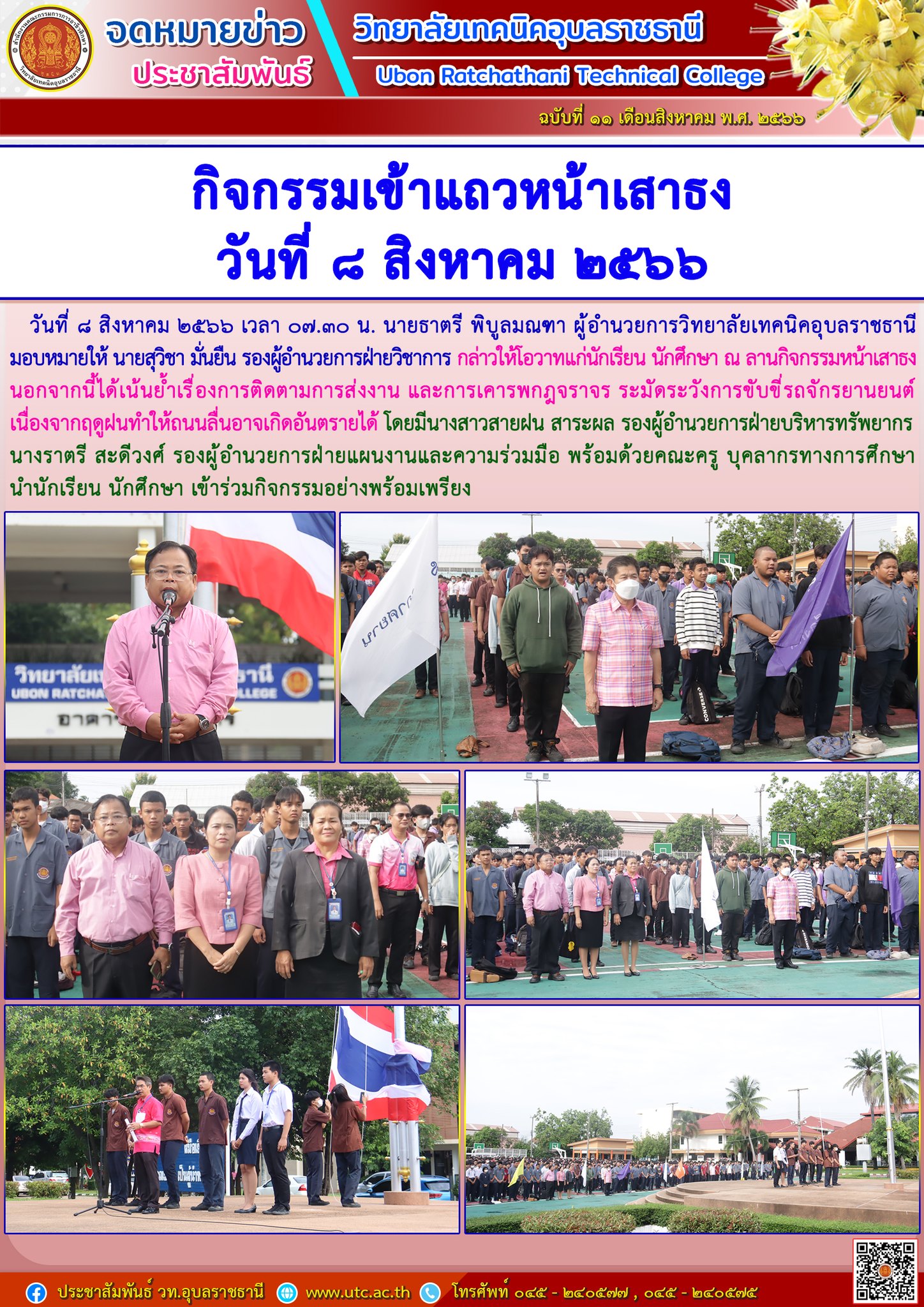 วันที่ ๘ สิงหาคม ๒๕๖๖ เวลา ๐๗.๓๐ น. นายธาตรี พิบูลมณฑา ผู้อำนวยการวิทยาลัยเทคนิคอุบลราชธานี มอบหมายให้ นายสุวิชา มั่นยืน รองผู้อำนวยการฝ่ายวิชาการ กล่าวให้โอวาทแก่นักเรียน นักศึกษา ณ ลานกิจกรรมหน้าเสาธง นอกจากนี้ได้เน้นย้ำเรื่องการติดตามการส่งงาน และการเคารพกฎจราจร ระมัดระวังการขับขี่รถจักรยานยนต์ เนื่องจากฤดูฝนทำให้ถนนลื่นอาจเกิดอันตรายได้ โดยมีนางสาวสายฝน สาระผล รองผู้อำนวยการฝ่ายบริหารทรัพยากร นางราตรี สะดีวงศ์ รองผู้อำนวยการฝ่ายแผนงานและความร่วมมือ พร้อมด้วยคณะครู บุคลากรทางการศึกษา นำนักเรียน นักศึกษา เข้าร่วมกิจกรรมอย่างพร้อมเพรียง