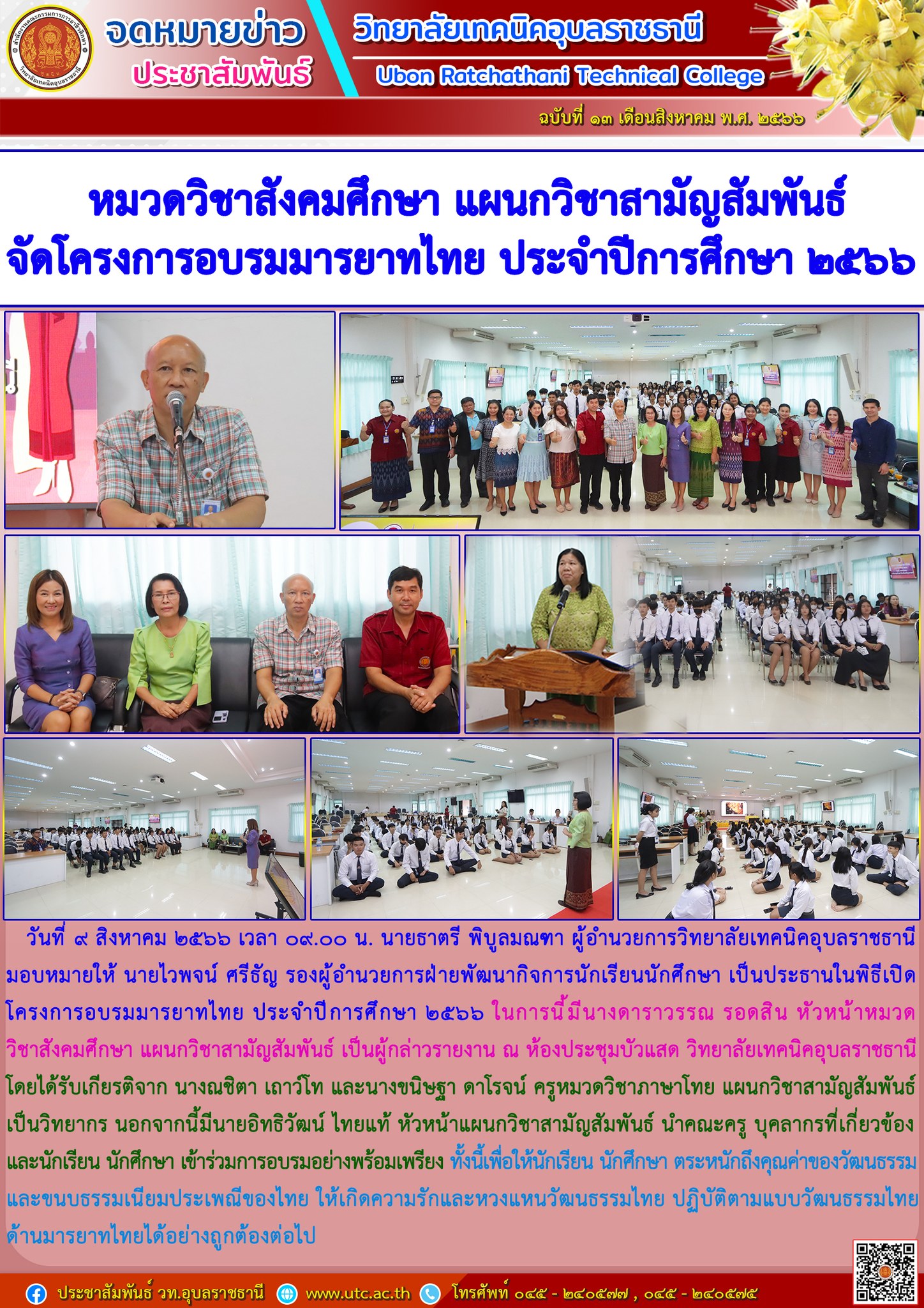 วันที่ ๙ สิงหาคม ๒๕๖๖ เวลา ๐๙.๐๐ น. นายธาตรี พิบูลมณฑา ผู้อำนวยการวิทยาลัยเทคนิคอุบลราชธานี มอบหมายให้ นายไวพจน์ ศรีธัญ รองผู้อำนวยการฝ่ายพัฒนากิจการนักเรียนนักศึกษา เป็นประธานในพิธีเปิดโครงการอบรมมารยาทไทย ประจำปีการศึกษา ๒๕๖๖ ในการนี้มีนางดาราวรรณ รอดสิน หัวหน้าหมวดวิชาสังคมศึกษา แผนกวิชาสามัญสัมพันธ์ เป็นผู้กล่าวรายงาน ณ ห้องประชุมบัวแสด วิทยาลัยเทคนิคอุบลราชธานี โดยได้รับเกียรติจาก นางณชิตา เถาว์โท และนางขนิษฐา ดาโรจน์ ครูหมวดวิชาภาษาโทย แผนกวิชาสามัญสัมพันธ์ เป็นวิทยากร พร้อมด้วยคณะครู บุคลากรที่เกี่ยวข้อง นำนักเรียน นักศึกษาเข้าร่วมการอบรมอย่างพร้อมเพรียง ทั้งนี้เพื่อให้นักเรียน นักศึกษา ตระหนักถึงคุณค่าของวัฒนธรรมและขนบธรรมเนียมประเพณีของไทย ให้เกิดความรักและหวงแหนวัฒนธรรมไทย ปฏิบัติตามแบบวัฒนธรรมไทยด้านมารยาทไทยได้อย่างถูกต้องต่อไป