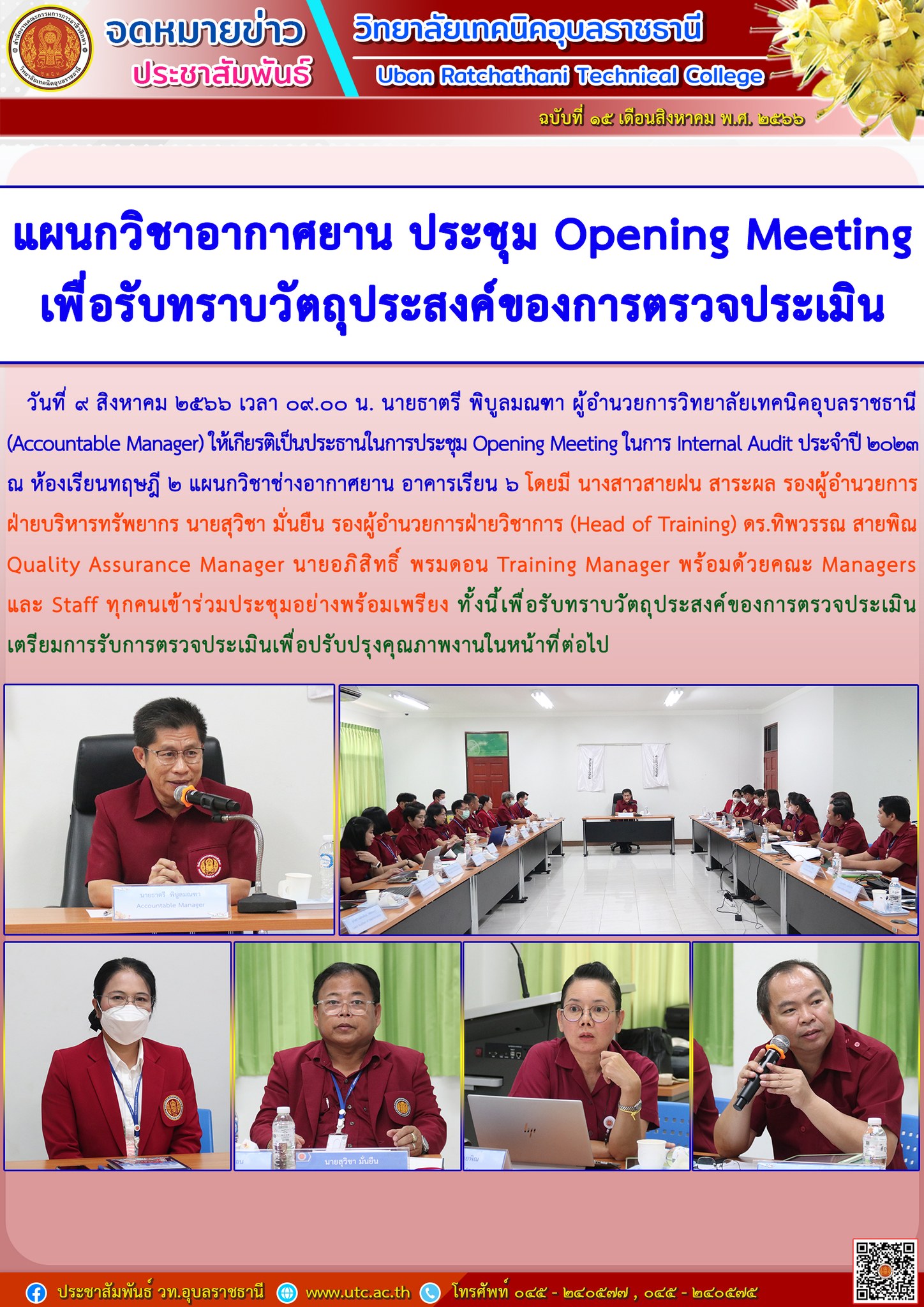 วันที่ ๙ สิงหาคม ๒๕๖๖ เวลา ๐๙.๐๐ น. นายธาตรี พิบูลมณฑา ผู้อำนวยการวิทยาลัยเทคนิคอุบลราชธานี (Accountable Manager) ให้เกียรติเป็นประธานในการประชุม Opening Meeting ในการ Internal Audit ประจำปี ๒๐๒๓ ณ ห้องเรียนทฤษฎี ๒ แผนกวิชาช่างอากาศยาน อาคารเรียน ๖ โดยมี นางสาวสายฝน สาระผล รองผู้อำนวยการ ฝ่ายบริหารทรัพยากร นายสุวิชา มั่นยืน รองผู้อำนวยการฝ่ายวิชาการ (Head of Training) ดร.ทิพวรรณ สายพิณ Quality Assurance Manager นายอภิสิทธิ์ พรมดอน Training Manager พร้อมด้วยคณะ Managers และ Staff ทุกคนเข้าร่วมประชุมอย่างพร้อมเพรียง ทั้งนี้เพื่อรับทราบวัตถุประสงค์ของการตรวจประเมิน เตรียมการรับการตรวจประเมินเพื่อปรับปรุงคุณภาพงานในหน้าที่ต่อไป