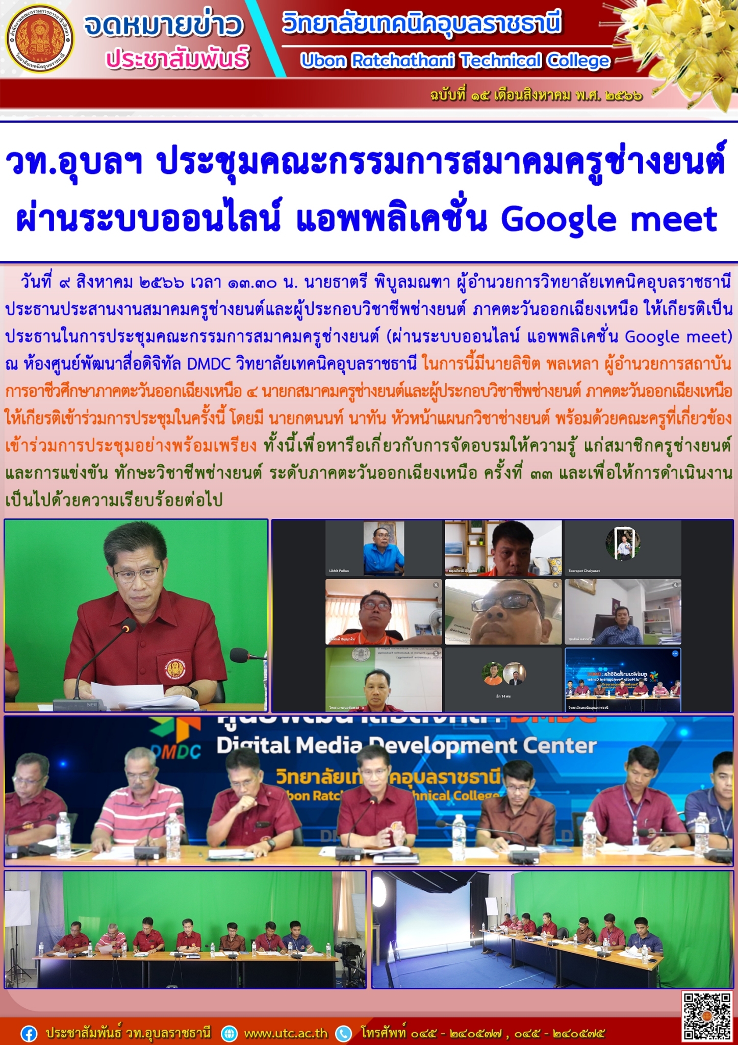 วันที่ ๙ สิงหาคม ๒๕๖๖ เวลา ๑๓.๓๐ น. นายธาตรี พิบูลมณฑา ผู้อำนวยการวิทยาลัยเทคนิคอุบลราชธานี ประธานประสานงานสมาคมครูช่างยนต์และผู้ประกอบวิชาชีพช่างยนต์ ภาคตะวันออกเฉียงเหนือ ให้เกียรติเป็นประธานในการประชุมคณะกรรมการสมาคมครูช่างยนต์ (ผ่านระบบออนไลน์ แอพพลิเคชั่น Google meet) ณ ห้องศูนย์พัฒนาสื่อดิจิทัล DMDC วิทยาลัยเทคนิคอุบลราชธานี ในการนี้มีนายลิขิต พลเหลา ผู้อำนวยการสถาบันการอาชีวศึกษาภาคตะวันออกเฉียงเหนือ ๔ นายกสมาคมครูช่างยนต์และผู้ประกอบวิชาชีพช่างยนต์ ภาคตะวันออกเฉียงเหนือ ให้เกียรติเข้าร่วมการประชุมในครั้งนี้ โดยมี นายกตนนท์ นาทัน หัวหน้าแผนกวิชาช่างยนต์ พร้อมด้วยคณะครูที่เกี่ยวข้อง เข้าร่วมการประชุมอย่างพร้อมเพรียง ทั้งนี้เพื่อหารือเกี่ยวกับการจัดอบรมให้ความรู้ แก่สมาชิกครูช่างยนต์ และการแข่งขัน ทักษะวิชาชีพช่างยนต์ ระดับภาคตะวันออกเฉียงเหนือ ครั้งที่ ๓๓ และเพื่อให้การดำเนินงานเป็นไปด้วยความเรียบร้อยต่อไป