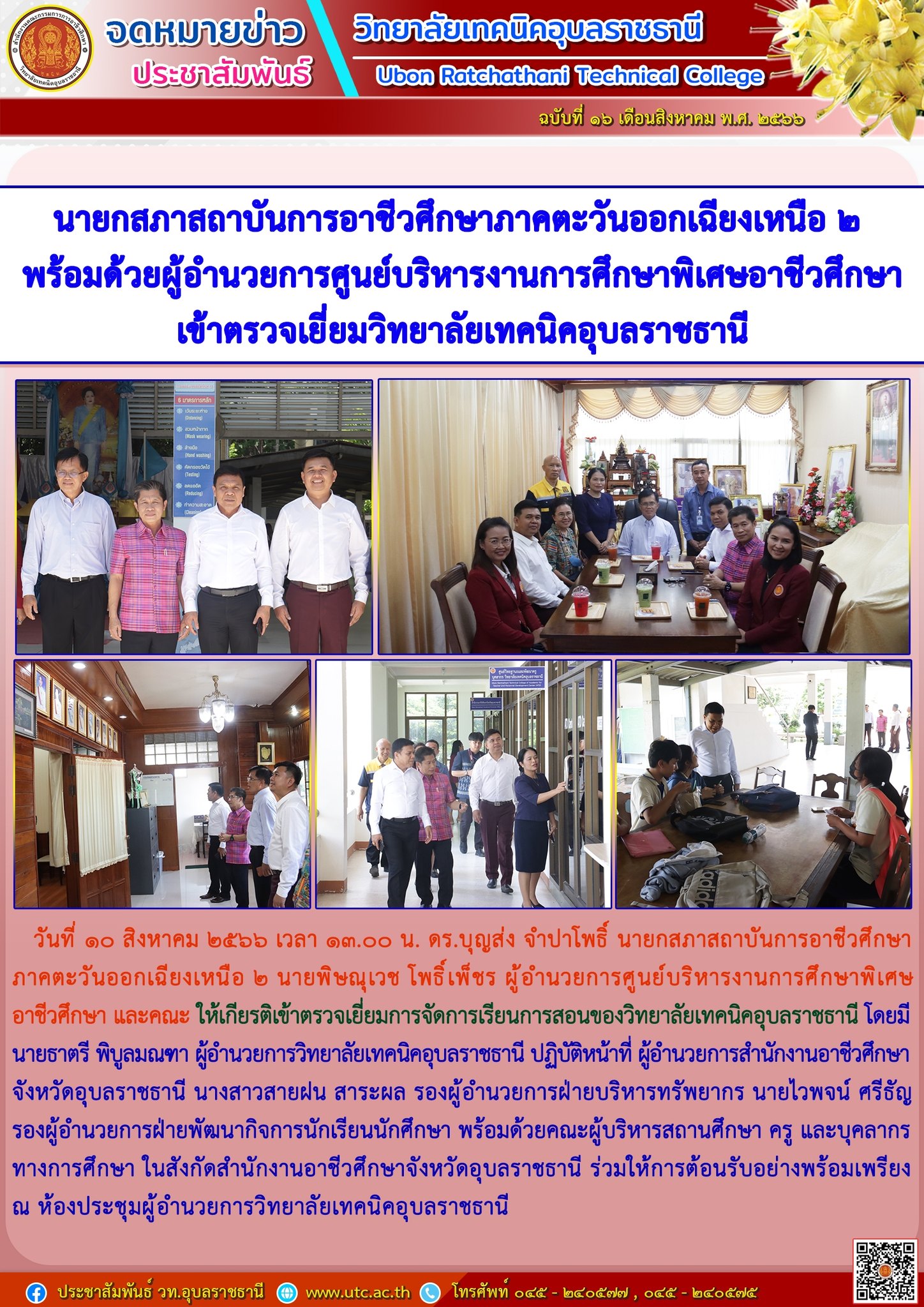วันที่ ๑๐ สิงหาคม ๒๕๖๖ เวลา ๑๓.๐๐ น. ดร.บุญส่ง จำปาโพธิ์ นายกสภาสถาบันการอาชีวศึกษาภาคตะวันออกเฉียงเหนือ ๒ นายพิษณุเวช โพธิ์เพ็ชร ผู้อำนวยการศูนย์บริหารงานการศึกษาพิเศษอาชีวศึกษา และคณะ ให้เกียรติเข้าตรวจเยี่ยมการจัดการเรียนการสอนของวิทยาลัยเทคนิคอุบลราชธานี โดยมี นายธาตรี พิบูลมณฑา ผู้อำนวยการวิทยาลัยเทคนิคอุบลราชธานี ปฏิบัติหน้าที่ ผู้อำนวยการสำนักงานอาชีวศึกษาจังหวัดอุบลราชธานี นางสาวสายฝน สาระผล รองผู้อำนวยการฝ่ายบริหารทรัพยากร นายไวพจน์ ศรีธัญ รองผู้อำนวยการฝ่ายพัฒนากิจการนักเรียนนักศึกษา พร้อมด้วยคณะผู้บริหารสถานศึกษา ครู และบุคลากรทางการศึกษา ในสังกัดสำนักงานอาชีวศึกษาจังหวัดอุบลราชธานี ร่วมให้การต้อนรับอย่างพร้อมเพรียง ณ ห้องประชุมผู้อำนวยการวิทยาลัยเทคนิคอุบลราชธานี
