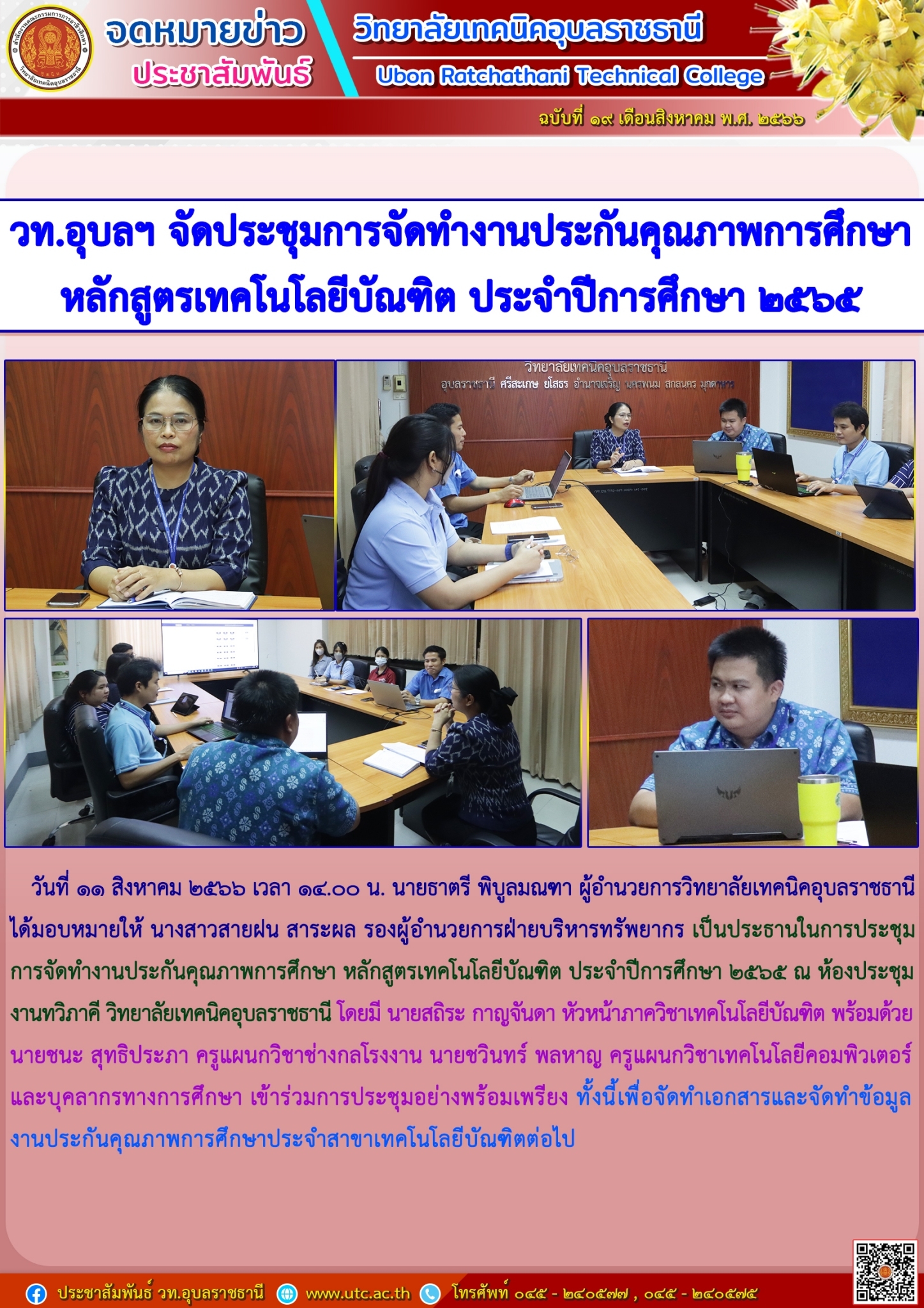 วันที่ ๑๑ สิงหาคม ๒๕๖๖ เวลา ๑๔.๐๐ น. นายธาตรี พิบูลมณฑา ผู้อำนวยการวิทยาลัยเทคนิคอุบลราชธานี ได้มอบหมายให้ นางสาวสายฝน สาระผล รองผู้อำนวยการฝ่ายบริหารทรัพยากร เป็นประธานในการประชุมการจัดทำงานประกันคุณภาพการศึกษา หลักสูตรเทคโนโลยีบัณฑิต ประจำปีการศึกษา ๒๕๖๕ ณ ห้องประชุมงานทวิภาคี วิทยาลัยเทคนิคอุบลราชธานี โดยมี นายสถิระ กาญจันดา หัวหน้าภาควิชาเทคโนโลยีบัณฑิต พร้อมด้วยนายชนะ สุทธิประภา ครูแผนกวิชาช่างกลโรงงาน นายชวินทร์ พลหาญ ครูแผนกวิชาเทคโนโลยีคอมพิวเตอร์ และบุคลากรทางการศึกษา เข้าร่วมการประชุมอย่างพร้อมเพรียง ทั้งนี้เพื่อจัดทำเอกสารและจัดทำข้อมูลงานประกันคุณภาพการศึกษาประจำสาขาเทคโนโลยีบัณฑิตต่อไป