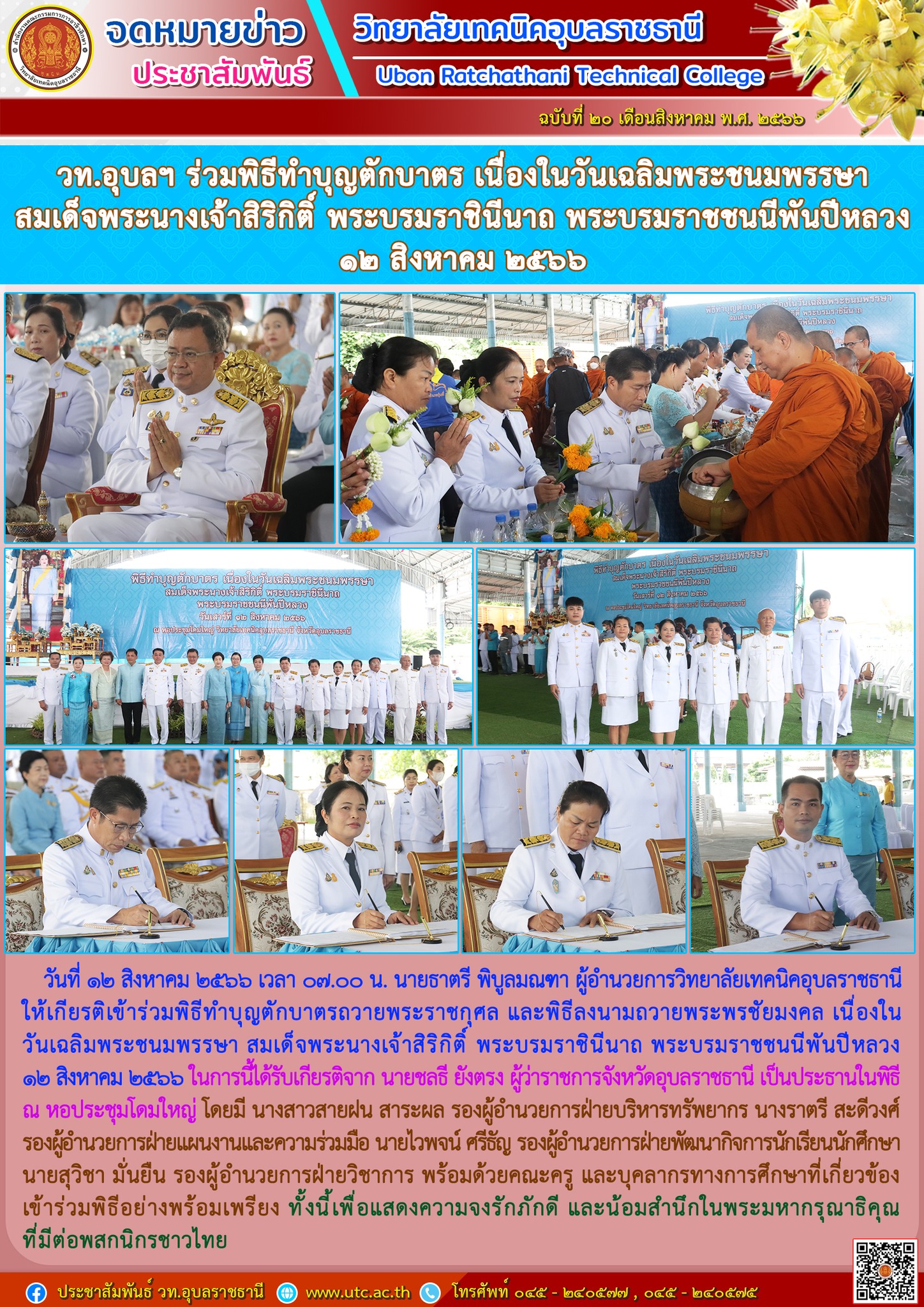 วันที่ ๑๒ สิงหาคม ๒๕๖๖ เวลา ๐๗.๐๐ น. นายธาตรี พิบูลมณฑา ผู้อำนวยการวิทยาลัยเทคนิคอุบลราชธานี ให้เกียรติเข้าร่วมพิธีทำบุญตักบาตรถวายพระราชกุศล และพิธีลงนามถวายพระพรชัยมงคล เนื่องในวันเฉลิมพระชนมพรรษา สมเด็จพระนางเจ้าสิริกิติ์ พระบรมราชินีนาถ พระบรมราชชนนีพันปีหลวง ๑๒ สิงหาคม ๒๕๖๖ ในการนี้ได้รับเกียรติจาก นายชลธี ยังตรง ผู้ว่าราชการจังหวัดอุบลราชธานี เป็นประธานในพิธี ณ หอประชุมโดมใหญ่ โดยมี นางสาวสายฝน สาระผล รองผู้อำนวยการฝ่ายบริหารทรัพยากร นางราตรี สะดีวงศ์ รองผู้อำนวยการฝ่ายแผนงานและความร่วมมือ นายไวพจน์ ศรีธัญ รองผู้อำนวยการฝ่ายพัฒนากิจการนักเรียนนักศึกษา นายสุวิชา มั่นยืน รองผู้อำนวยการฝ่ายวิชาการ พร้อมด้วยคณะครู และบุคลากรทางการศึกษาที่เกี่ยวข้อง เข้าร่วมพิธีอย่างพร้อมเพรียง ทั้งนี้เพื่อแสดงความจงรักภักดี และน้อมสำนึกในพระมหากรุณาธิคุณที่มีต่อพสกนิกรชาวไทย