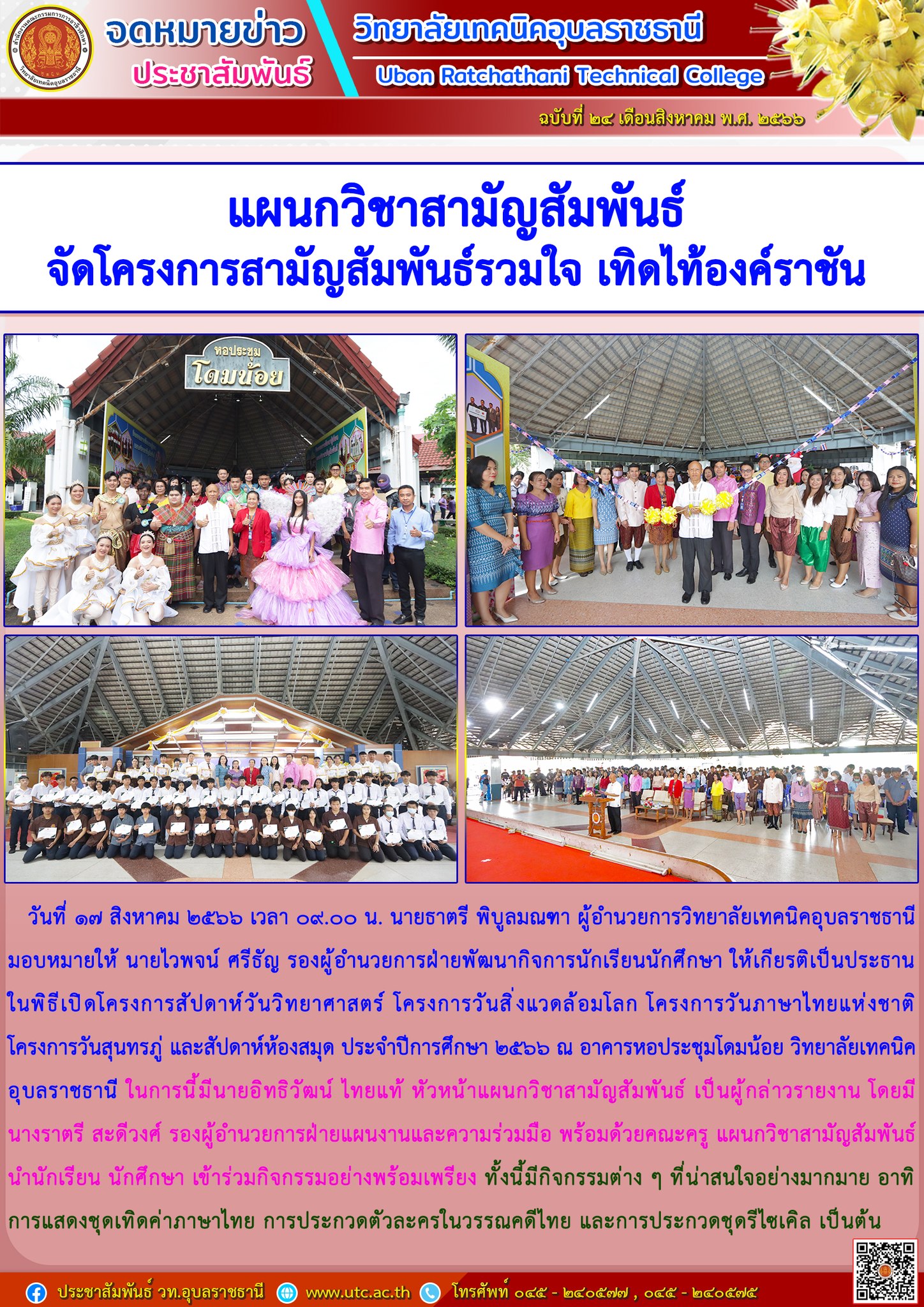 วันที่ ๑๗ สิงหาคม ๒๕๖๖ เวลา ๐๙.๐๐ น. นายธาตรี พิบูลมณฑา ผู้อำนวยการวิทยาลัยเทคนิคอุบลราชธานี มอบหมายให้ นายไวพจน์ ศรีธัญ รองผู้อำนวยการฝ่ายพัฒนากิจการนักเรียนนักศึกษา ให้เกียรติเป็นประธานในพิธีเปิดโครงการสัปดาห์วันวิทยาศาสตร์ โครงการวันสิ่งแวดล้อมโลก โครงการวันภาษาไทยแห่งชาติ โครงการวันสุนทรภู่ และสัปดาห์ห้องสมุด ประจำปีการศึกษา ๒๕๖๖ ณ อาคารหอประชุมโดมน้อย วิทยาลัยเทคนิค อุบลราชธานี ในการนี้มีนายอิทธิวัฒน์ ไทยแท้ หัวหน้าแผนกวิชาสามัญสัมพันธ์ เป็นผู้กล่าวรายงาน โดยมี นางราตรี สะดีวงศ์ รองผู้อำนวยการฝ่ายแผนงานและความร่วมมือ พร้อมด้วยคณะครู แผนกวิชาสามัญสัมพันธ์ นำนักเรียน นักศึกษา เข้าร่วมกิจกรรมอย่างพร้อมเพรียง ทั้งนี้มีกิจกรรมต่าง ๆ ที่น่าสนใจอย่างมากมาย อาทิ การแสดงชุดเทิดค่าภาษาไทย การประกวดตัวละครในวรรณคดีไทย และการประกวดชุดรีไซเคิล เป็น