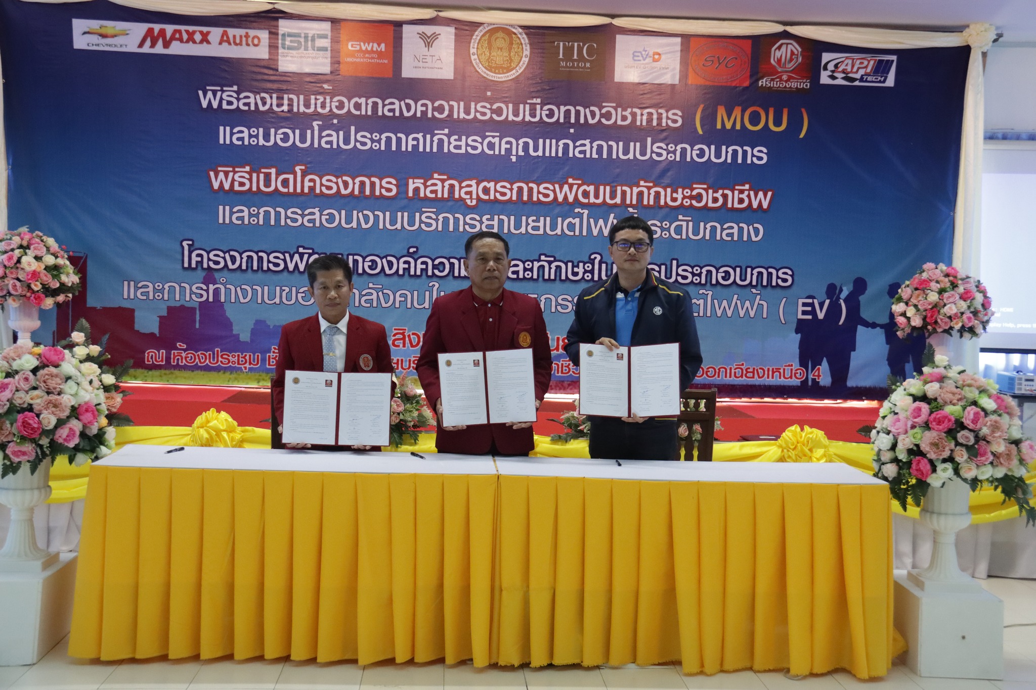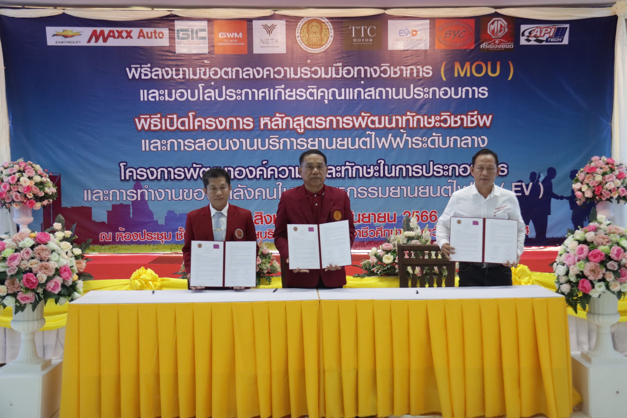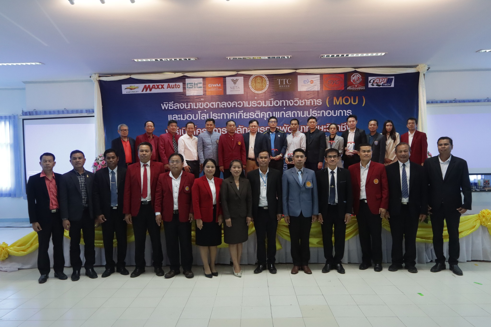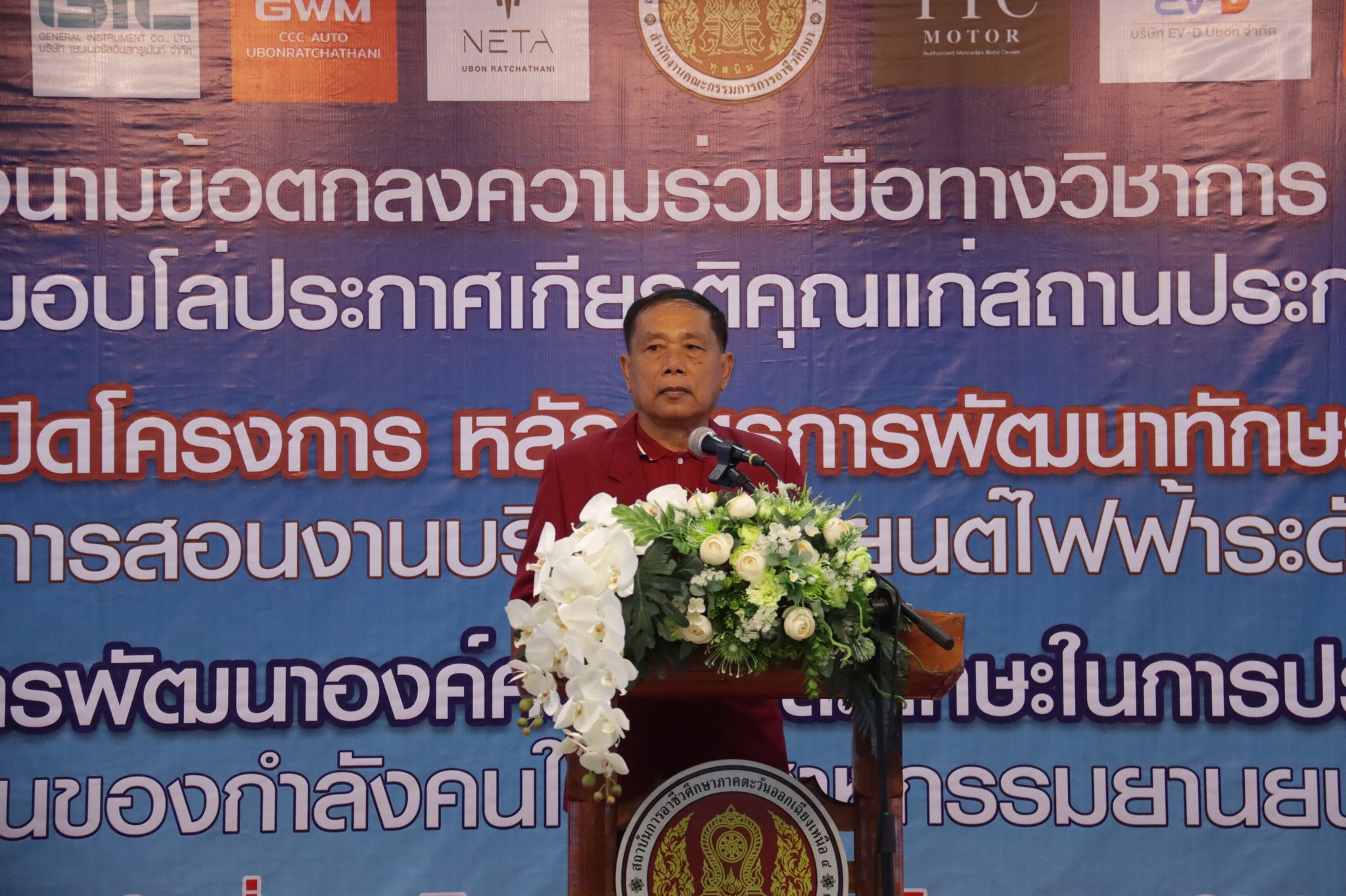 วันที่ ๑ กันยายน ๒๕๖๖ เวลา ๑๐.๐๐ น. นายลิขิต พลเหลา ผู้อำนวยการสถาบันการอาชีวศึกษาภาคตะวันออกเฉียงเหนือ ๔ ให้เกียรติเป็นประธานในพิธีลงนามข้อตกลงความร่วมมือทางวิชาการ (MOU) และมอบโล่ประกาศเกียรติคุณแก่สถานประกอบการ พิธีเปิดโครงการหลักสูตรการพัฒนาทักษะวิชาชีพและการสอนงานบริการยานยนต์ไฟฟ้าระดับกลาง และโครงการพัฒนาองค์ความรู้และทักษะในการประกอบการและการทำงานของกำลังคนในอุตสาหกรรมยานยนต์ไฟฟ้า (EV) ณ ห้องประชุมชั้น ๒ อาคารวิทยบริการ สถาบันการอาชีวศึกษาภาคตะวันออกเฉียงเหนือ ๔ ในการนี้ นายธาตรี พิบูลมณฑา ผู้อำนวยการวิทยาลัยเทคนิคอุบลราชธานี ปฏิบัติหน้าที่ ผู้อำนวยการสำนักงานอาชีวศึกษาจังหวัดอุบลราชธานี ให้เกียรติเข้าร่วมพิธีเปิด และร่วมลงนามข้อตกลงความร่วมมือทางวิชาการ (MOU) โดยมี สถานประกอบการทั้ง ๗ แห่ง ได้แก่ ๑.บริษัท วี กรุ๊ป เอ็น ที จำกัด ๒.บริษัท ศรีเมืองยนต์อุบล จำกัด ๓.บริษัท ซีซีซี ออโต้ จำกัด ๔.บริษัท ทีทีซี มอเตอร์ อุบลราชธานี จำกัด ๕.บริษัท EV – D อุบลราชธานี จำกัด ๖.Maxx Auto Chevrolet และ ๗.บริษัท สมยง คาร์เซ็นเตอร์ จำกัด เข้าร่วมพิธีลงนามในครั้งนี้ ทั้งนี้มีคณะผู้บริหาร ครู และบุคลากรทางการศึกษา ในสังกัดสถาบันการอาชีวศึกษาภาคตะวันออกเฉียงเหนือ ๔ เข้าร่วมพิธีอย่างพร้อมเพรียง