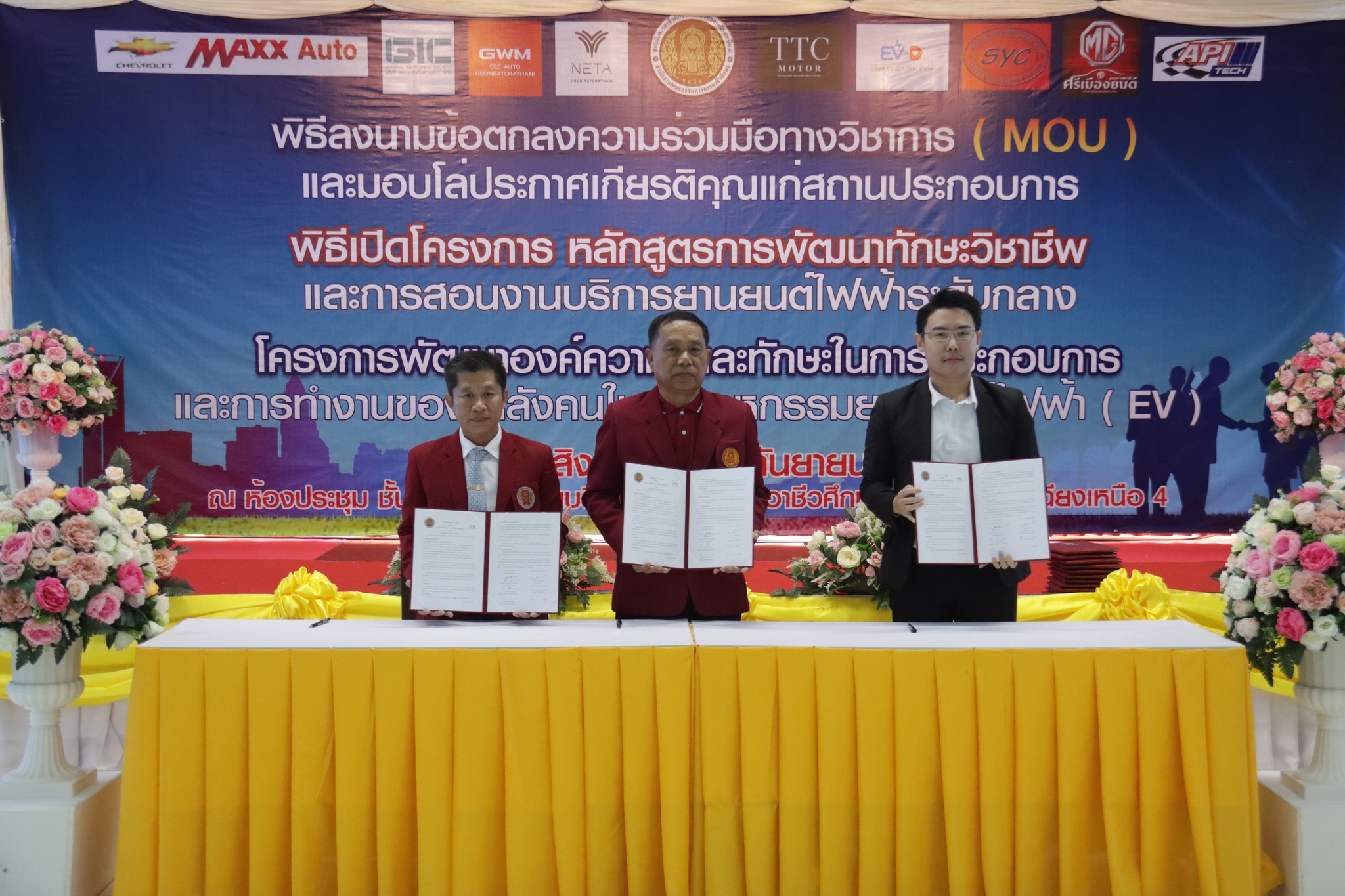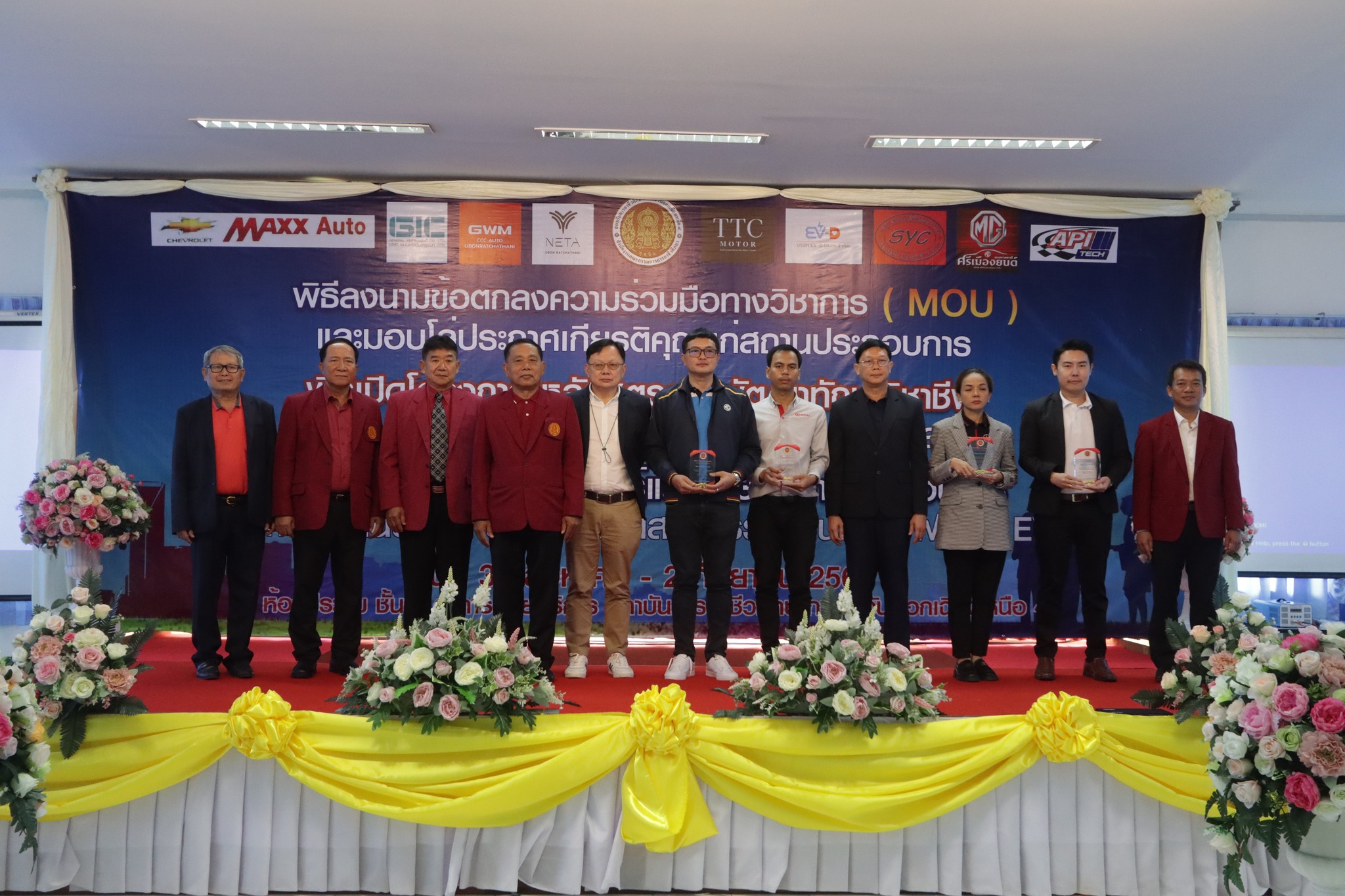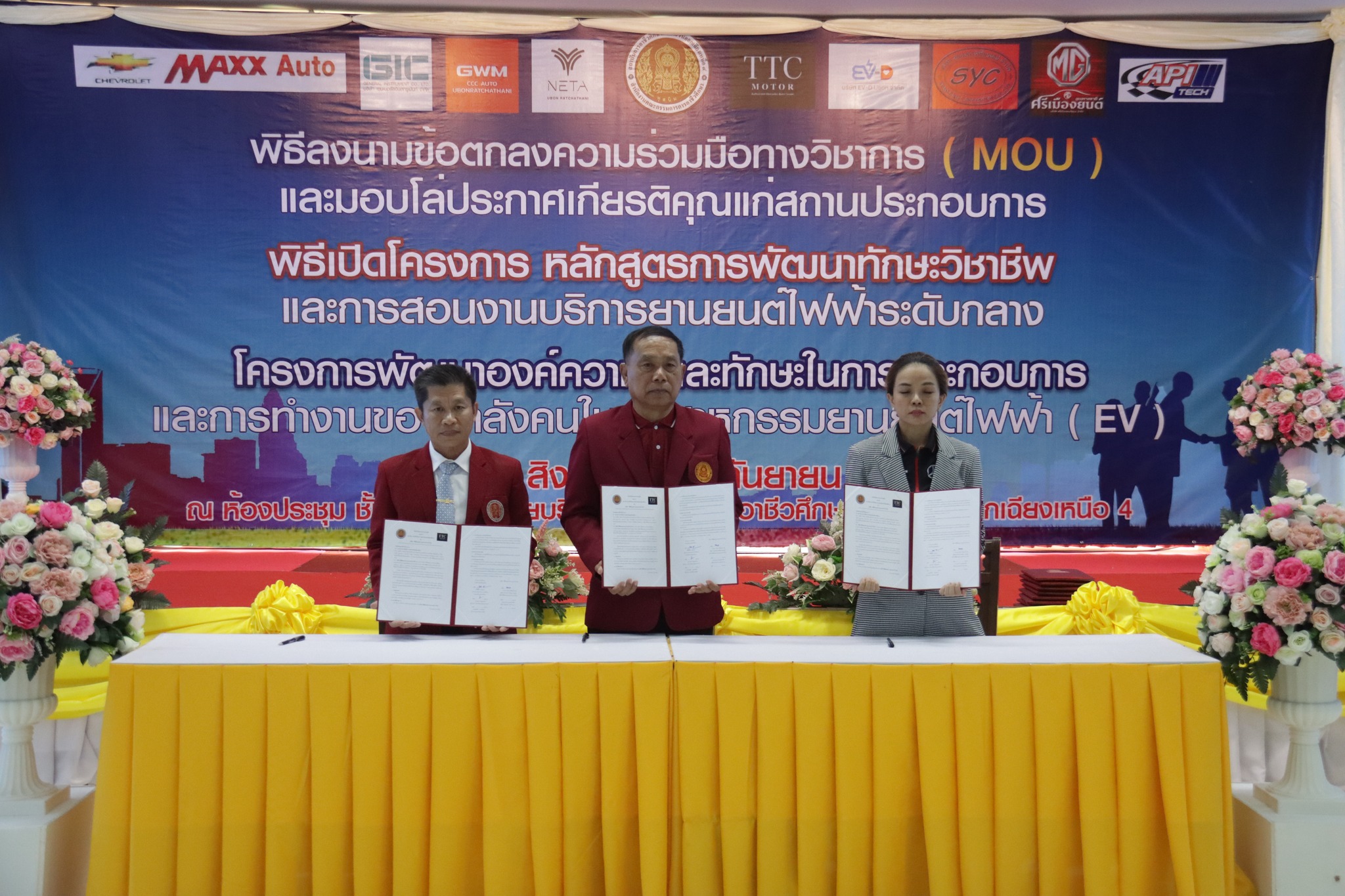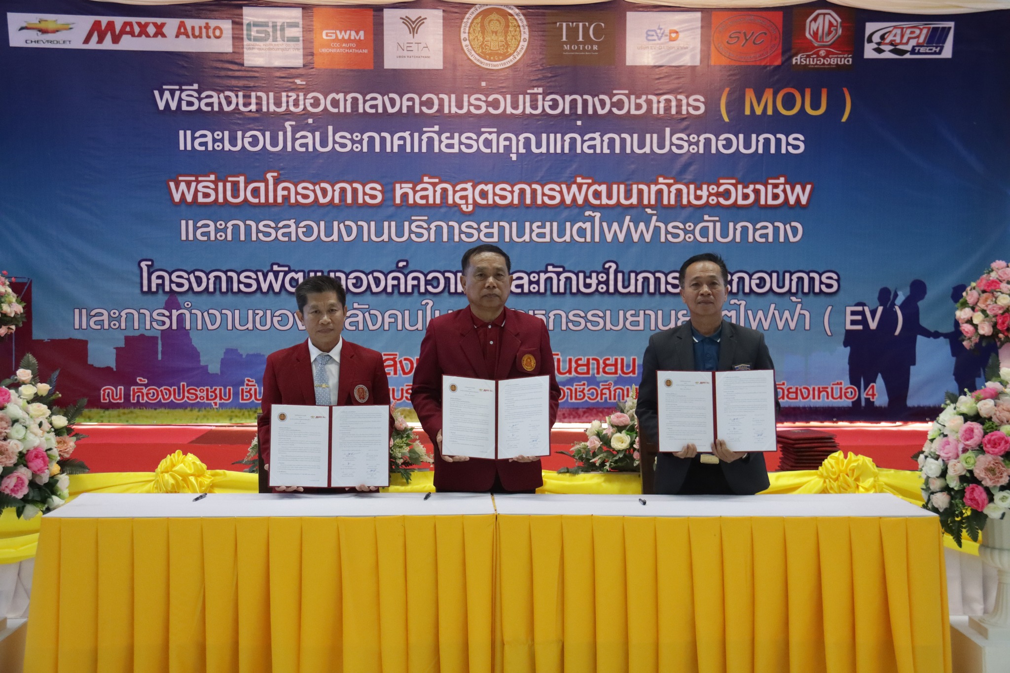 วันที่ ๑ กันยายน ๒๕๖๖ เวลา ๑๐.๐๐ น. นายลิขิต พลเหลา ผู้อำนวยการสถาบันการอาชีวศึกษาภาคตะวันออกเฉียงเหนือ ๔ ให้เกียรติเป็นประธานในพิธีลงนามข้อตกลงความร่วมมือทางวิชาการ (MOU) และมอบโล่ประกาศเกียรติคุณแก่สถานประกอบการ พิธีเปิดโครงการหลักสูตรการพัฒนาทักษะวิชาชีพและการสอนงานบริการยานยนต์ไฟฟ้าระดับกลาง และโครงการพัฒนาองค์ความรู้และทักษะในการประกอบการและการทำงานของกำลังคนในอุตสาหกรรมยานยนต์ไฟฟ้า (EV) ณ ห้องประชุมชั้น ๒ อาคารวิทยบริการ สถาบันการอาชีวศึกษาภาคตะวันออกเฉียงเหนือ ๔ ในการนี้ นายธาตรี พิบูลมณฑา ผู้อำนวยการวิทยาลัยเทคนิคอุบลราชธานี ปฏิบัติหน้าที่ ผู้อำนวยการสำนักงานอาชีวศึกษาจังหวัดอุบลราชธานี ให้เกียรติเข้าร่วมพิธีเปิด และร่วมลงนามข้อตกลงความร่วมมือทางวิชาการ (MOU) โดยมี สถานประกอบการทั้ง ๗ แห่ง ได้แก่ ๑.บริษัท วี กรุ๊ป เอ็น ที จำกัด ๒.บริษัท ศรีเมืองยนต์อุบล จำกัด ๓.บริษัท ซีซีซี ออโต้ จำกัด ๔.บริษัท ทีทีซี มอเตอร์ อุบลราชธานี จำกัด ๕.บริษัท EV – D อุบลราชธานี จำกัด ๖.Maxx Auto Chevrolet และ ๗.บริษัท สมยง คาร์เซ็นเตอร์ จำกัด เข้าร่วมพิธีลงนามในครั้งนี้ ทั้งนี้มีคณะผู้บริหาร ครู และบุคลากรทางการศึกษา ในสังกัดสถาบันการอาชีวศึกษาภาคตะวันออกเฉียงเหนือ ๔ เข้าร่วมพิธีอย่างพร้อมเพรียง