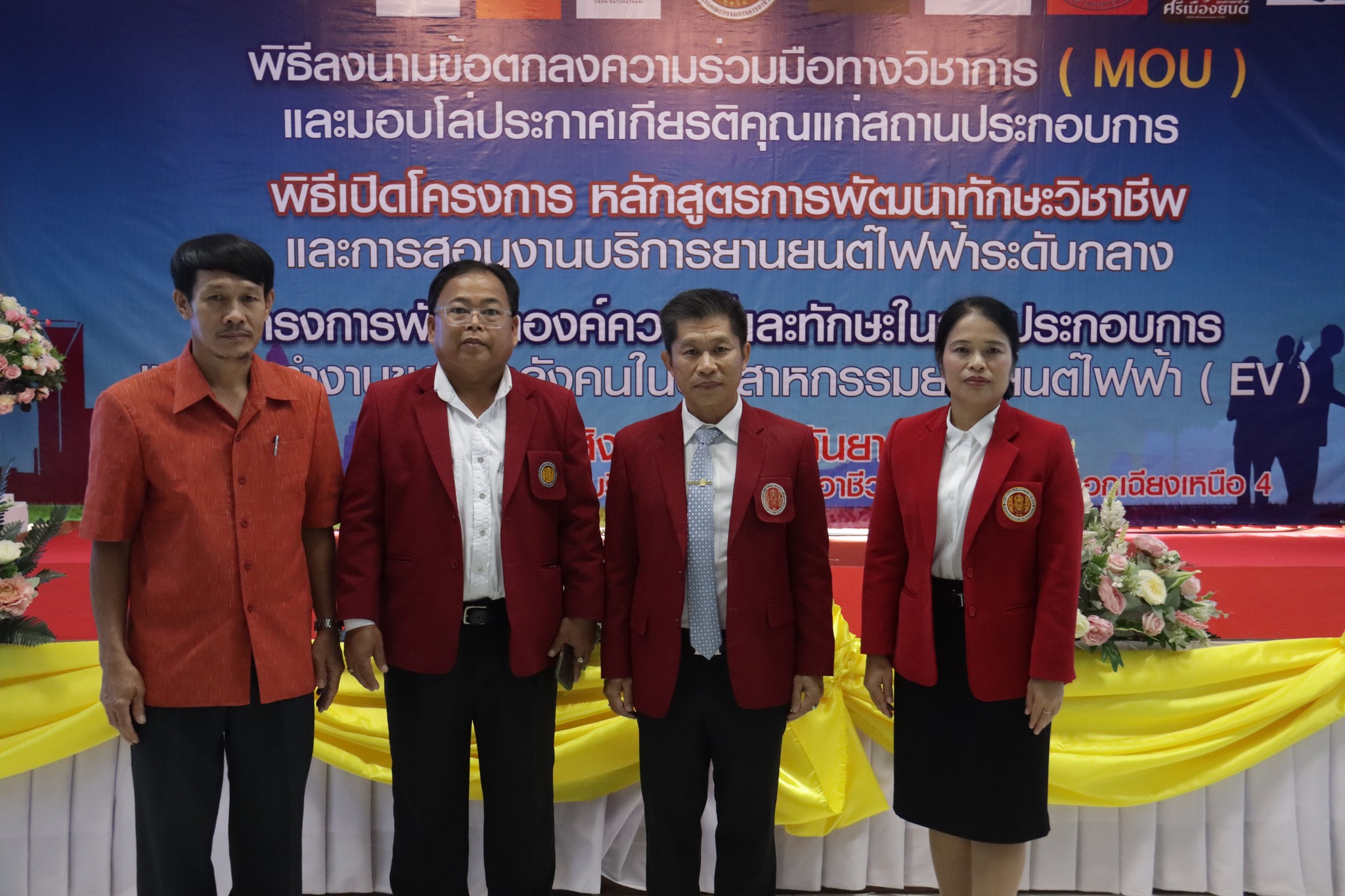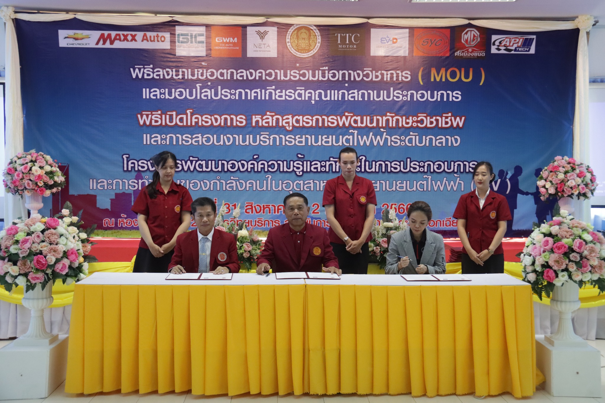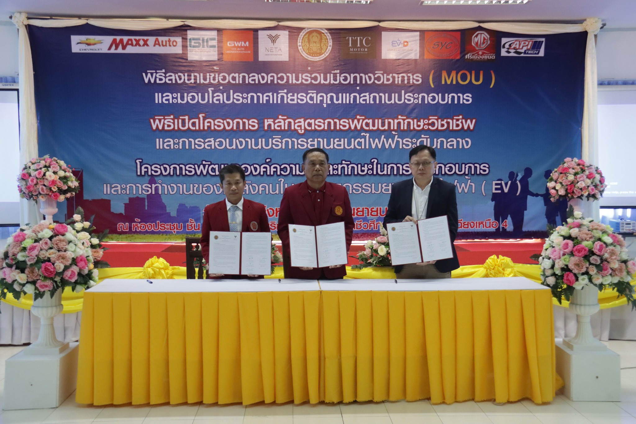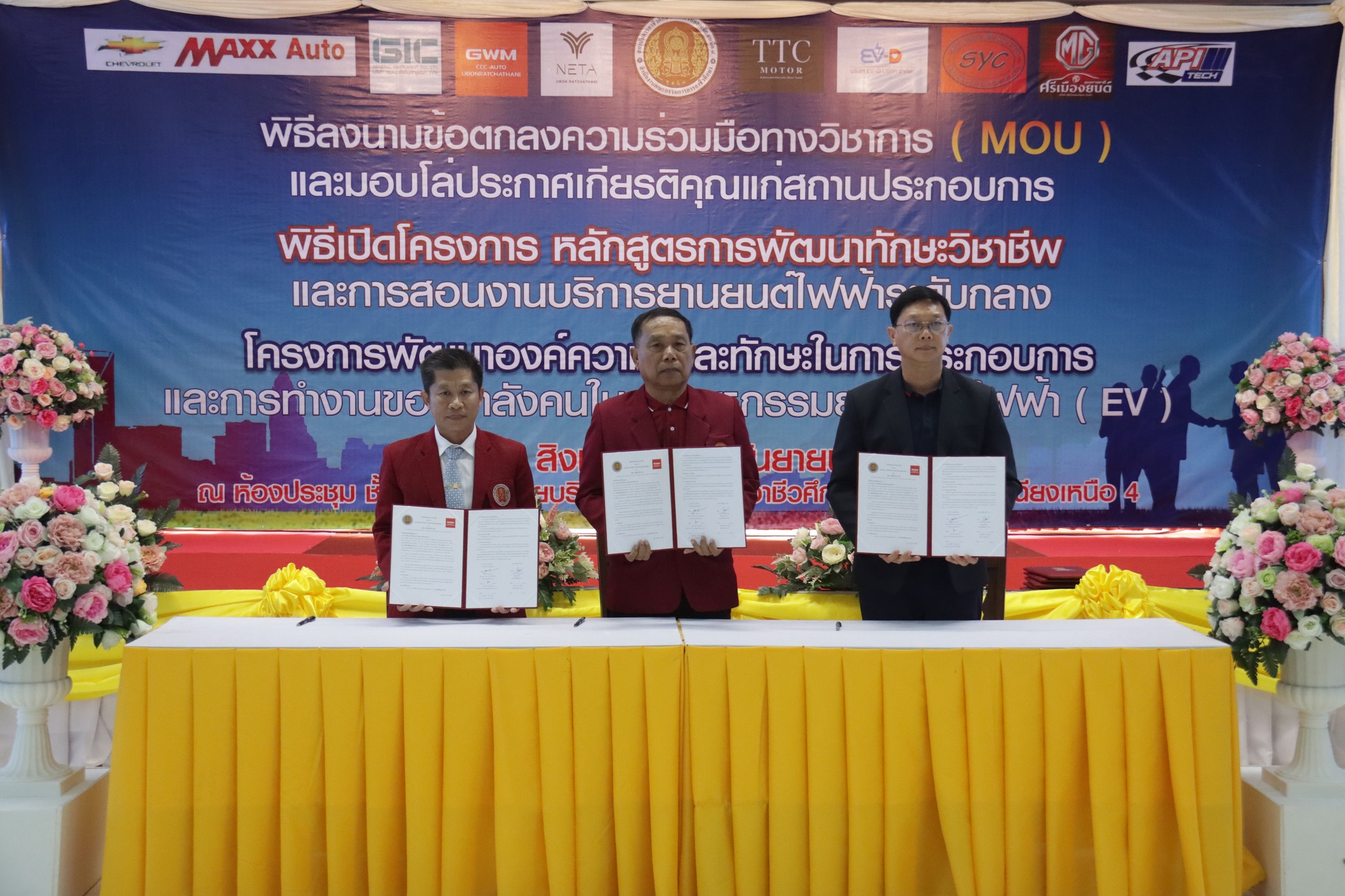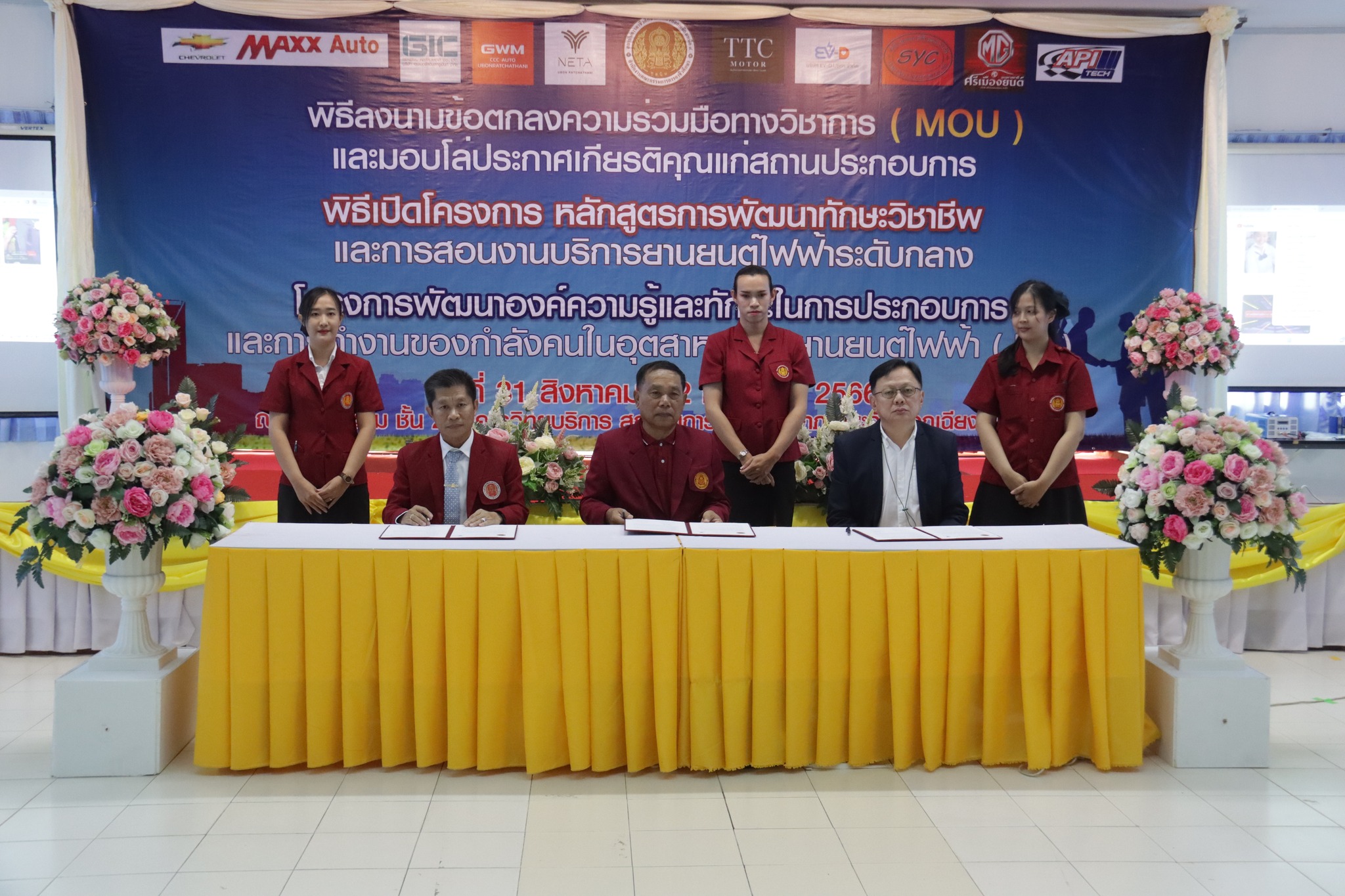 วันที่ ๑ กันยายน ๒๕๖๖ เวลา ๑๐.๐๐ น. นายลิขิต พลเหลา ผู้อำนวยการสถาบันการอาชีวศึกษาภาคตะวันออกเฉียงเหนือ ๔ ให้เกียรติเป็นประธานในพิธีลงนามข้อตกลงความร่วมมือทางวิชาการ (MOU) และมอบโล่ประกาศเกียรติคุณแก่สถานประกอบการ พิธีเปิดโครงการหลักสูตรการพัฒนาทักษะวิชาชีพและการสอนงานบริการยานยนต์ไฟฟ้าระดับกลาง และโครงการพัฒนาองค์ความรู้และทักษะในการประกอบการและการทำงานของกำลังคนในอุตสาหกรรมยานยนต์ไฟฟ้า (EV) ณ ห้องประชุมชั้น ๒ อาคารวิทยบริการ สถาบันการอาชีวศึกษาภาคตะวันออกเฉียงเหนือ ๔ ในการนี้ นายธาตรี พิบูลมณฑา ผู้อำนวยการวิทยาลัยเทคนิคอุบลราชธานี ปฏิบัติหน้าที่ ผู้อำนวยการสำนักงานอาชีวศึกษาจังหวัดอุบลราชธานี ให้เกียรติเข้าร่วมพิธีเปิด และร่วมลงนามข้อตกลงความร่วมมือทางวิชาการ (MOU) โดยมี สถานประกอบการทั้ง ๗ แห่ง ได้แก่ ๑.บริษัท วี กรุ๊ป เอ็น ที จำกัด ๒.บริษัท ศรีเมืองยนต์อุบล จำกัด ๓.บริษัท ซีซีซี ออโต้ จำกัด ๔.บริษัท ทีทีซี มอเตอร์ อุบลราชธานี จำกัด ๕.บริษัท EV – D อุบลราชธานี จำกัด ๖.Maxx Auto Chevrolet และ ๗.บริษัท สมยง คาร์เซ็นเตอร์ จำกัด เข้าร่วมพิธีลงนามในครั้งนี้ ทั้งนี้มีคณะผู้บริหาร ครู และบุคลากรทางการศึกษา ในสังกัดสถาบันการอาชีวศึกษาภาคตะวันออกเฉียงเหนือ ๔ เข้าร่วมพิธีอย่างพร้อมเพรียง