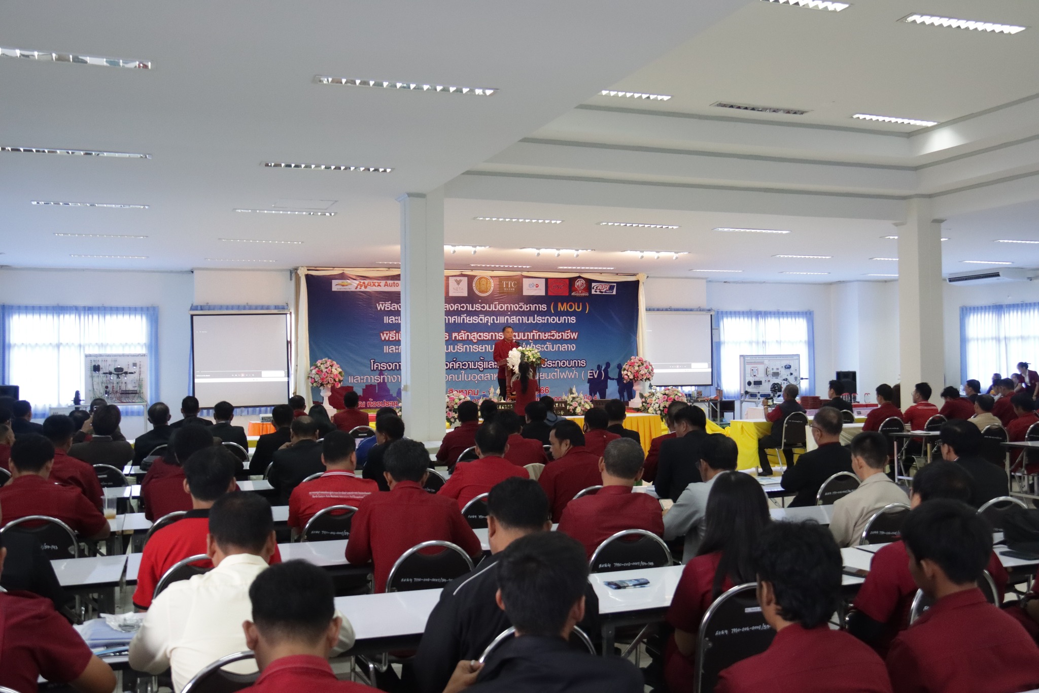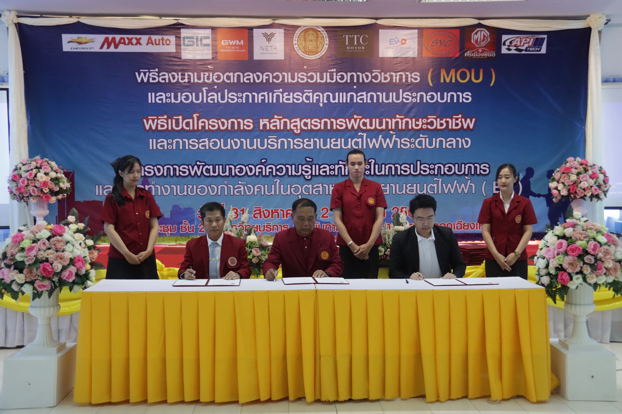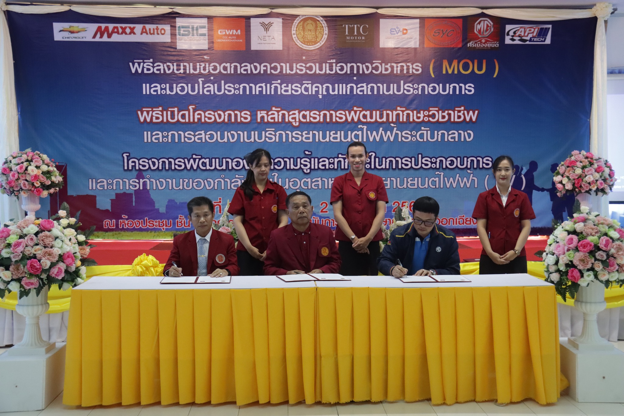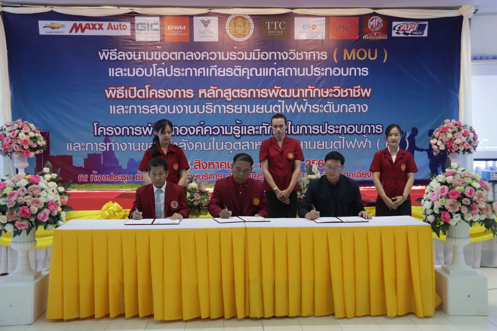 วันที่ ๑ กันยายน ๒๕๖๖ เวลา ๑๐.๐๐ น. นายลิขิต พลเหลา ผู้อำนวยการสถาบันการอาชีวศึกษาภาคตะวันออกเฉียงเหนือ ๔ ให้เกียรติเป็นประธานในพิธีลงนามข้อตกลงความร่วมมือทางวิชาการ (MOU) และมอบโล่ประกาศเกียรติคุณแก่สถานประกอบการ พิธีเปิดโครงการหลักสูตรการพัฒนาทักษะวิชาชีพและการสอนงานบริการยานยนต์ไฟฟ้าระดับกลาง และโครงการพัฒนาองค์ความรู้และทักษะในการประกอบการและการทำงานของกำลังคนในอุตสาหกรรมยานยนต์ไฟฟ้า (EV) ณ ห้องประชุมชั้น ๒ อาคารวิทยบริการ สถาบันการอาชีวศึกษาภาคตะวันออกเฉียงเหนือ ๔ ในการนี้ นายธาตรี พิบูลมณฑา ผู้อำนวยการวิทยาลัยเทคนิคอุบลราชธานี ปฏิบัติหน้าที่ ผู้อำนวยการสำนักงานอาชีวศึกษาจังหวัดอุบลราชธานี ให้เกียรติเข้าร่วมพิธีเปิด และร่วมลงนามข้อตกลงความร่วมมือทางวิชาการ (MOU) โดยมี สถานประกอบการทั้ง ๗ แห่ง ได้แก่ ๑.บริษัท วี กรุ๊ป เอ็น ที จำกัด ๒.บริษัท ศรีเมืองยนต์อุบล จำกัด ๓.บริษัท ซีซีซี ออโต้ จำกัด ๔.บริษัท ทีทีซี มอเตอร์ อุบลราชธานี จำกัด ๕.บริษัท EV – D อุบลราชธานี จำกัด ๖.Maxx Auto Chevrolet และ ๗.บริษัท สมยง คาร์เซ็นเตอร์ จำกัด เข้าร่วมพิธีลงนามในครั้งนี้ ทั้งนี้มีคณะผู้บริหาร ครู และบุคลากรทางการศึกษา ในสังกัดสถาบันการอาชีวศึกษาภาคตะวันออกเฉียงเหนือ ๔ เข้าร่วมพิธีอย่างพร้อมเพรียง