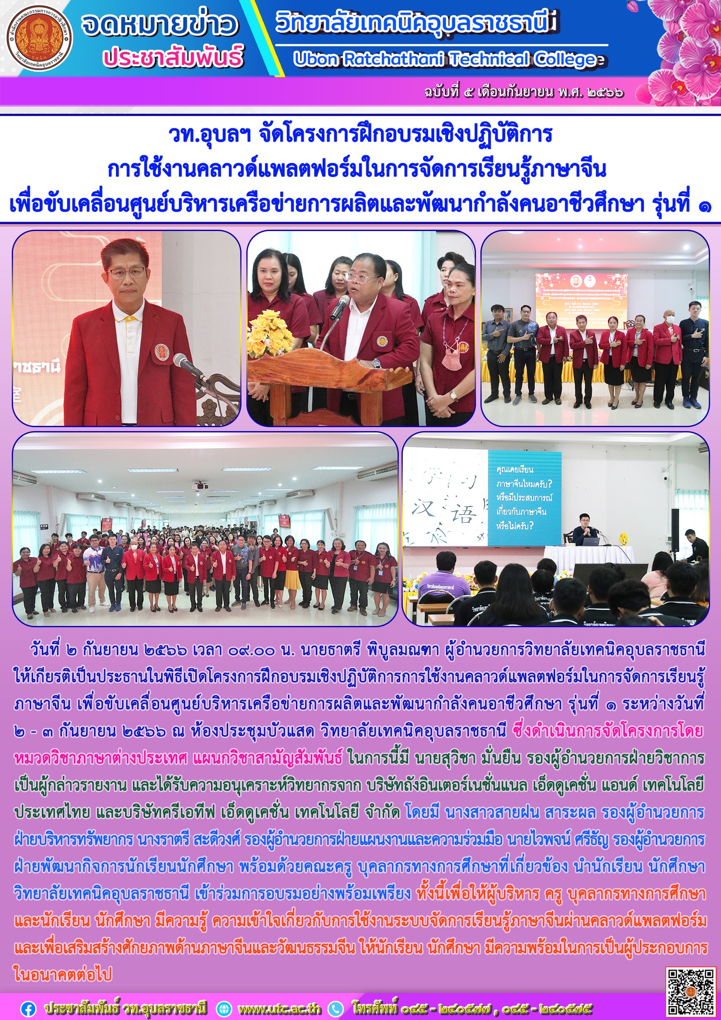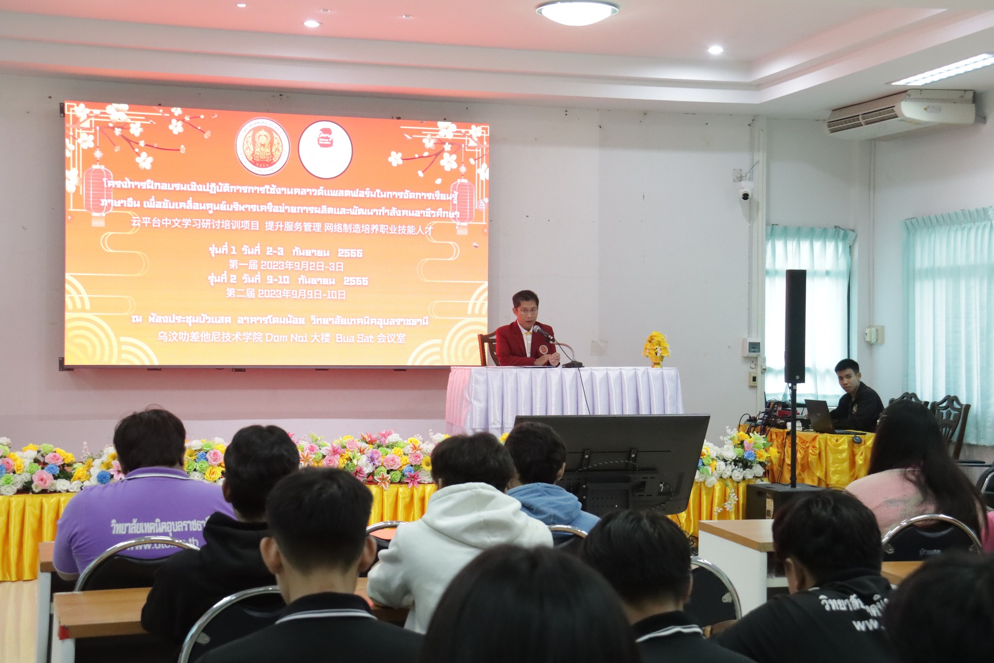 วันที่ ๒ กันยายน ๒๕๖๖เวลา ๐๙.๐๐ น. นายธาตรี พิบูลมณฑา ผู้อำนวยการวิทยาลัยเทคนิคอุบลราชธานี ให้เกียรติเป็นประธานในพิธีเปิดโครงการฝึกอบรมเชิงปฏิบัติการการใช้งานคลาวด์แพลตฟอร์มในการจัดการเรียนรู้ภาษาจีน เพื่อขับเคลื่อนศูนย์บริหารเครือข่ายการผลิตและพัฒนากำลังคนอาชีวศึกษา รุ่นที่ ๑ ระหว่างวันที่ ๒ – ๓ กันยายน ๒๕๖๖ ณ ห้องประชุมบัวแสด วิทยาลัยเทคนิคอุบลราชธานี ซึ่งดำเนินการจัดโครงการโดย หมวดวิชาภาษาต่างประเทศ แผนกวิชาสามัญสัมพันธ์ ในการนี้มี นายสุวิชา มั่นยืน รองผู้อำนวยการฝ่ายวิชาการ เป็นผู้กล่าวรายงาน และได้รับความอนุเคราะห์วิทยากรจาก บริษัทถังอินเตอร์เนชั่นแนล เอ็ดดูเคชั่น แอนด์ เทคโนโลยี ประเทศไทย และบริษัทครีเอทีฟ เอ็ดดูเคชั่น เทคโนโลยี จำกัด โดยมี นางสาวสายฝน สาระผล รองผู้อำนวยการฝ่ายบริหารทรัพยากร นางราตรี สะดีวงศ์ รองผู้อำนวยการฝ่ายแผนงานและความร่วมมือ นายไวพจน์ ศรีธัญ รองผู้อำนวยการฝ่ายพัฒนากิจการนักเรียนนักศึกษา พร้อมด้วยคณะครู บุคลากรทางการศึกษาที่เกี่ยวข้อง นำนักเรียน นักศึกษา วิทยาลัยเทคนิคอุบลราชธานี เข้าร่วมการอบรมอย่างพร้อมเพรียง ทั้งนี้เพื่อให้ผู้บริหาร ครู บุคลากรทางการศึกษา และนักเรียน นักศึกษา มีความรู้ ความเข้าใจเกี่ยวกับการใช้งานระบบจัดการเรียนรู้ภาษาจีนผ่านคลาวด์แพลตฟอร์ม และเพื่อเสริมสร้างศักยภาพด้านภาษาจีนและวัฒนธรรมจีน ให้นักเรียน นักศึกษา มีความพร้อมในการเป็นผู้ประกอบการในอนาคตต่อไป