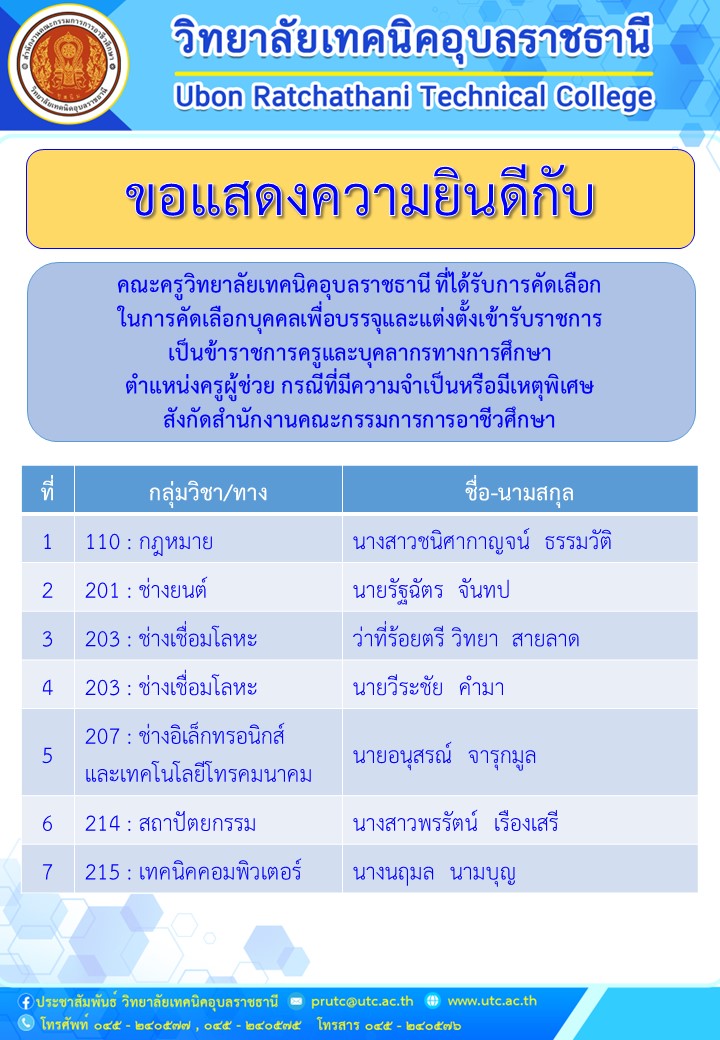 ขอแสดงความยินดีกับคณะครู วิทยาลัยเทคนิคอุบลราชธานี ที่ได้รับการคัดเลือกในการคัดเลือกบุคคล เพื่อบรรจุและแต่งตั้งเข้ารับราชการเป็นข้าราชการครูและบุคลากรทางการศึกษา