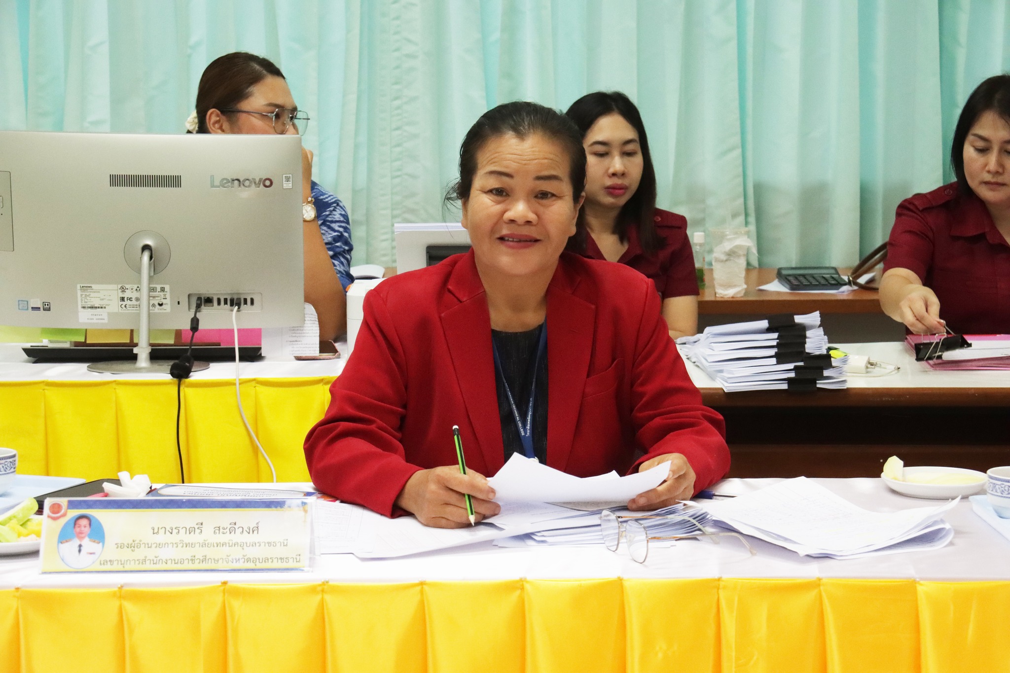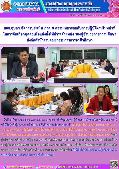 วันที่ ๖ กันยายน ๒๕๖๖ เวลา ๑๓.๐๐ น. นายธาตรี พิบูลมณฑาผู้อำนวยการวิทยาลัยเทคนิคอุบลราชธานี ปฏิบัติหน้าที่ ผู้อำนวยการสำนักงานอาชีวศึกษาจังหวัดอุบลราชธานี ให้เกียรติเป็นประธานในการประเมิน ภาค ข ความเหมาะสมกับการปฏิบัติงานในหน้าที่ ในการคัดเลือกบุคคลเพื่อแต่งตั้งให้ดำรงตำแหน่ง รองผู้อำนวยการสถานศึกษา สังกัดสำนักงานคณะกรรมการการอาชีวศึกษา ณ ห้องประชุมบัวแดง วิทยาลัยเทคนิคอุบลราชธานี โดยมี ผู้บริหารสถานศึกษาภาครัฐ ทั้ง ๙ แห่ง เข้าร่วมเป็นคณะกรรมการในการประเมิน และมี นางราตรี สะดีวงศ์ รองผู้อำนวยการฝ่ายแผนงานและความร่วมมือ เลขานุการสำนักงานอาชีวศึกษาจังหวัดอุบลราชธานี พร้อมด้วยบุคลาทางการศึกษาที่เกี่ยวข้อง เข้าร่วมการประเมินอย่างพร้อมเพรียง ทั้งนี้เพื่อให้เป็นไปตามแนวปฏิบัติและระเบียบของสำนักงานคณะกรรมการการอาชีวศึกษาต่อไป