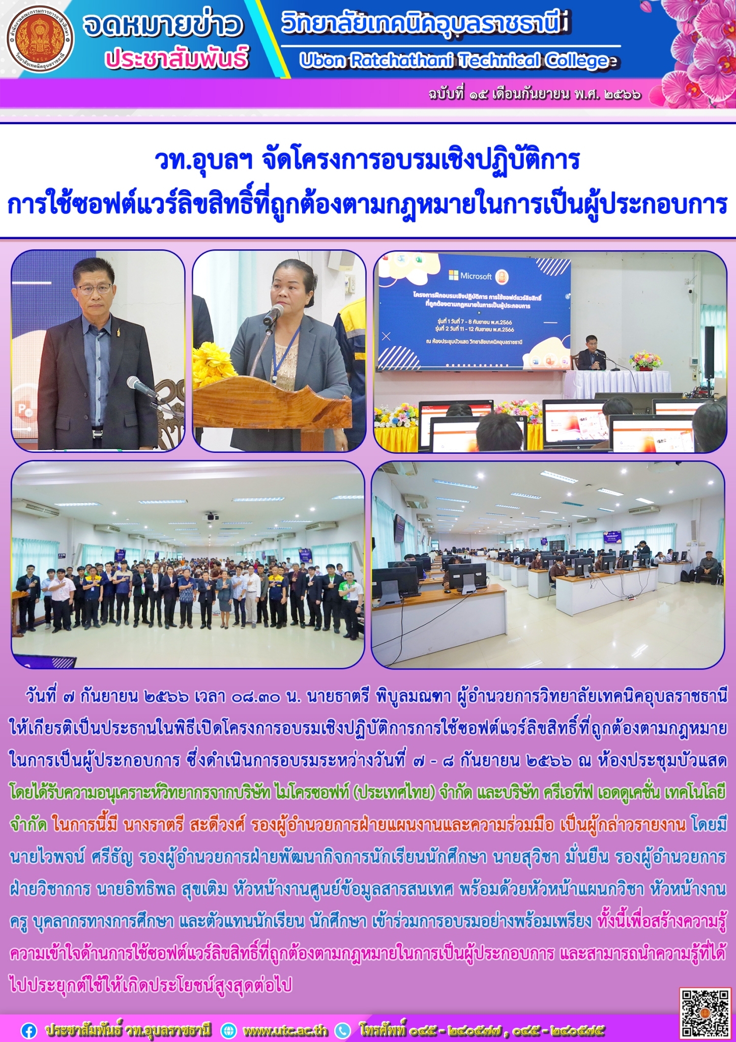 วันที่ ๗ กันยายน ๒๕๖๖ เวลา ๐๘.๓๐ น. นายธาตรี พิบูลมณฑา ผู้อำนวยการวิทยาลัยเทคนิคอุบลราชธานี ให้เกียรติเป็นประธานในพิธีเปิดโครงการอบรมเชิงปฏิบัติการการใช้ซอฟต์แวร์ลิขสิทธิ์ที่ถูกต้องตามกฎหมายในการเป็นผู้ประกอบการ ซึ่งดำเนินการอบรมระหว่างวันที่ ๗ – ๘ กันยายน ๒๕๖๖ ณ ห้องประชุมบัวแสด โดยได้รับความอนุเคราะห์วิทยากรจากบริษัท ไมโครซอฟท์ (ประเทศไทย) จำกัด และบริษัท ครีเอทีฟ เอดดูเคชั่น เทคโนโลยี จำกัด ในการนี้มี นางราตรี สะดีวงศ์ รองผู้อำนวยการฝ่ายแผนงานและความร่วมมือ เป็นผู้กล่าวรายงาน โดยมี นายไวพจน์ ศรีธัญ รองผู้อำนวยการฝ่ายพัฒนากิจการนักเรียนนักศึกษา นายสุวิชา มั่นยืน รองผู้อำนวยการฝ่ายวิชาการ นายอิทธิพล สุขเติม หัวหน้างานศูนย์ข้อมูลสารสนเทศ พร้อมด้วยหัวหน้าแผนกวิชา หัวหน้างาน ครู บุคลากรทางการศึกษา และตัวแทนนักเรียน นักศึกษา เข้าร่วมการอบรมอย่างพร้อมเพรียง ทั้งนี้เพื่อสร้างความรู้ ความเข้าใจด้านการใช้ซอฟต์แวร์ลิขสิทธิ์ที่ถูกต้องตามกฎหมายในการเป็นผู้ประกอบการ และสามารถนำความรู้ที่ได้ไปประยุกต์ใช้ให้เกิดประโยชน์สูงสุดต่อไป