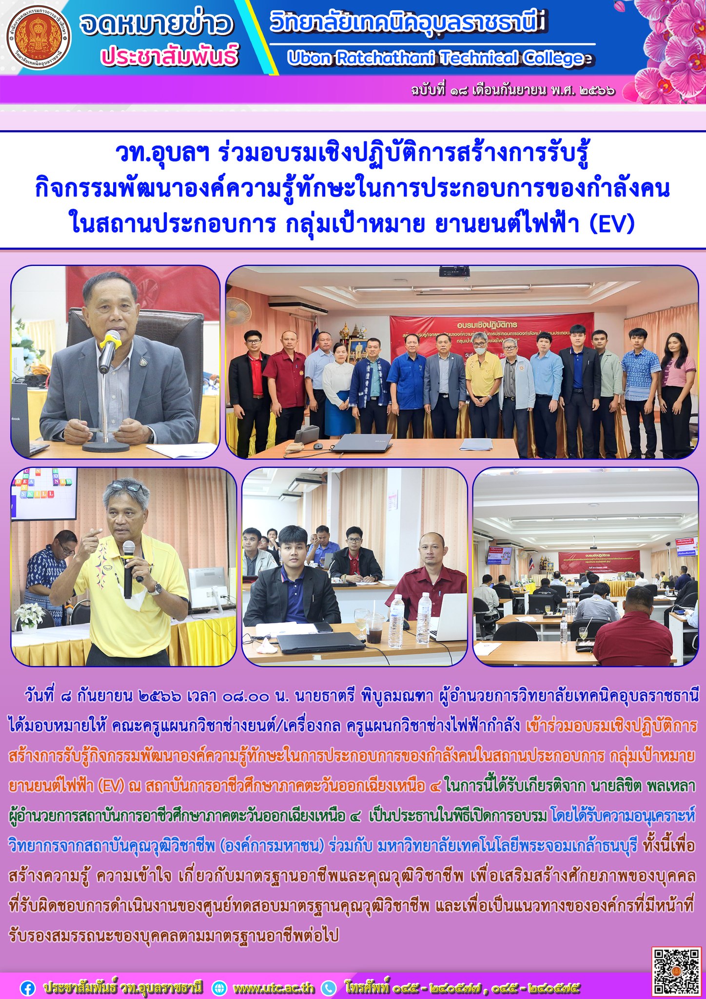 วันที่ ๘ กันยายน ๒๕๖๖ เวลา ๐๘.๐๐ น. นายธาตรี พิบูลมณฑา ผู้อำนวยการวิทยาลัยเทคนิคอุบลราชธานี ได้มอบหมายให้ คณะครูแผนกวิชาช่างยนต์/เครื่องกล ครูแผนกวิชาช่างไฟฟ้ากำลัง เข้าร่วมอบรมเชิงปฏิบัติการสร้างการรับรู้กิจกรรมพัฒนาองค์ความรู้ทักษะในการประกอบการของกำลังคนในสถานประกอบการ กลุ่มเป้าหมาย ยานยนต์ไฟฟ้า (EV) ณ สถาบันการอาชีวศึกษาภาคตะวันออกเฉียงเหนือ ๔ ในการนี้ได้รับเกียรติจาก นายลิขิต พลเหลา ผู้อำนวยการสถาบันการอาชีวศึกษาภาคตะวันออกเฉียงเหนือ ๔ เป็นประธานในพิธีเปิดการอบรม โดยได้รับความอนุเคราะห์วิทยากรจากสถาบันคุณวุฒิวิชาชีพ (องค์การมหาชน) ร่วมกับ มหาวิทยาลัยเทคโนโลยีพระจอมเกล้าธนบุรี ทั้งนี้เพื่อสร้างความรู้ ความเข้าใจ เกี่ยวกับมาตรฐานอาชีพและคุณวุฒิวิชาชีพ เพื่อเสริมสร้างศักยภาพของบุคคลที่รับผิดชอบการดำเนินงานของศูนย์ทดสอบมาตรฐานคุณวุฒิวิชาชีพ และเพื่อเป็นแนวทางขององค์กรที่มีหน้าที่รับรองสมรรถนะของบุคคลตามมาตรฐานอาชีพต่อไป