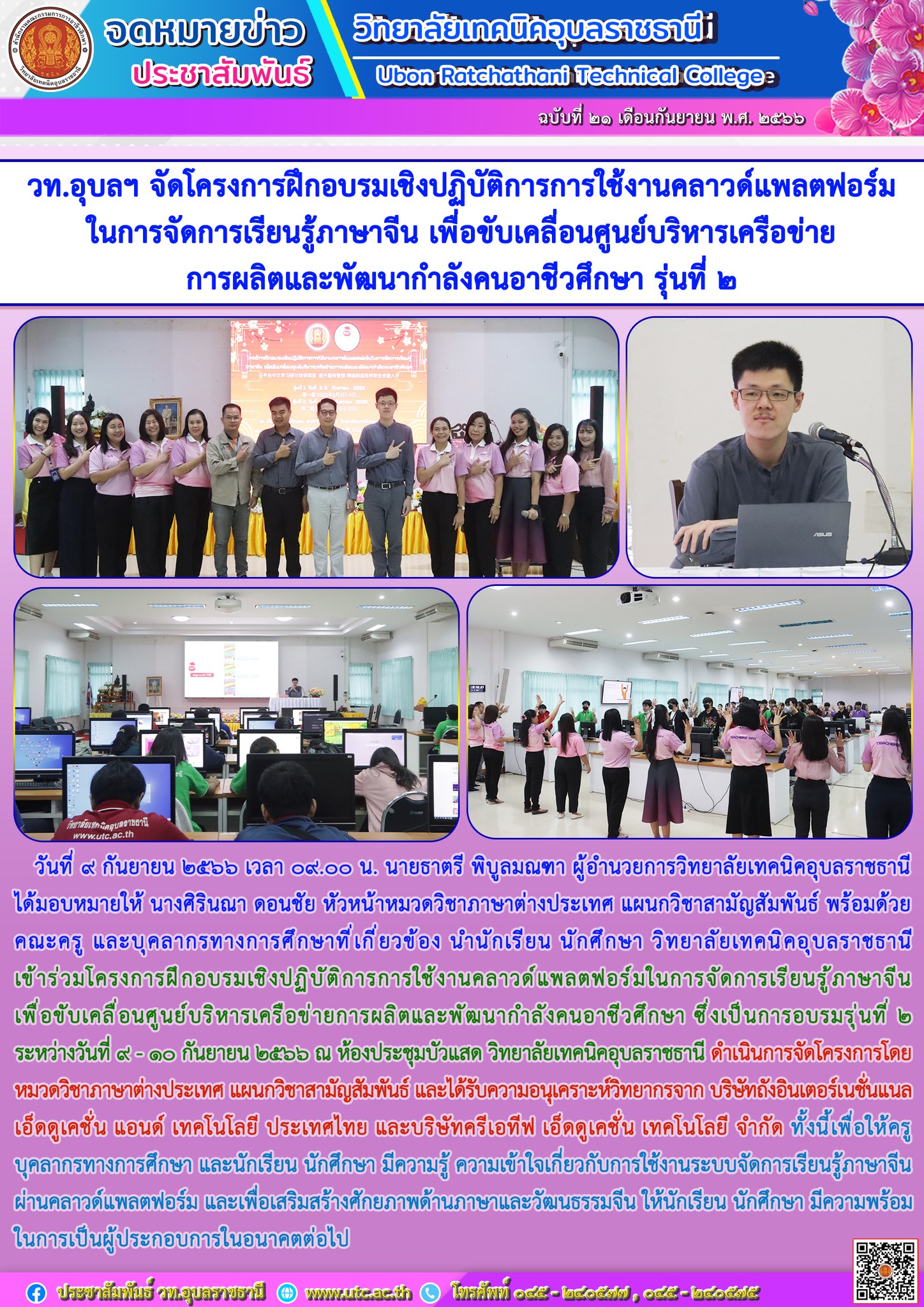 วันที่ ๙ กันยายน ๒๕๖๖ เวลา ๐๙.๐๐ น. นายธาตรี พิบูลมณฑา ผู้อำนวยการวิทยาลัยเทคนิคอุบลราชธานี ได้มอบหมายให้ นางศิรินณา ดอนชัยหัวหน้าหมวดวิชาภาษาต่างประเทศ แผนกวิชาสามัญสัมพันธ์ พร้อมด้วยคณะครู และบุคลากรทางการศึกษาที่เกี่ยวข้อง นำนักเรียน นักศึกษา วิทยาลัยเทคนิคอุบลราชธานี เข้าร่วมโครงการฝึกอบรมเชิงปฏิบัติการการใช้งานคลาวด์แพลตฟอร์มในการจัดการเรียนรู้ภาษาจีน เพื่อขับเคลื่อนศูนย์บริหารเครือข่ายการผลิตและพัฒนากำลังคนอาชีวศึกษา ซึ่งเป็นการอบรมรุ่นที่ ๒ ระหว่างวันที่ ๙ – ๑๐ กันยายน ๒๕๖๖ ณ ห้องประชุมบัวแสด วิทยาลัยเทคนิคอุบลราชธานี ดำเนินการจัดโครงการโดย หมวดวิชาภาษาต่างประเทศ แผนกวิชาสามัญสัมพันธ์ และได้รับความอนุเคราะห์วิทยากรจาก บริษัทถังอินเตอร์เนชั่นแนล เอ็ดดูเคชั่น แอนด์ เทคโนโลยี ประเทศไทย และบริษัทครีเอทีฟ เอ็ดดูเคชั่น เทคโนโลยี จำกัด ทั้งนี้เพื่อให้ครู บุคลากรทางการศึกษา และนักเรียน นักศึกษา มีความรู้ ความเข้าใจเกี่ยวกับการใช้งานระบบจัดการเรียนรู้ภาษาจีนผ่านคลาวด์แพลตฟอร์ม และเพื่อเสริมสร้างศักยภาพด้านภาษาและวัฒนธรรมจีน ให้นักเรียน นักศึกษา มีความพร้อมในการเป็นผู้ประกอบการในอนาคตต่อไป