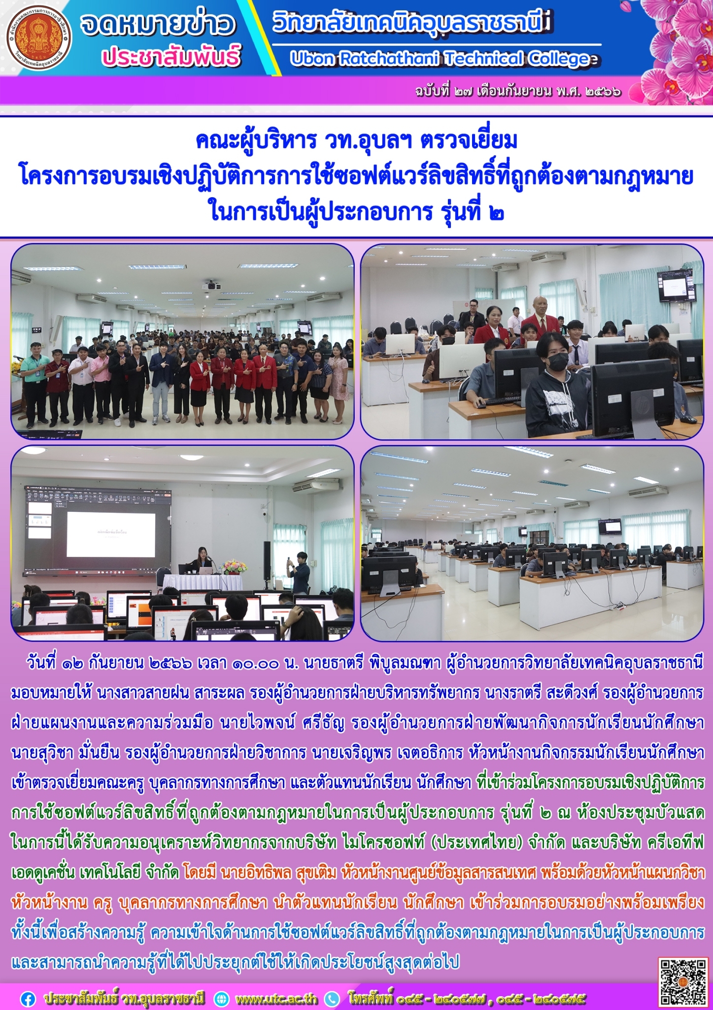 วันที่ ๑๒ กันยายน ๒๕๖๖ เวลา ๑๐.๐๐ น. นายธาตรี พิบูลมณฑา ผู้อำนวยการวิทยาลัยเทคนิคอุบลราชธานี มอบหมายให้ นางสาวสายฝน สาระผล รองผู้อำนวยการฝ่ายบริหารทรัพยากร นางราตรี สะดีวงศ์ รองผู้อำนวยการฝ่ายแผนงานและความร่วมมือ นายไวพจน์ ศรีธัญ รองผู้อำนวยการฝ่ายพัฒนากิจการนักเรียนนักศึกษา นายสุวิชา มั่นยืน รองผู้อำนวยการฝ่ายวิชาการ นายเจริญพร เจตอธิการ หัวหน้างานกิจกรรมนักเรียนนักศึกษา เข้าตรวจเยี่ยมคณะครู บุคลากรทางการศึกษา และตัวแทนนักเรียน นักศึกษา ที่เข้าร่วมโครงการอบรมเชิงปฏิบัติการการใช้ซอฟต์แวร์ลิขสิทธิ์ที่ถูกต้องตามกฎหมายในการเป็นผู้ประกอบการ รุ่นที่ ๒ ณ ห้องประชุมบัวแสด ในการนี้ได้รับความอนุเคราะห์วิทยากรจากบริษัท ไมโครซอฟท์ (ประเทศไทย) จำกัด และบริษัท ครีเอทีฟ เอดดูเคชั่น เทคโนโลยี จำกัด โดยมี นายอิทธิพล สุขเติม หัวหน้างานศูนย์ข้อมูลสารสนเทศ พร้อมด้วยหัวหน้าแผนกวิชา หัวหน้างาน ครู บุคลากรทางการศึกษา นำตัวแทนนักเรียน นักศึกษา เข้าร่วมการอบรมอย่างพร้อมเพรียง ทั้งนี้เพื่อสร้างความรู้ ความเข้าใจด้านการใช้ซอฟต์แวร์ลิขสิทธิ์ที่ถูกต้องตามกฎหมายในการเป็นผู้ประกอบการ และสามารถนำความรู้ที่ได้ไปประยุกต์ใช้ให้เกิดประโยชน์สูงสุดต่อไป