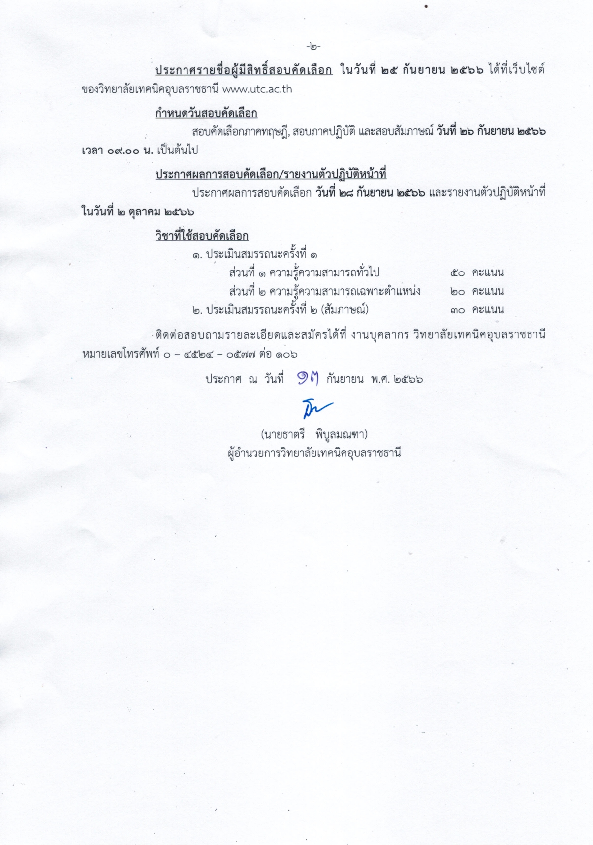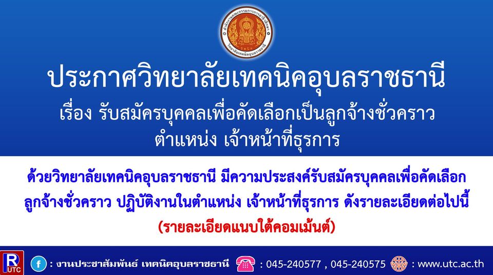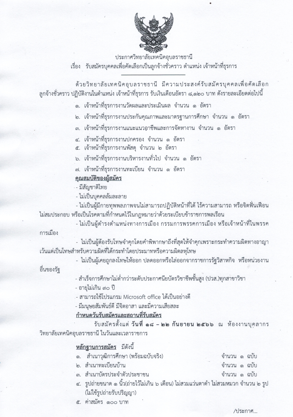 ด้วยวิทยาลัยเทคนิคอุบลราชธานี มีความประสงค์รับสมัครบุคคลเพื่อคัดเลือก ลูกจ้างชั่วคราว ปฏิบัติงานในตำแหน่ง เจ้าหน้าที่ธุรการ ดังรายละเอียดต่อไปนี้ (รายละเอียดแนบใต้คอมเม้นต์)