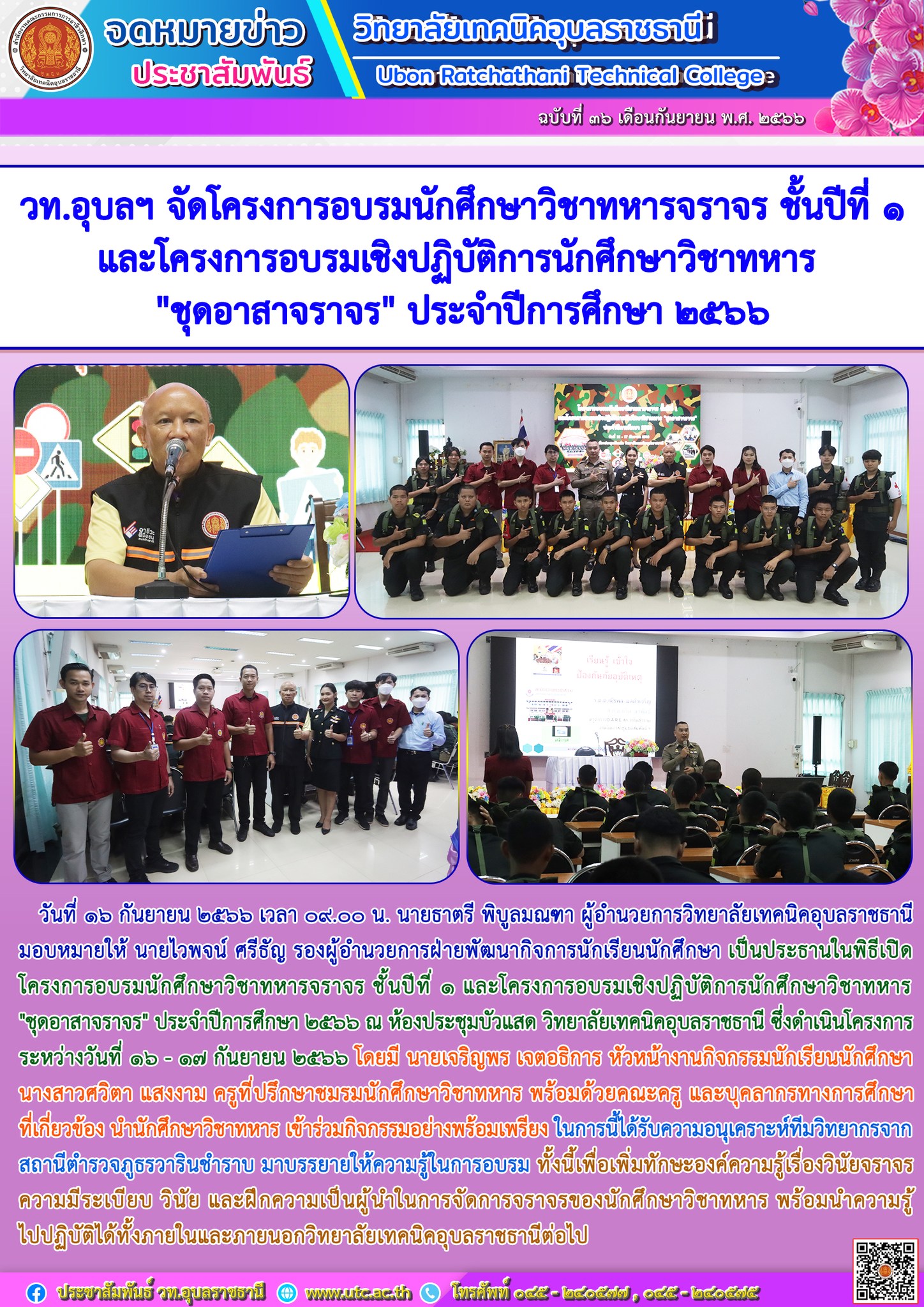 วท.อุบลฯ จัดโครงการอบรมนักศึกษาวิชาทหารจราจร ชั้นปีที่ ๑ และโครงการอบรมเชิงปฏิบัติการนักศึกษาวิชาทหาร “ชุดอาสาจราจร” ประจำปีการศึกษา ๒๕๖๖