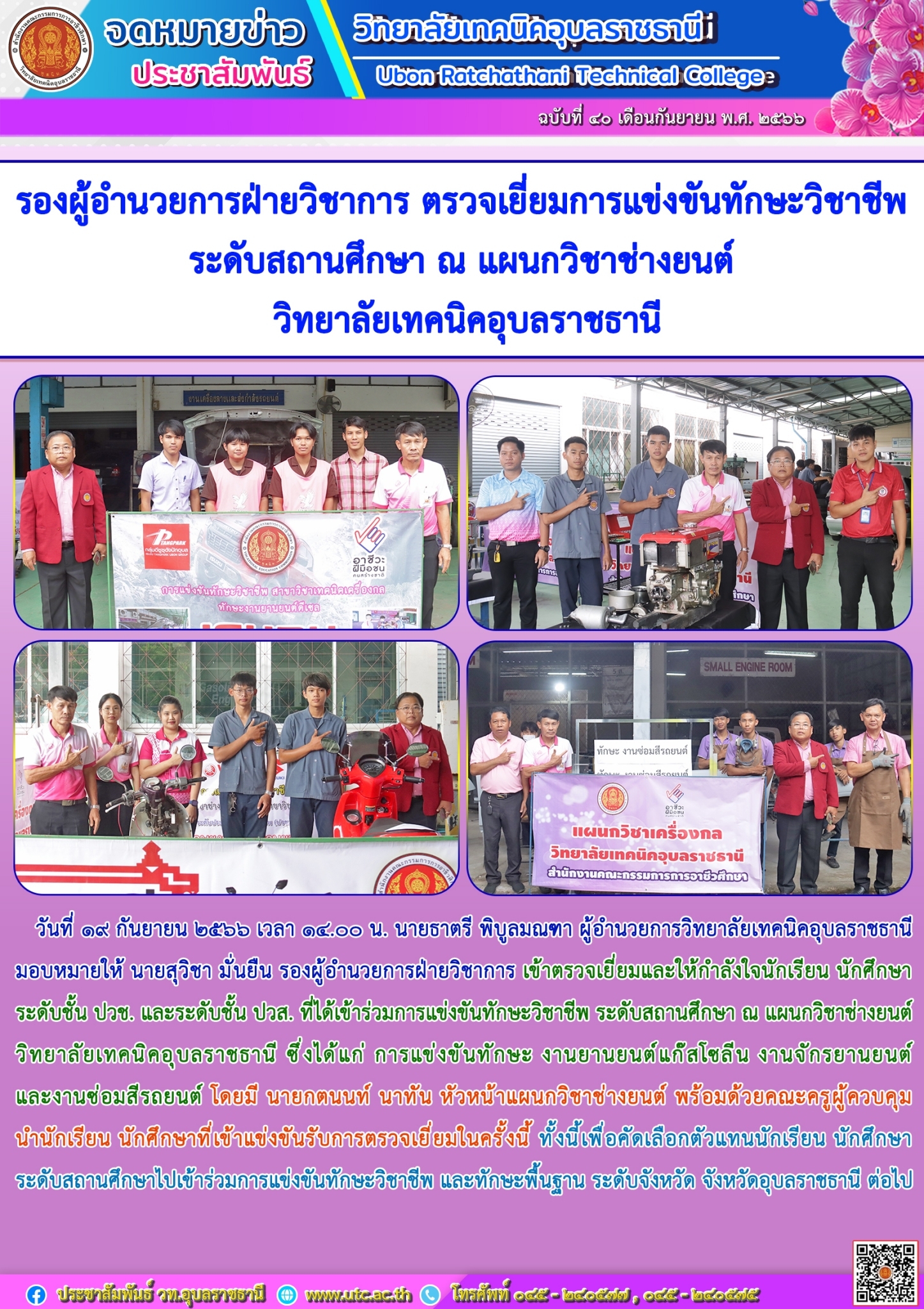 วันที่ ๑๙ กันยายน ๒๕๖๖ เวลา ๑๔.๐๐ น. นายธาตรี พิบูลมณฑา ผู้อำนวยการวิทยาลัยเทคนิคอุบลราชธานี มอบหมายให้ นายสุวิชา มั่นยืน รองผู้อำนวยการฝ่ายวิชาการ เข้าตรวจเยี่ยมและให้กำลังใจนักเรียน นักศึกษาระดับชั้น ปวช. และระดับชั้น ปวส. ที่ได้เข้าร่วมการแข่งขันทักษะวิชาชีพ ระดับสถานศึกษา ณ แผนกวิชาช่างยนต์ วิทยาลัยเทคนิคอุบลราชธานี ซึ่งได้แก่ การแข่งขันทักษะ งานยานยนต์แก๊สโซลีน งานจักรยานยนต์ และงานซ่อมสีรถยนต์ โดยมี นายกตนนท์ นาทัน หัวหน้าแผนกวิชาช่างยนต์ พร้อมด้วยคณะครูผู้ควบคุม นำนักเรียน นักศึกษาที่เข้าแข่งขันรับการตรวจเยี่ยมในครั้งนี้ ทั้งนี้เพื่อคัดเลือกตัวแทนนักเรียน นักศึกษา ระดับสถานศึกษา ไปเข้าร่วมการแข่งขันทักษะวิชาชีพ และทักษะพื้นฐาน ระดับจังหวัด จังหวัดอุบลราชธานี ต่อไป