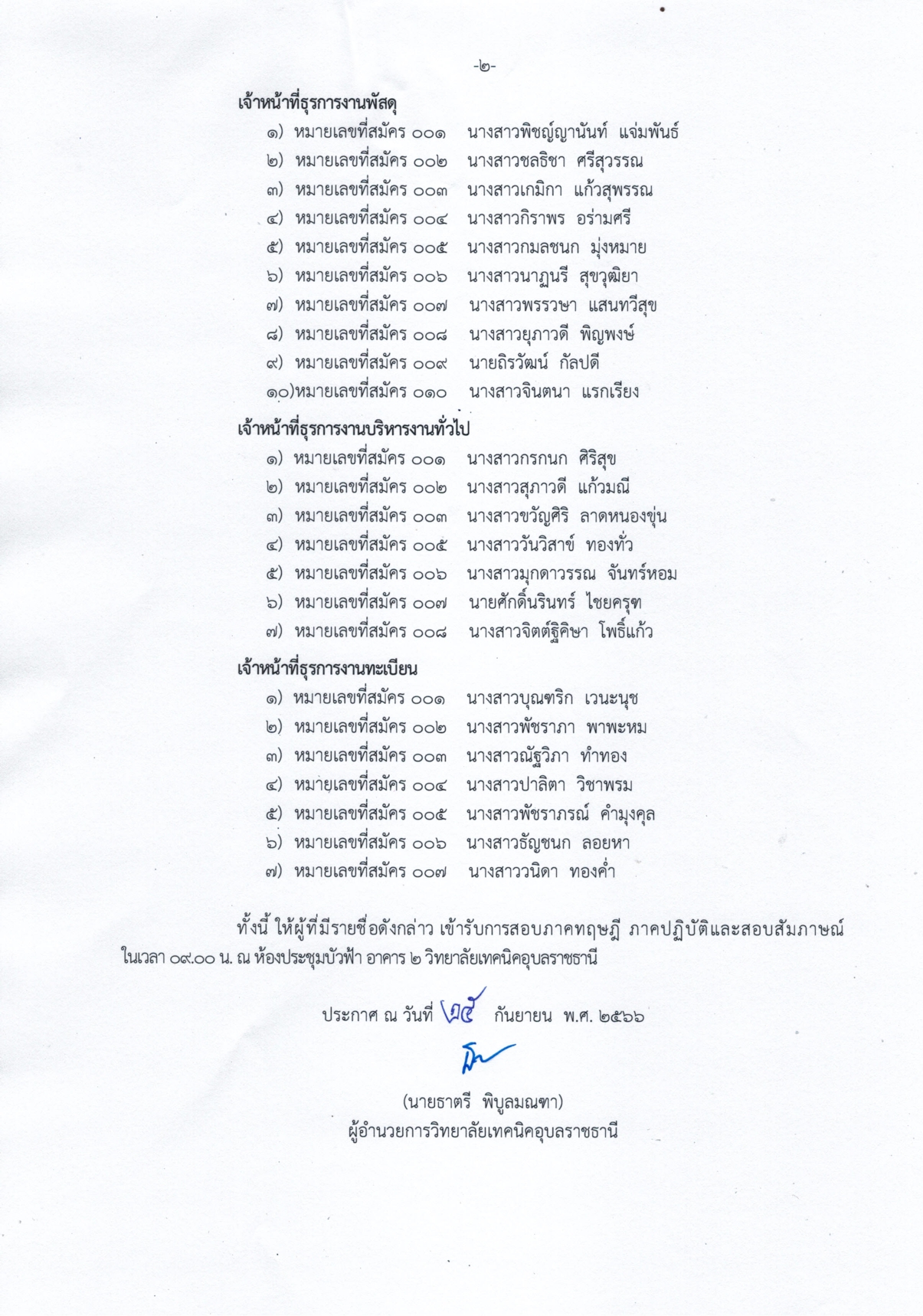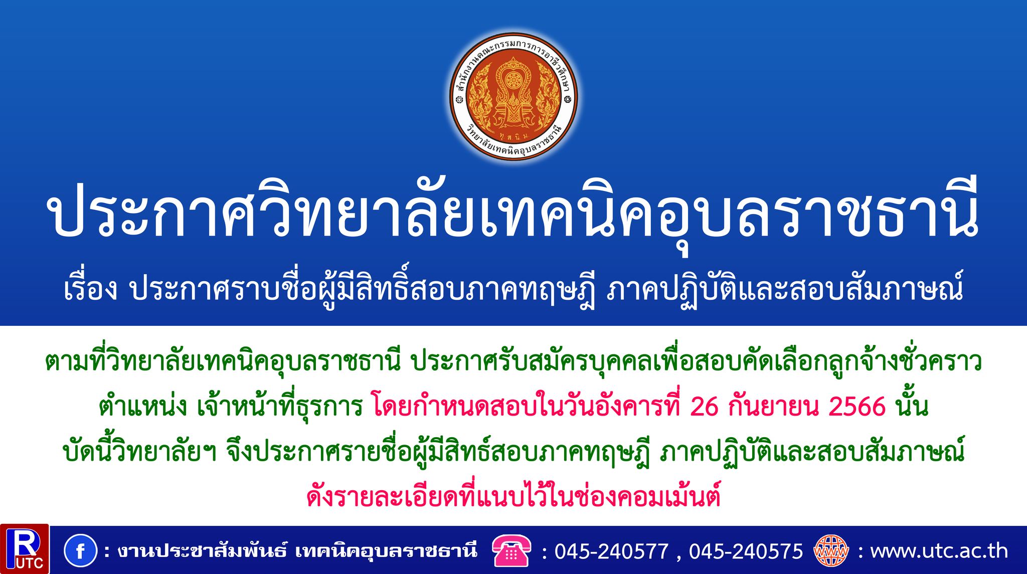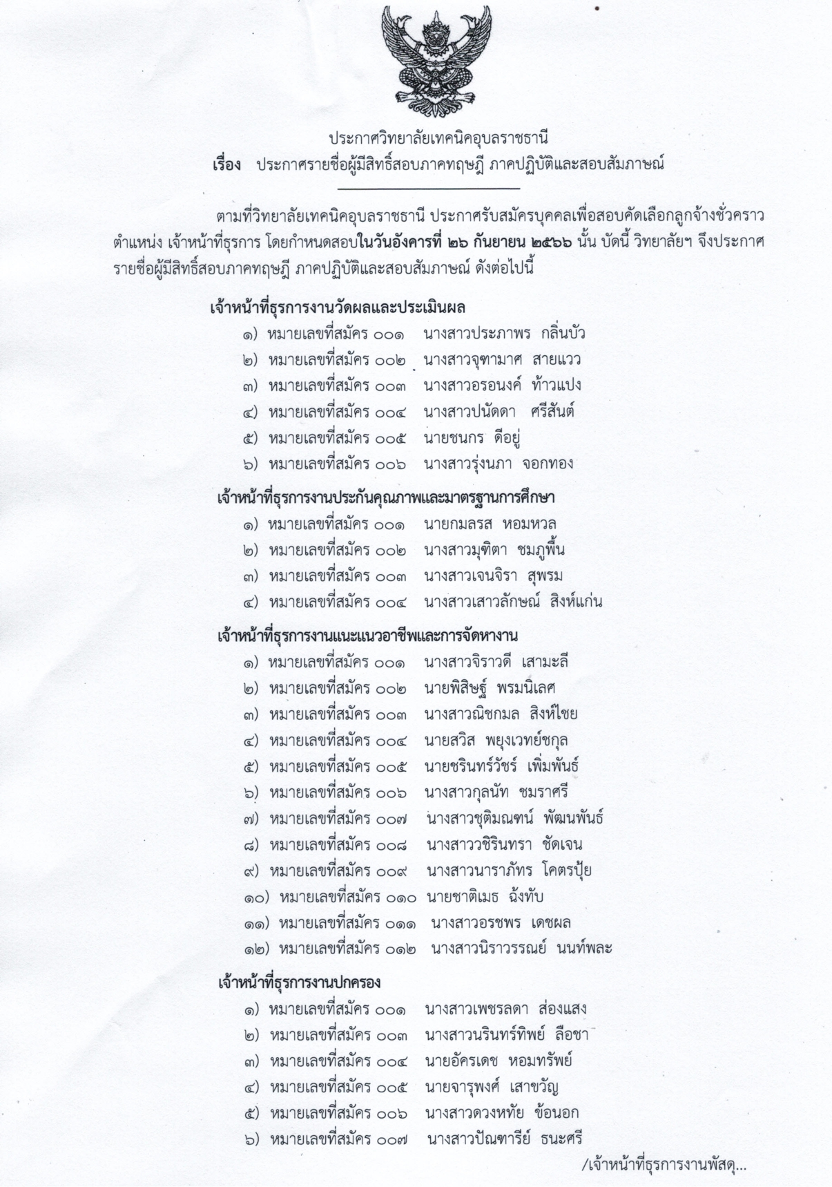ตามที่วิทยาลัยเทคนิคอุบลราชธานีประกาศรับสมัครบุคคลเพื่อสอบคัดเลือกลูกจ้างชั่วคราว ตำแหน่ง เจ้าหน้าที่ธุรการ โดยกำหนดสอบในวันอังคารที่ 26 กันยายน 2566 นั้น บัดนี้วิทยาลัยฯ จึงประกาศรายชื่อผู้มีสิทธ์สอบภาคทฤษฎี ภาคปฏิบัติและสอบสัมภาษณ์ ดังรายละเอียดที่แนบไว้ใต้ช่องคอมเม้นต์