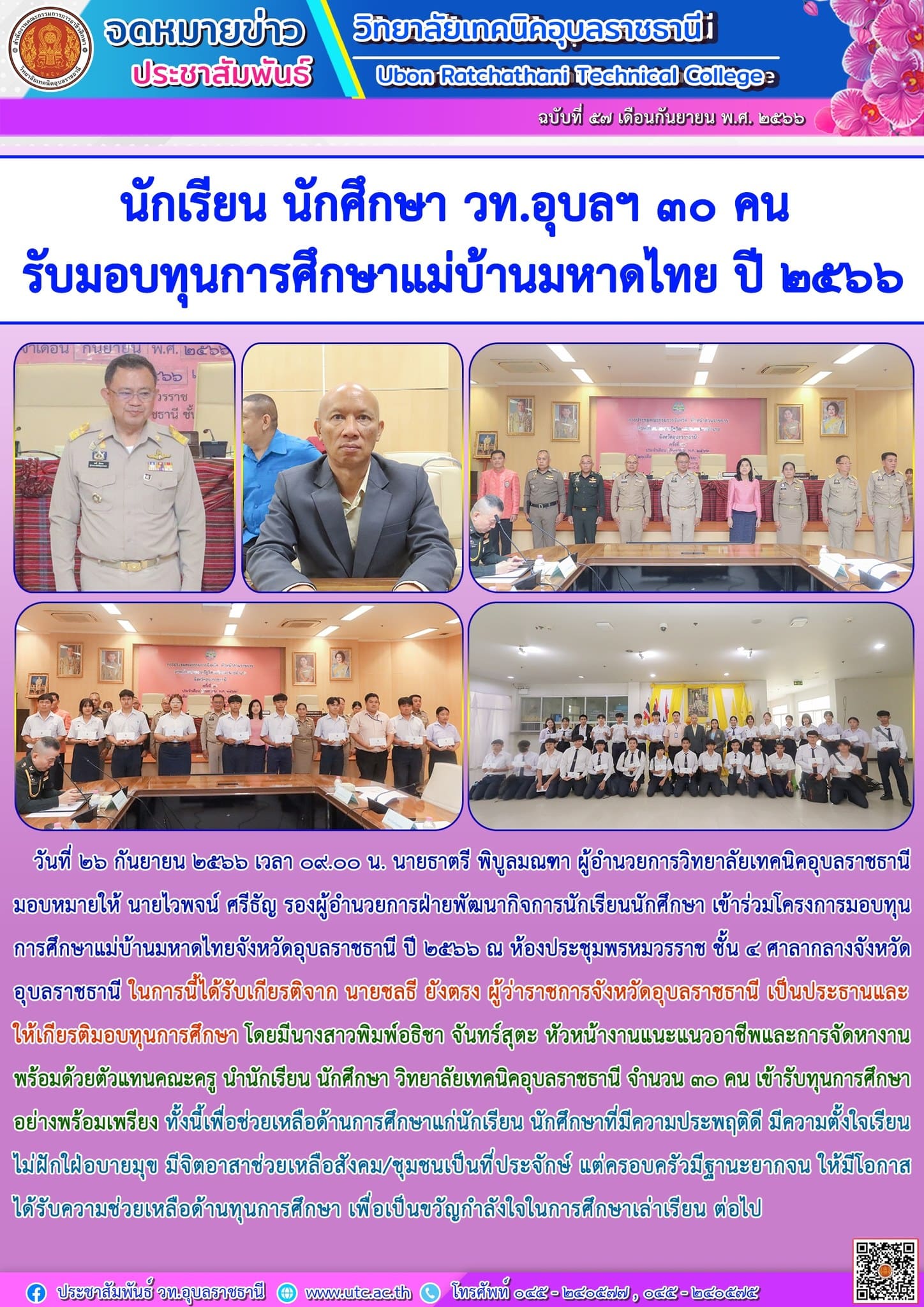 นักเรียน นักศึกษา วท.อุบลฯ ๓๐ คน รับมอบทุนการศึกษาแม่บ้านมหาดไทย ปี ๒๕๖๖