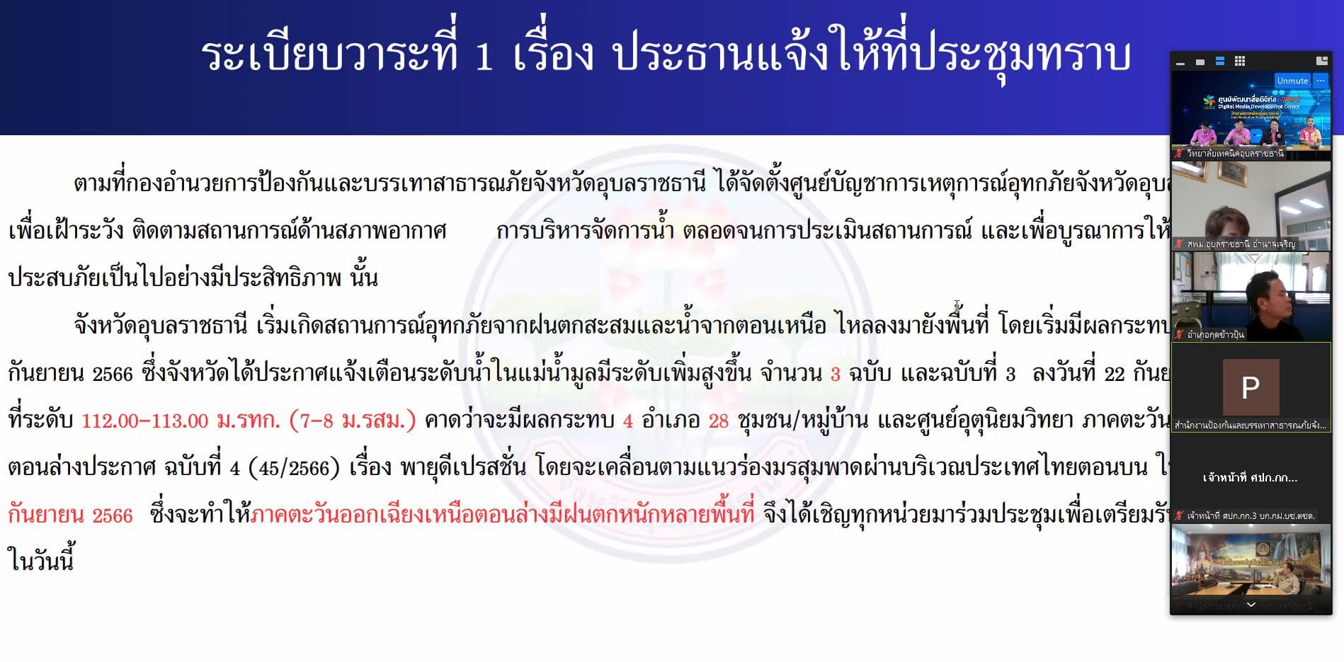 วท.อุบลฯ ร่วมประชุมติดตามสถานการณ์น้ำและพายุดีเปรสชั่น พร้อมทั้งการเตรียมความพร้อมให้การช่วยเหลือผู้ประสบอุทกภัย