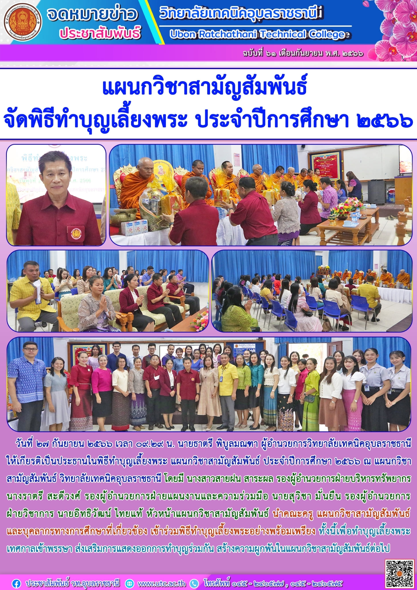 วันที่ ๒๗ กันยายน ๒๕๖๖ เวลา ๐๙.๒๙ น. นายธาตรี พิบูลมณฑา ผู้อำนวยการวิทยาลัยเทคนิคอุบลราชธานี ให้เกียรติเป็นประธานในพิธีทำบุญเลี้ยงพระ แผนกวิชาสามัญสัมพันธ์ ประจำปีการศึกษา ๒๕๖๖ ณ แผนกวิชาสามัญสัมพันธ์ วิทยาลัยเทคนิคอุบลราชธานี โดยมี นางสาวสายฝน สาระผล รองผู้อำนวยการฝ่ายบริหารทรัพยากร นางราตรี สะดีวงศ์ รองผู้อำนวยการฝ่ายแผนงานและความร่วมมือ นายสุวิชา มั่นยืน รองผู้อำนวยการฝ่ายวิชาการ นายอิทธิวัฒน์ ไทยแท้ หัวหน้าแผนกวิชาสามัญสัมพันธ์ นำคณะครู แผนกวิชาสามัญสัมพันธ์ และบุคลากรทางการศึกษาที่เกี่ยวข้อง เข้าร่วมพิธีทำบุญเลี้ยงพระอย่างพร้อมเพรียง ทั้งนี้เพื่อทำบุญเลี้ยงพระเทศกาลเข้าพรรษา ส่งเสริมการแสดงออกการทำบุญร่วมกัน สร้างความผูกพันในแผนกวิชาสามัญสัมพันธ์ต่อไป