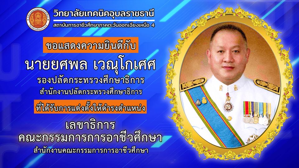 คณะผู้บริหาร ครู และบุคลากรทางการศึกษา วิทยาลัยเทคนิคอุบลราชธานี ขอแสดงความยินดีกับ นายยศพล เวณุโกเศศ รองปลัดกระทรวงศึกษาธิการ