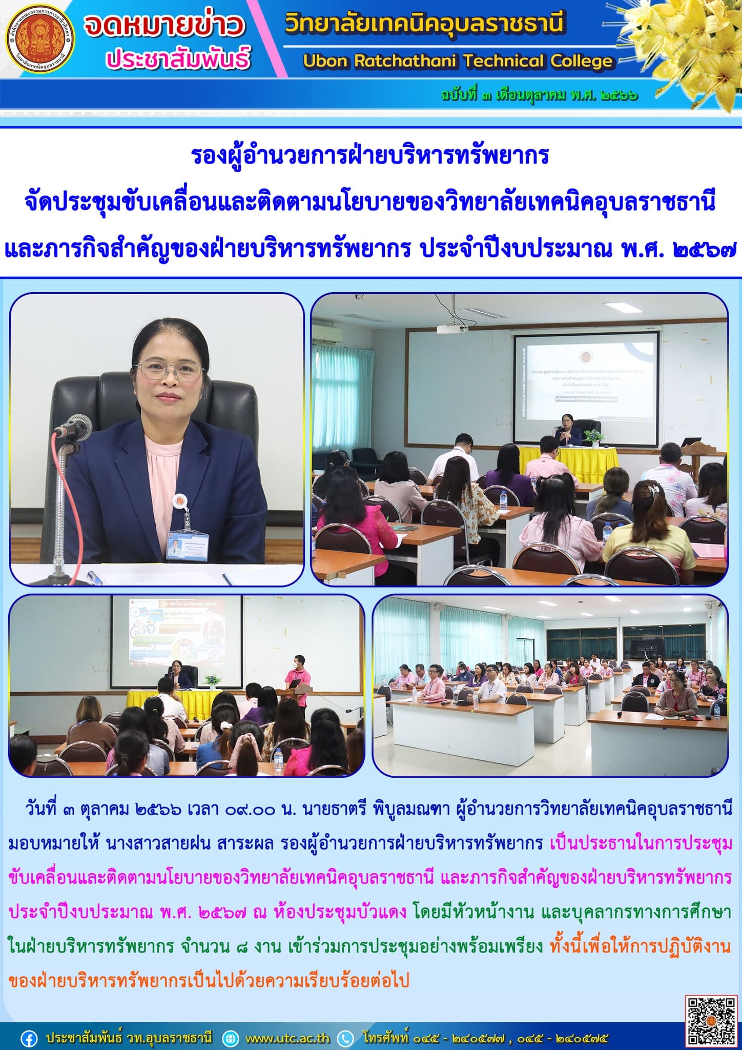 วันที่ ๓ ตุลาคม ๒๕๖๖ เวลา ๐๙.๐๐ น. นายธาตรี พิบูลมณฑา ผู้อำนวยการวิทยาลัยเทคนิคอุบลราชธานี มอบหมายให้ นางสาวสายฝน สาระผล รองผู้อำนวยการฝ่ายบริหารทรัพยากร เป็นประธานในการประชุมขับเคลื่อนและติดตามนโยบายของวิทยาลัยเทคนิคอุบลราชธานี และภารกิจสำคัญของฝ่ายบริหารทรัพยากร ประจำปีงบประมาณ พ.ศ. ๒๕๖๗ ณ ห้องประชุมบัวแดง โดยมีหัวหน้างาน และบุคลากรทางการศึกษาในฝ่ายบริหารทรัพยากร จำนวน ๘ งาน เข้าร่วมการประชุมอย่างพร้อมเพรียง ทั้งนี้เพื่อให้การปฏิบัติงานของฝ่ายบริหารทรัพยากรเป็นไปด้วยความเรียบร้อยต่อไป