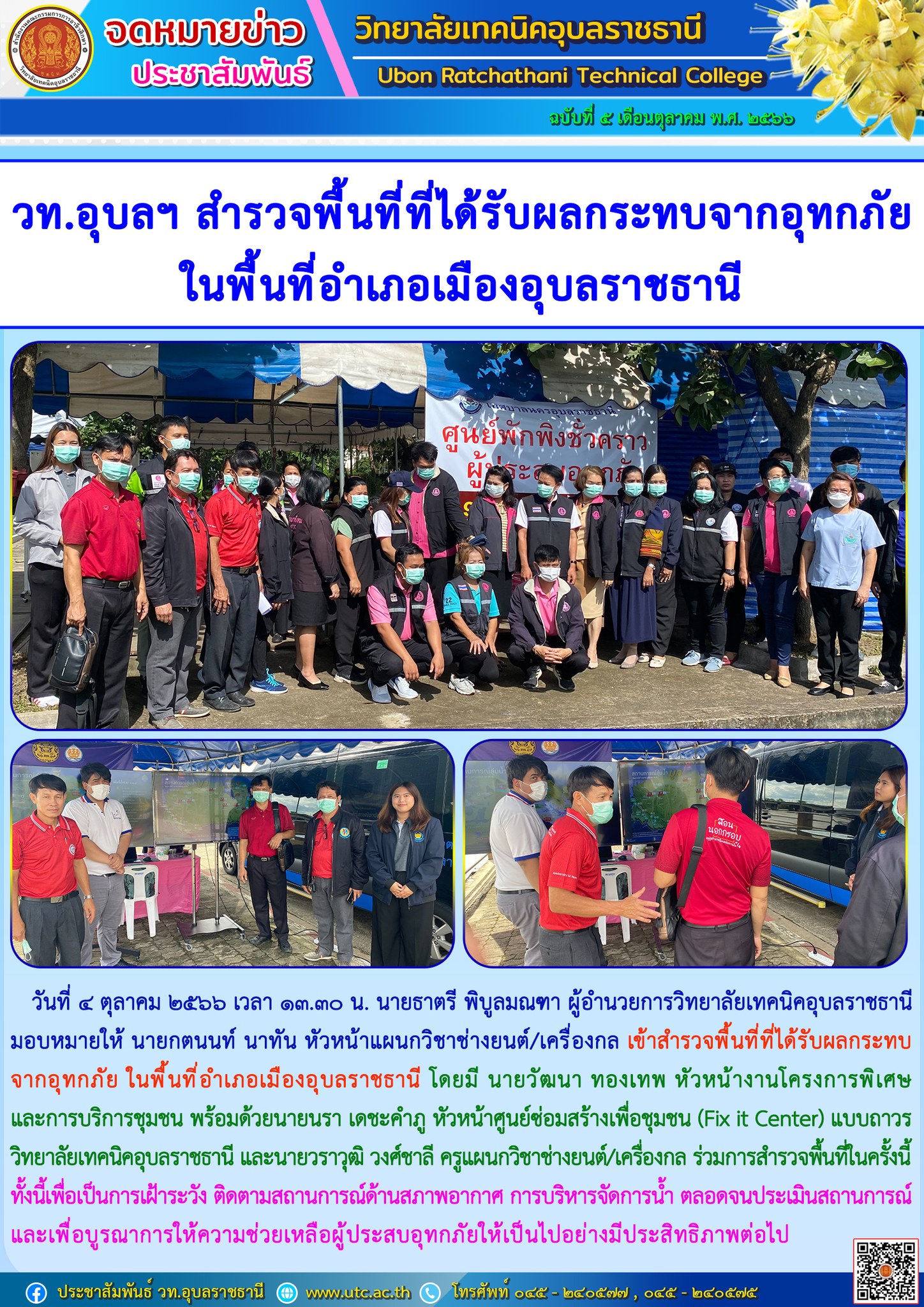 วันที่ ๔ ตุลาคม ๒๕๖๖ เวลา ๑๓.๓๐ น. นายธาตรี พิบูลมณฑา ผู้อำนวยการวิทยาลัยเทคนิคอุบลราชธานี มอบหมายให้ นายกตนนท์ นาทัน หัวหน้าแผนกวิชาช่างยนต์/เครื่องกล เข้าสำรวจพื้นที่ที่ได้รับผลกระทบจากอุทกภัย ในพื้นที่อำเภอเมืองอุบลราชธานี โดยมี นายวัฒนา ทองเทพ หัวหน้างานโครงการพิเศษและการบริการชุมชน พร้อมด้วยนายนรา เดชะคำภู หัวหน้าศูนย์ซ่อมสร้างเพื่อชุมชน (Fix it Center) แบบถาวร วิทยาลัยเทคนิคอุบลราชธานี และนายวราวุฒิ วงศ์ชาลี ครูแผนกวิชาช่างยนต์/เครื่องกล ร่วมการสำรวจพื้นที่ในครั้งนี้ ทั้งนี้เพื่อเป็นการเฝ้าระวัง ติดตามสถานการณ์ด้านสภาพอากาศ การบริหารจัดการน้ำ ตลอดจนประเมินสถานการณ์ และเพื่อบูรณาการให้ความช่วยเหลือผู้ประสบอุทกภัยให้เป็นไปอย่างมีประสิทธิภาพต่อไป
