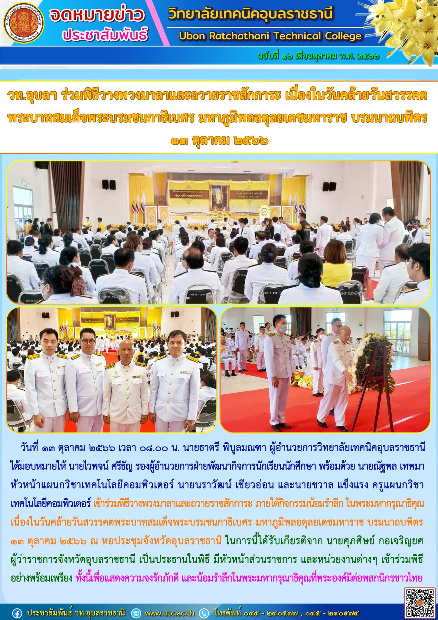 วท.อุบลฯ ร่วมพิธีวางพวงมาลาและถวายราชสักการะ เนื่องในวันคล้ายวันสวรรคตพระบาทสมเด็จพระบรมชนกาธิเบศร มหาภูมิพลอดุลยเดชมหาราช บรมนาถบพิตร ๑๓ ตุลาคม ๒๕๖๖