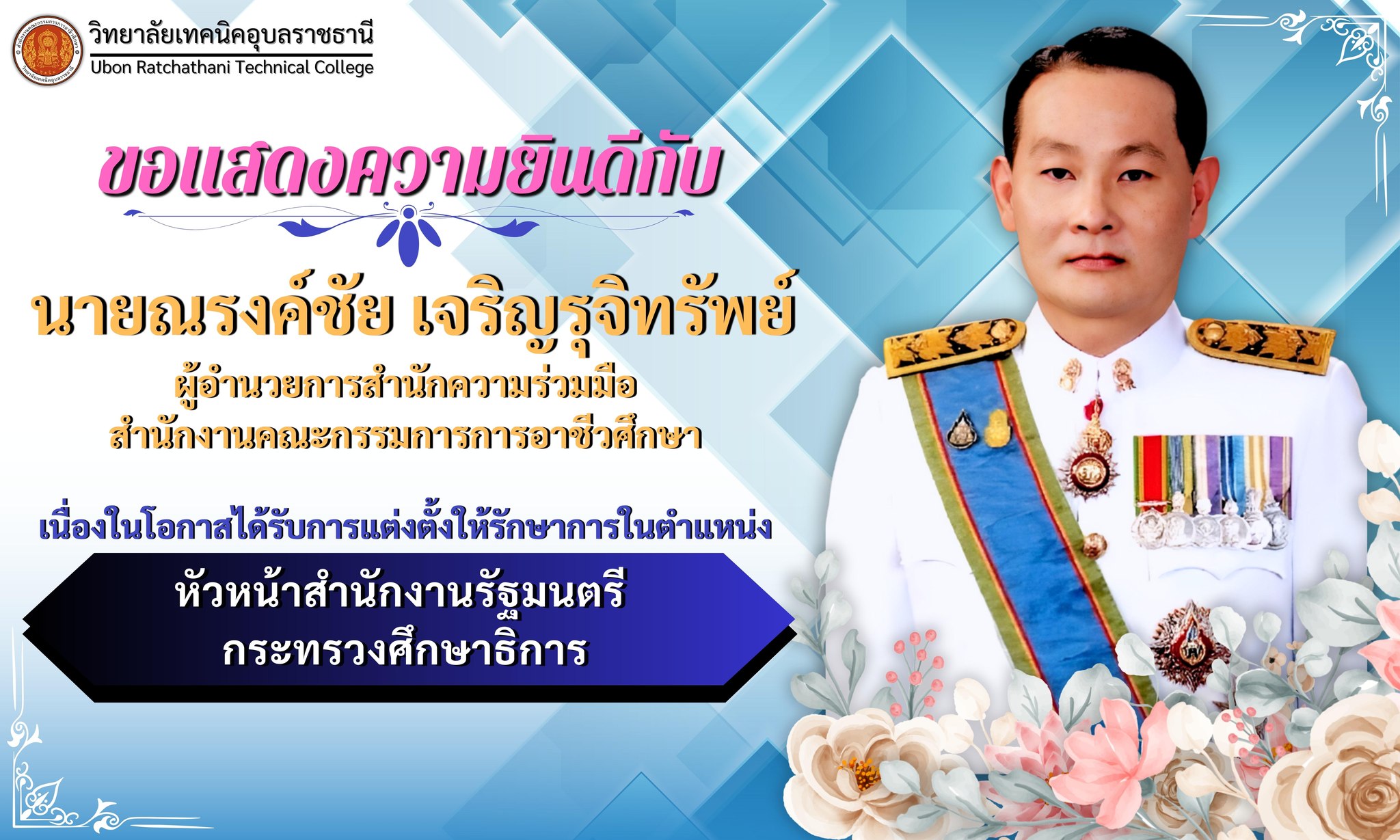 วิทยาลัยเทคนิคอุบลราชธานี ขอแสดงความยินดีกับ นายณรงค์ชัย เจริญรุจิทรัพย์