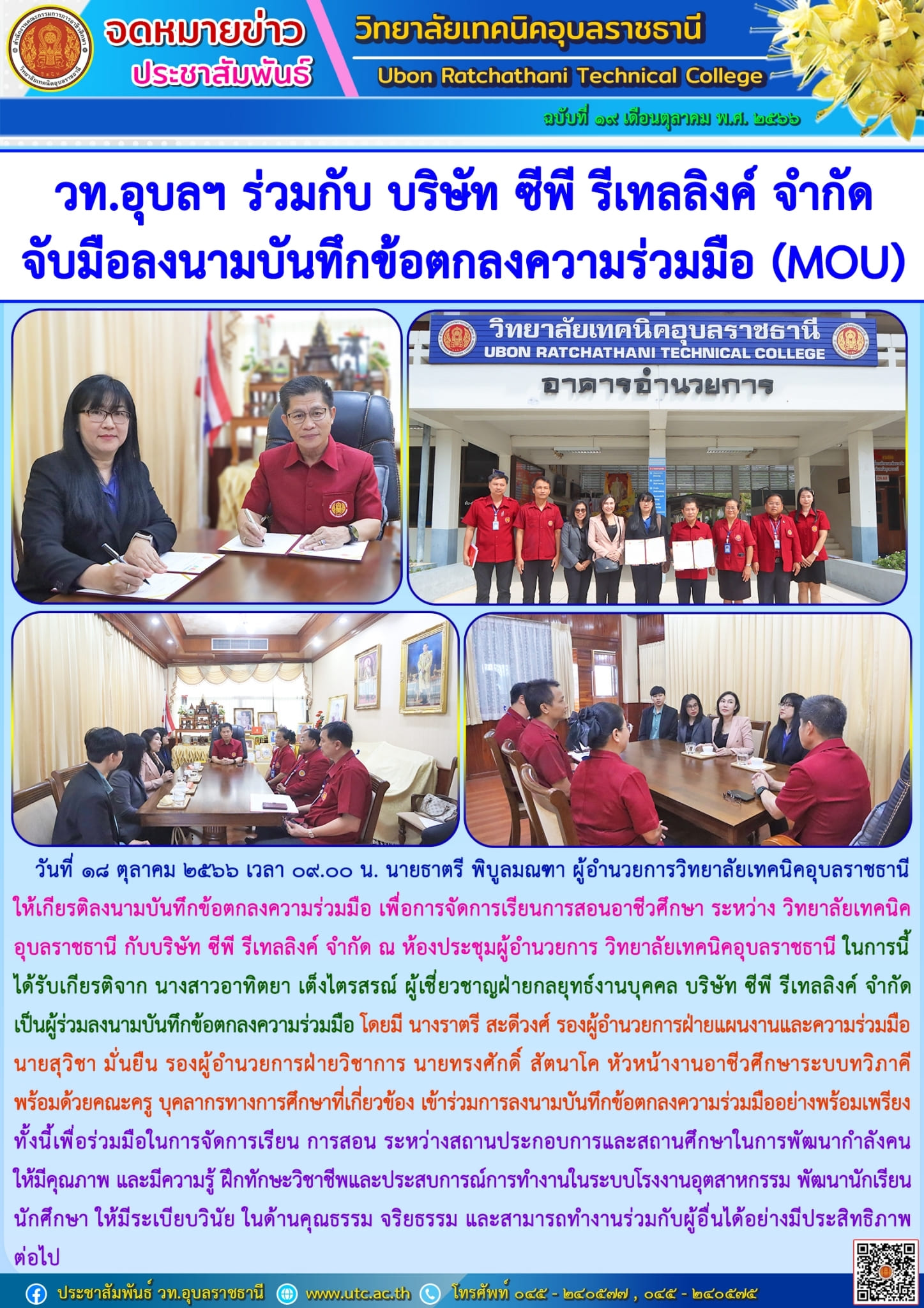 วันที่ ๑๘ ตุลาคม ๒๕๖๖ เวลา ๐๙.๐๐ น. นายธาตรี พิบูลมณฑา ผู้อำนวยการวิทยาลัยเทคนิคอุบลราชธานี ให้เกียรติลงนามบันทึกข้อตกลงความร่วมมือ เพื่อการจัดการเรียนการสอนอาชีวศึกษา ระหว่าง วิทยาลัยเทคนิคอุบลราชธานี กับบริษัท ซีพี รีเทลลิงค์ จำกัด ณ ห้องประชุมผู้อำนวยการ วิทยาลัยเทคนิคอุบลราชธานี ในการนี้ได้รับเกียรติจาก นางสาวอาทิตยา เต็งไตรสรณ์ ผู้เชี่ยวชาญฝ่ายกลยุทธ์งานบุคคล บริษัท ซีพี รีเทลลิงค์ จำกัด เป็นผู้ร่วมลงนามบันทึกข้อตกลงความร่วมมือ โดยมี นางราตรี สะดีวงศ์ รองผู้อำนวยการฝ่ายแผนงานและความร่วมมือ นายสุวิชา มั่นยืน รองผู้อำนวยการฝ่ายวิชาการ นายทรงศักดิ์ สัตนาโค หัวหน้างานอาชีวศึกษาระบบทวิภาคี พร้อมด้วยคณะครู บุคลากรทางการศึกษาที่เกี่ยวข้อง เข้าร่วมการลงนามบันทึกข้อตกลงความร่วมมืออย่างพร้อมเพรียง ทั้งนี้เพื่อร่วมมือในการจัดการเรียน การสอน ระหว่างสถานประกอบการและสถานศึกษาในการพัฒนากำลังคนให้มีคุณภาพ และมีความรู้ ฝึกทักษะวิชาชีพและประสบการณ์การทำงานในระบบโรงงานอุตสาหกรรม พัฒนานักเรียน นักศึกษา ให้มีระเบียบวินัย ในด้านคุณธรรม จริยธรรม และสามารถทำงานร่วมกับผู้อื่นได้อย่างมีประสิทธิภาพ ต่อไป