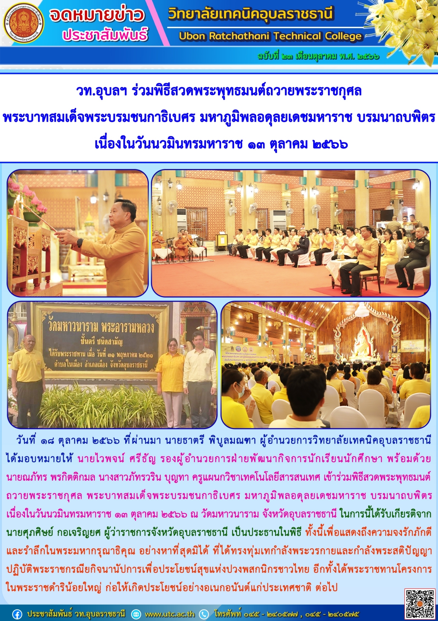วท.อุบลฯ ร่วมพิธีสวดพระพุทธมนต์ถวายพระราชกุศล พระบาทสมเด็จพระบรมชนกาธิเบศร มหาภูมิพลอดุลยเดชมหาราชฯ เนื่องในวันนวมินทรมหาราช ๑๓ ตุลาคม ๒๕๖๖
