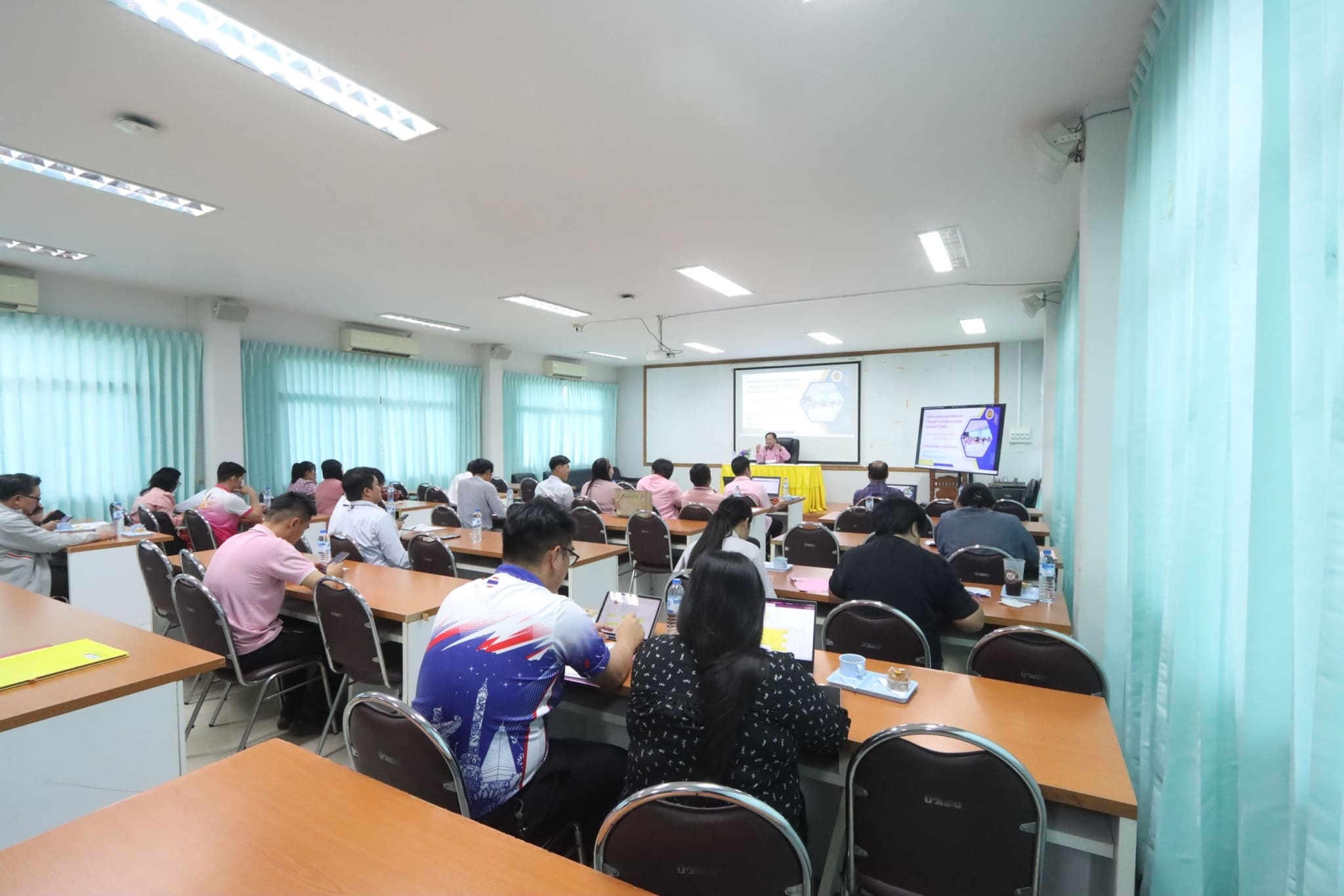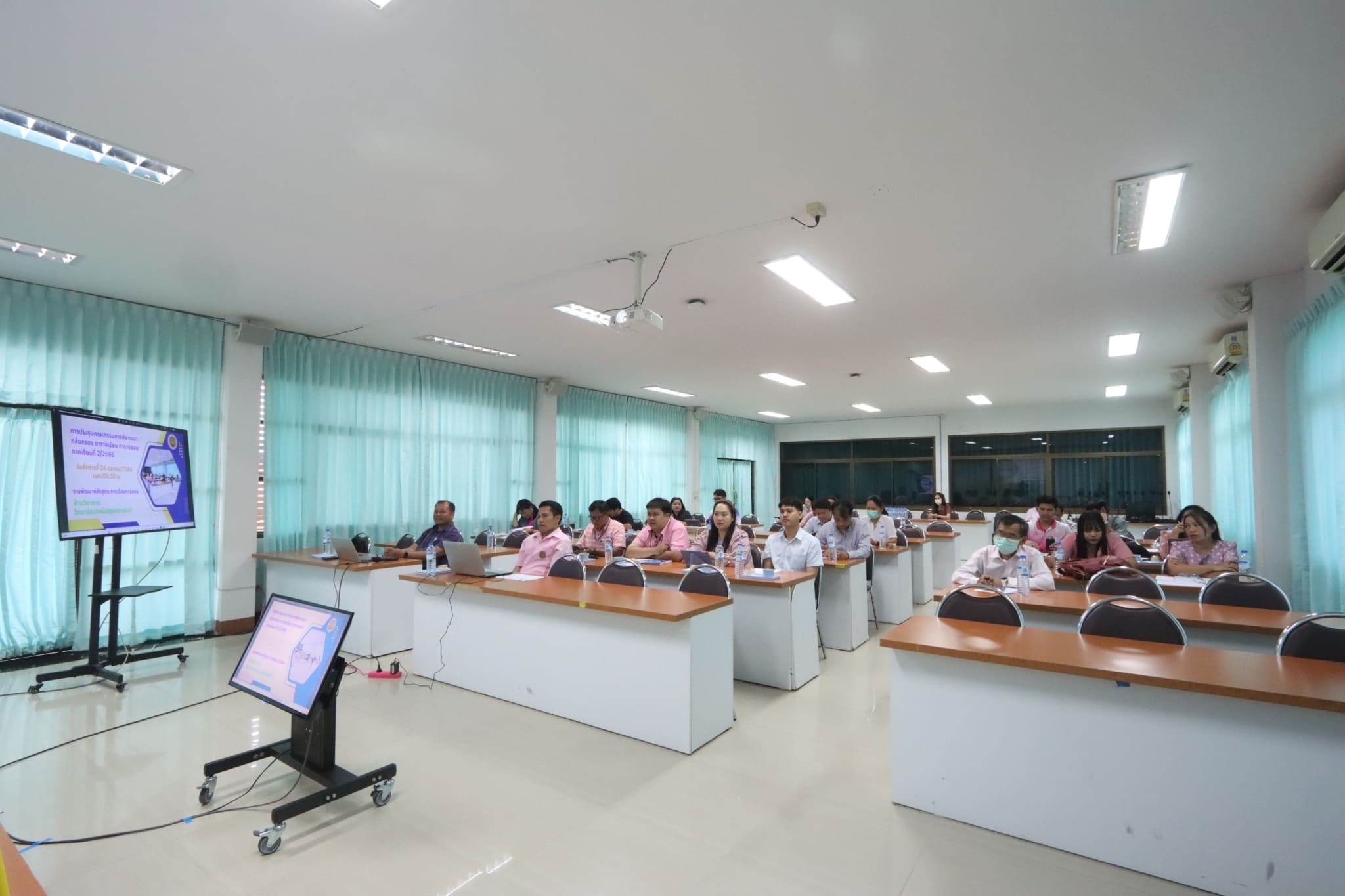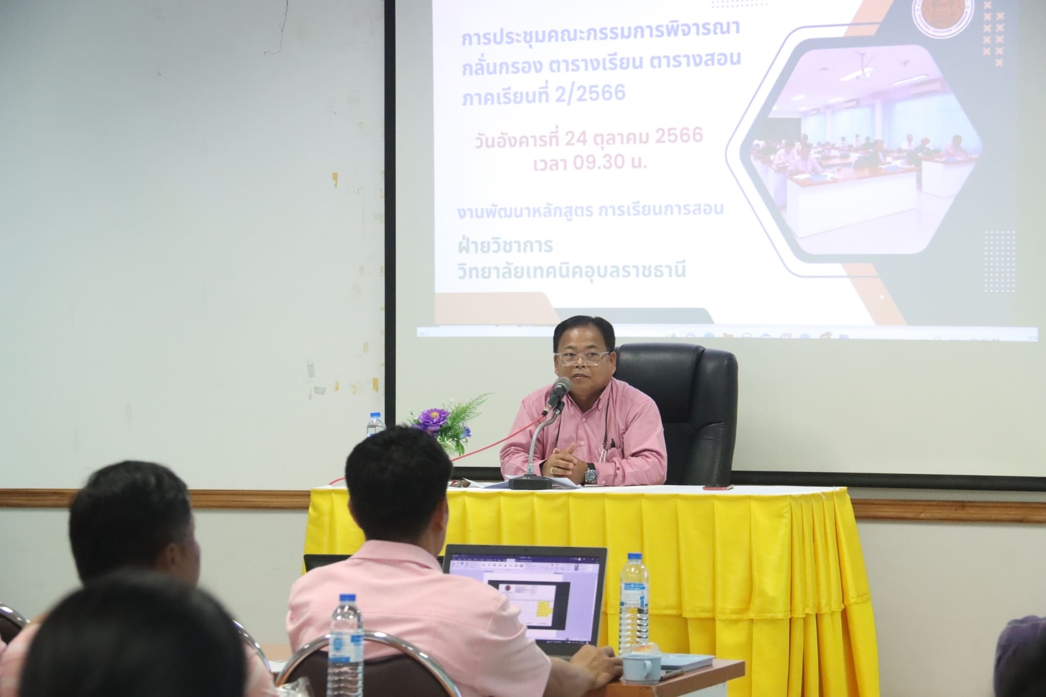 วันที่ ๒๔ ตุลาคม ๒๕๖๖ เวลา ๐๙.๓๐ น. นายธาตรี พิบูลมณฑา ผู้อำนวยการวิทยาลัยเทคนิคอุบลราชธานี มอบหมายให้ นายสุวิชา มั่นยืน รองผู้อำนวยการฝ่ายวิชาการ เป็นประธานในการประชุมคณะกรรมการพิจารณากลั่นกรอง ตารางเรียน ตารางสอน ภาคเรียนที่ ๒ ปีการศึกษา ๒๕๖๖ ณ ห้องประชุมบัวแดง วิทยาลัยเทคนิคอุบลราชธานี โดยมี นายคารมย์ แก้วกันยา หัวหน้างานพัฒนาหลักสูตรการเรียนการสอน พร้อมด้วย หัวหน้าแผนกวิชา หัวหน้างาน ครู และบุคลากรทางการศึกษาที่เกี่ยวข้อง เข้าร่วมการประชุมอย่างพร้อมเพรียง ทั้งนี้เพื่อพิจารณากลั่นกรองความถูกต้องเหมาะสม ตรวจสอบชั่วโมงเรียน และหน่วยกิตให้ถูกต้อง ตามแผนการเรียนของภาคเรียนที่ ๒ ปีการศึกษา ๒๕๖๖ ต่อไป