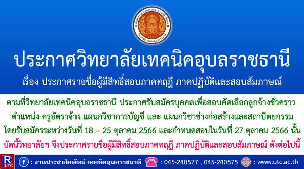 ประกาศวิทยาลัยเทคนิคอุบลราชธานี เรื่อง ประกาศรายชื่อผู้มีสิทธิ์สอบภาคทฤฎี ภาคปฏิบัติและสอบสัมภาษณ์