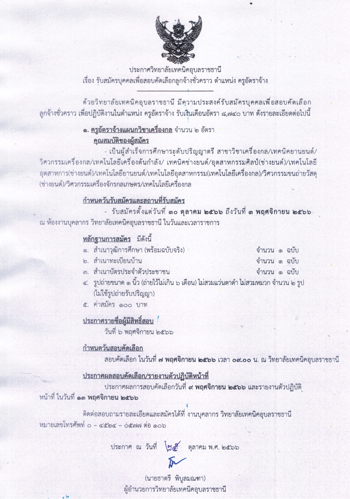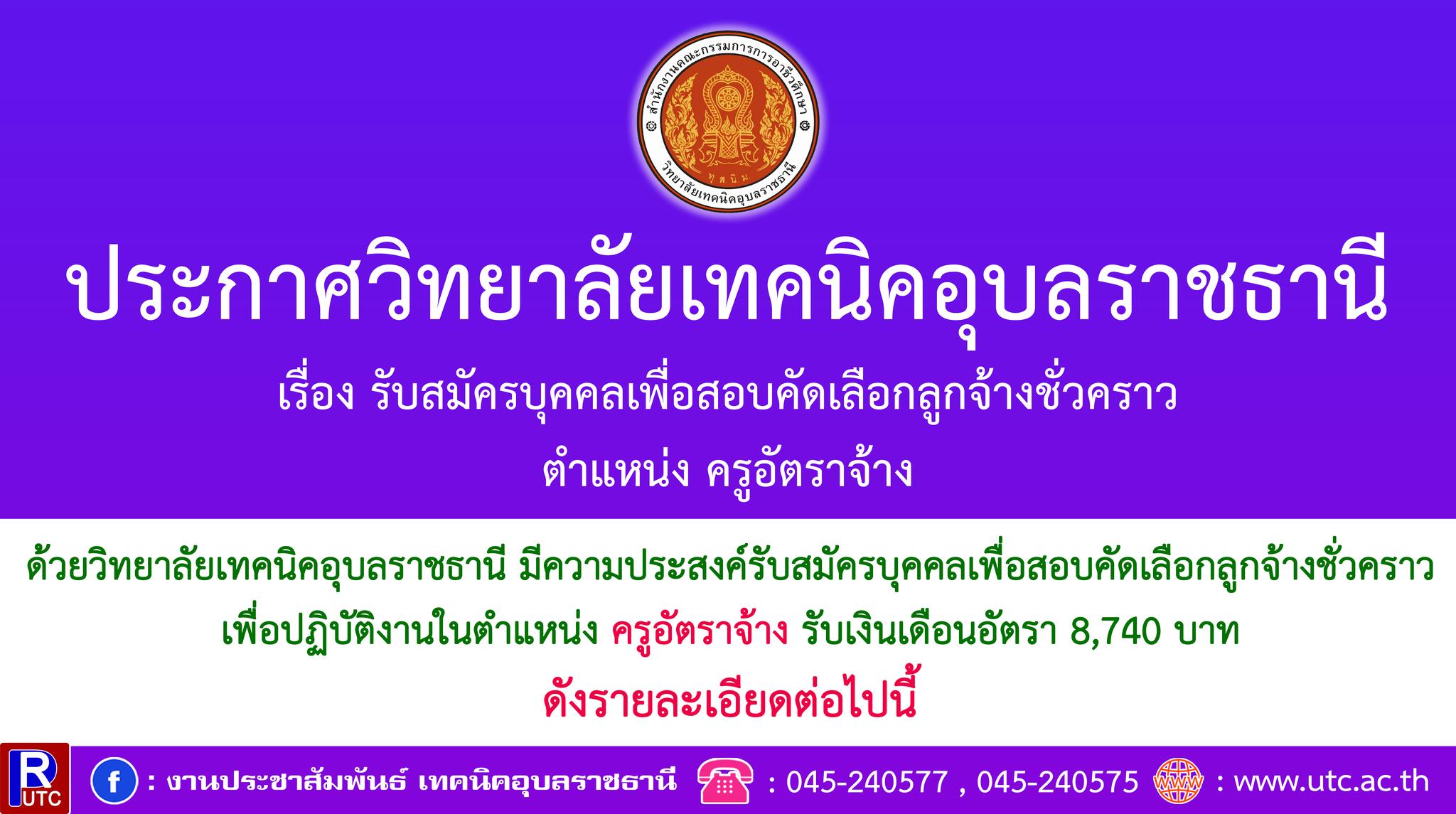 ด้วยวิทยาลัยเทคนิคอุบลราชธานี มีความประสงค์รับสมัครบุคคลเพื่อสอบคัดเลือกลูกจ้างชั่วคราว เพื่อปฏิบัติงานในตำแหน่ง ครูอัตราจ้าง รับเงินเดือนอัตรา 8,740 บาท ดังรายละเอียดต่อไปนี้