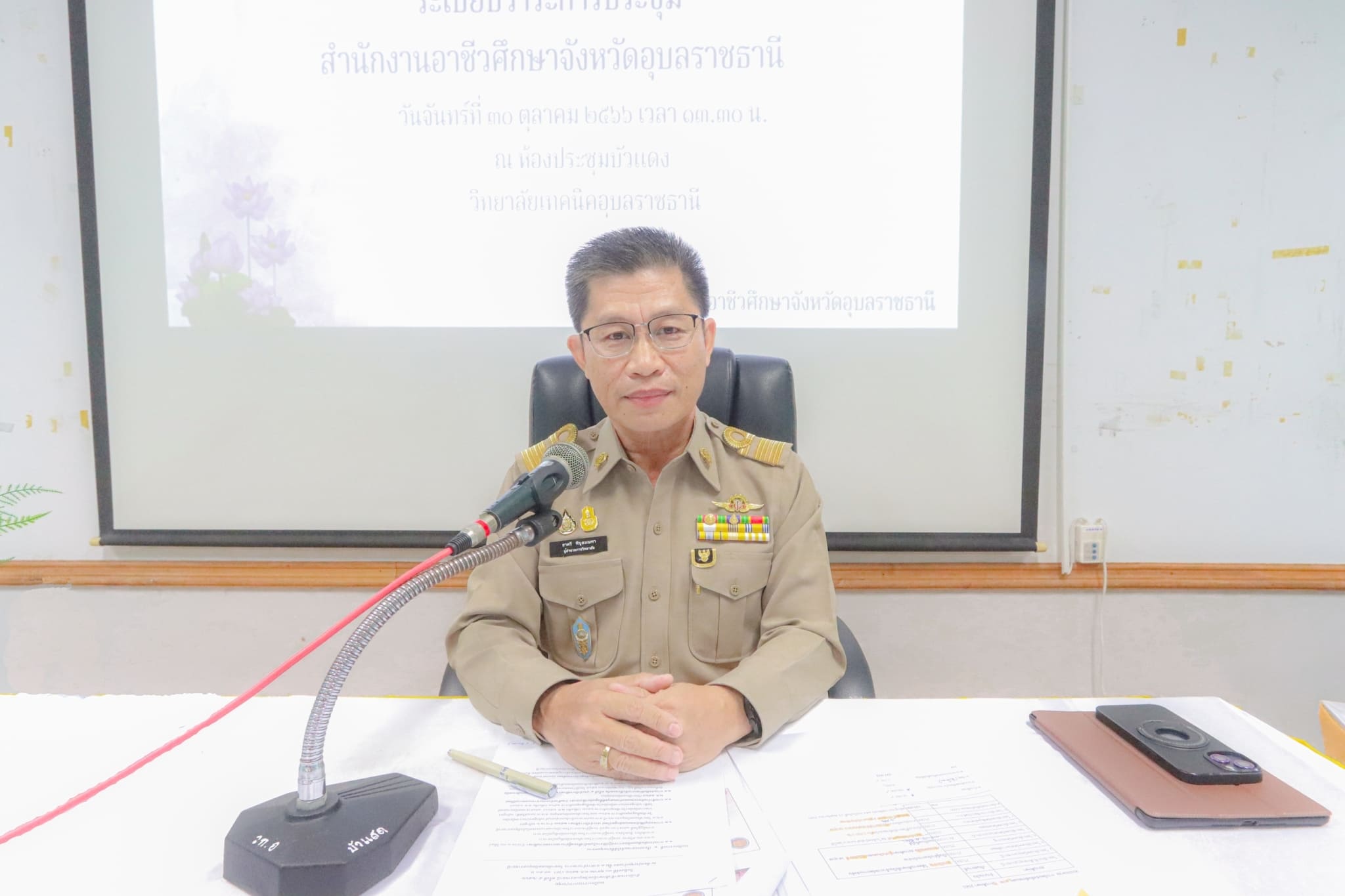 วันที่ ๓๐ ตุลาคม ๒๕๖๖ เวลา ๑๓.๓๐ น. นายธาตรี พิบูลมณฑา ผู้อำนวยการวิทยาลัยเทคนิคอุบลราชธานี ปฏิบัติหน้าที่ ผู้อำนวยการสำนักงานอาชีวศึกษาจังหวัดอุบลราชธานี ให้เกียรติเป็นประธานในการประชุมสำนักงานอาชีวศึกษาจังหวัดอุบลราชธานี ครั้งที่ ๕/๒๕๖๖ ณ ห้องประชุมบัวแดง วิทยาลัยเทคนิคอุบลราชธานี โดยมีนางราตรี สะดีวงศ์ รองผู้อำนวยการฝ่ายแผนงานและความร่วมมือ ปฏิบัติหน้าที่ เลขานุการสำนักงานอาชีวศึกษาจังหวัดอุบลราชธานี นางสาวสายฝน สาระผล รองผู้อำนวยการฝ่ายบริหารทรัพยากร นายไวพจน์ ศรีธัญ รองผู้อำนวยการฝ่ายพัฒนากิจการนักเรียนนักศึกษา นายสุวิชา มั่นยืน รองผู้อำนวยการฝ่ายวิชาการ นางณชิตา เถาว์โท หัวหน้าสำนักงานอาชีวศึกษาจังหวัดอุบลราชธานี คณะผู้บริหารสถานศึกษา ในสังกัดสำนักงานอาชีวศึกษาจังหวัดอุบลราชธานี และบุคลากรทางการศึกษาที่เกี่ยวข้อง เข้าร่วมการประชุมอย่างพร้อมเพรียง ทั้งนี้เพื่อให้การดำเนินงานเป็นไปด้วยความเรียบร้อย และบรรลุตามวัตถุประสงค์ ต่อไป