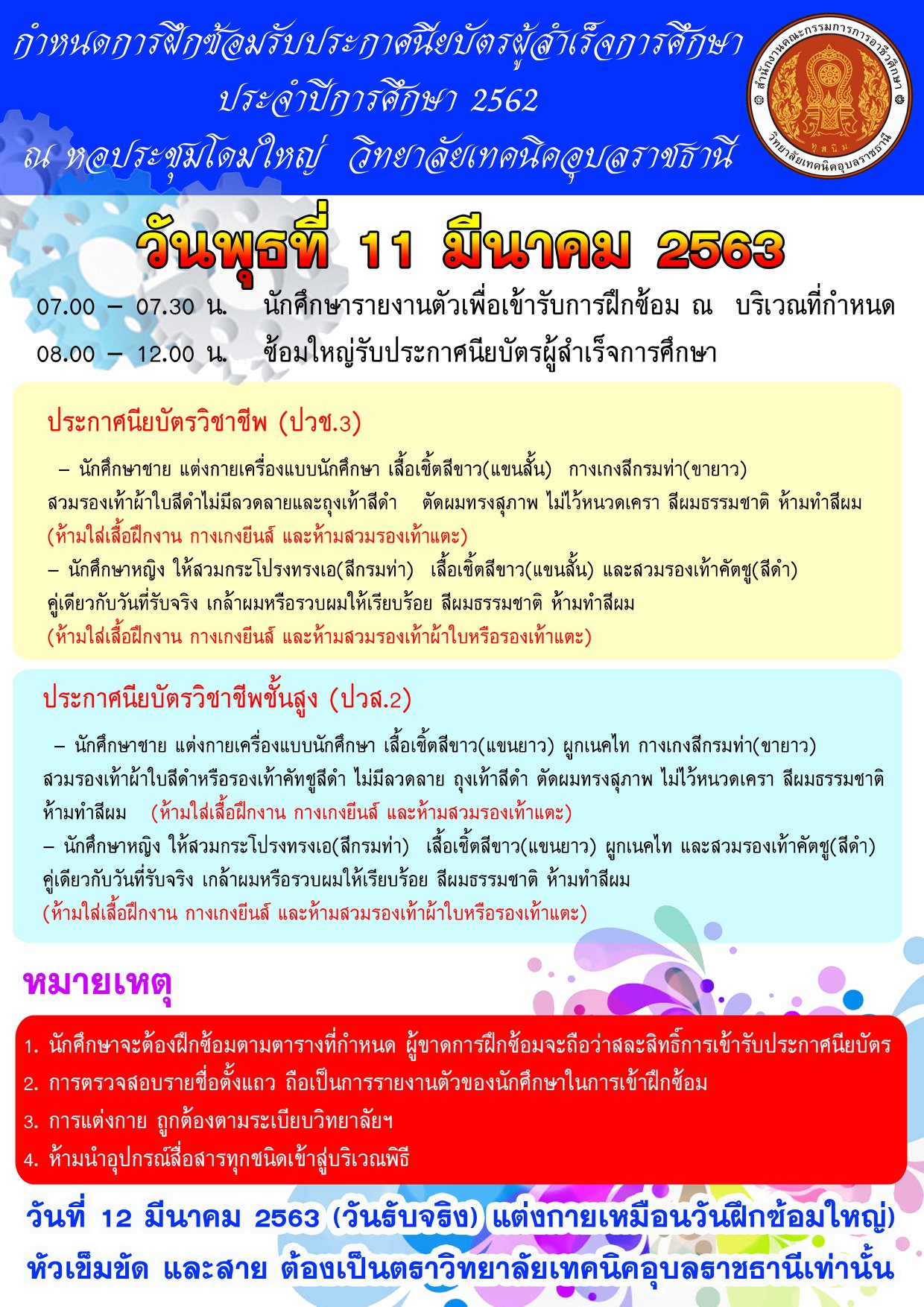 กำหนดการฝึกซ้อมรับประกาศนียบัตรผู้สำเร็จการศึกษา ประจำปีการศึกษา 2562