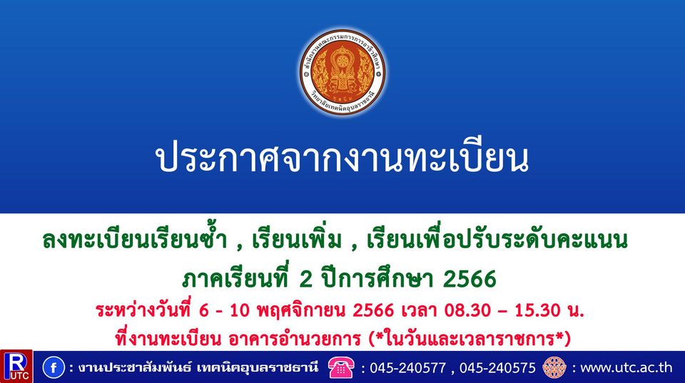 ประกาศจากงานทะเบียน ลงทะเบียนเรียนซ้ำ , เรียนเพิ่ม , เรียนเพื่อปรับระดับคะแนน ภาคเรียนที่ 2 ปีการศึกษา 2566