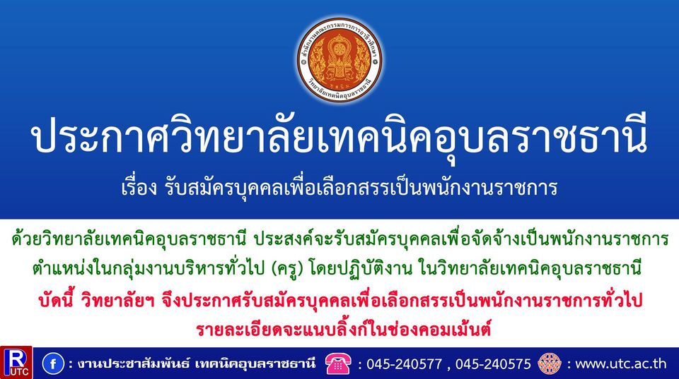 ประกาศวิทยาลัยเทคนิคอุบลราชธานี เรื่อง รับสมัครบุคคลเพื่อเลือกสรรเป็นพนักงานราชการ