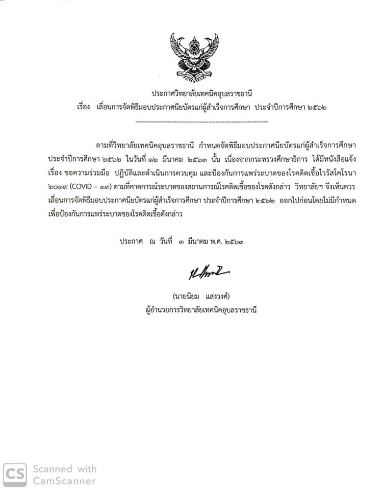 ประกาศ ปิดสถานศึกษาเนื่องด้วยเหตุจำเป็น สถานะการณ์แพร่ระบาดไวรัสโคโรน่า 2019 (COVID19)