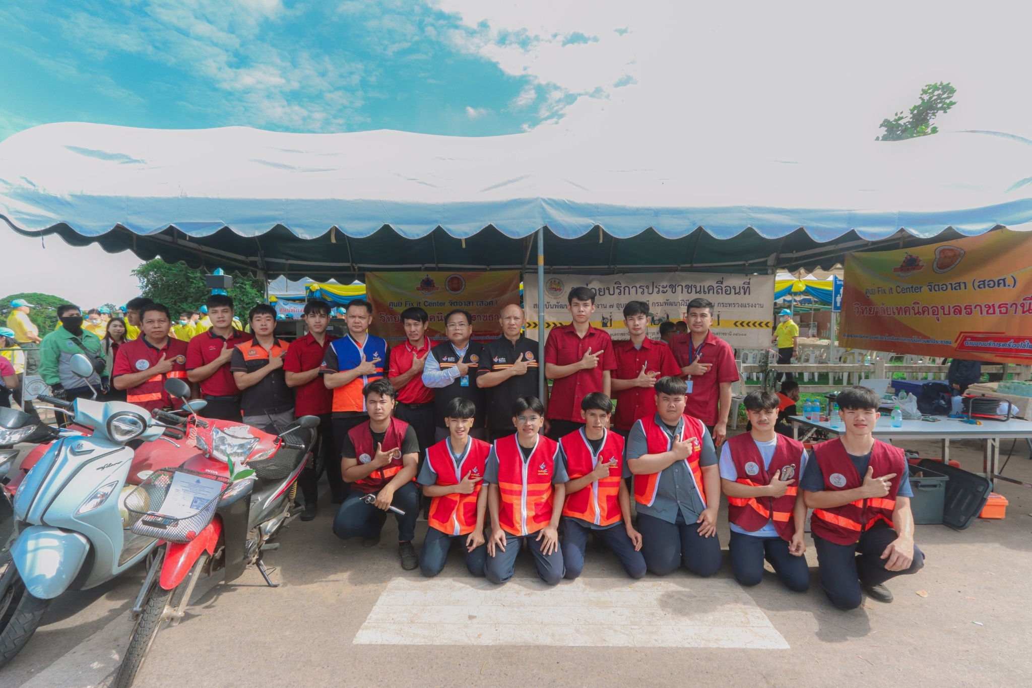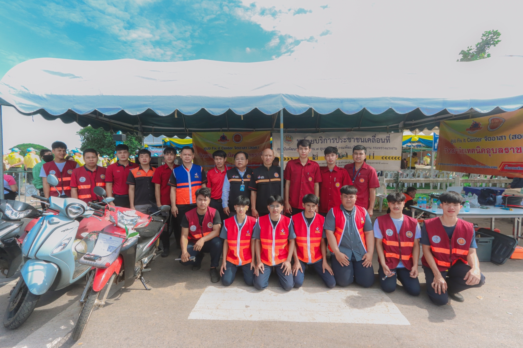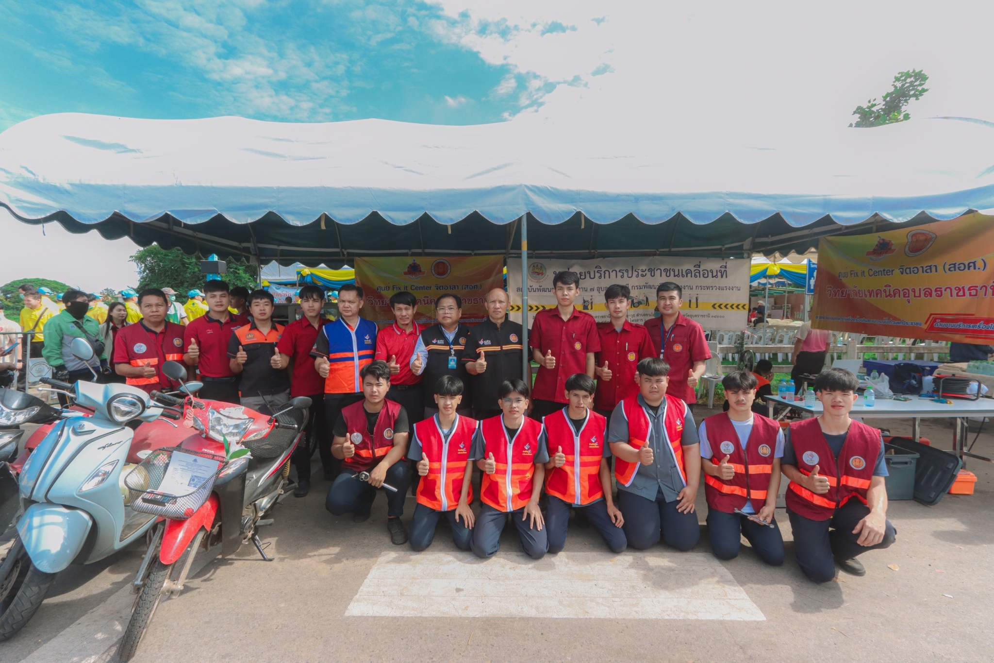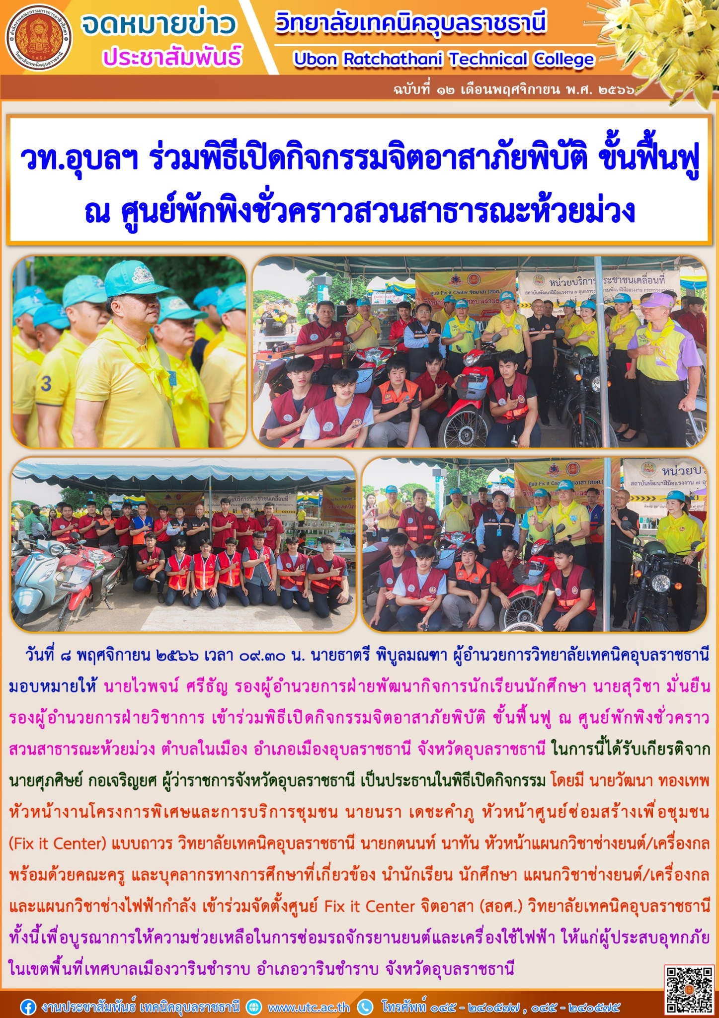 วันที่ ๘ พฤศจิกายน ๒๕๖๖ เวลา ๐๙.๓๐ น. นายธาตรี พิบูลมณฑา ผู้อำนวยการวิทยาลัยเทคนิคอุบลราชธานี มอบหมายให้ นายไวพจน์ ศรีธัญ รองผู้อำนวยการฝ่ายพัฒนากิจการนักเรียนนักศึกษา นายสุวิชา มั่นยืน รองผู้อำนวยการฝ่ายวิชาการ เข้าร่วมพิธีเปิดกิจกรรมจิตอาสาภัยพิบัติ ขั้นฟื้นฟู ณ ศูนย์พักพิงชั่วคราวสวนสาธารณะห้วยม่วง ตำบลในเมือง อำเภอเมืองอุบลราชธานี จังหวัดอุบลราชธานี ในการนี้ได้รับเกียรติจาก นายศุภศิษย์ กอเจริญยศ ผู้ว่าราชการจังหวัดอุบลราชธานี เป็นประธานในพิธีเปิดกิจกรรม โดยมี นายวัฒนา ทองเทพ หัวหน้างานโครงการพิเศษและการบริการชุมชน นายนรา เดชะคำภู หัวหน้าศูนย์ซ่อมสร้างเพื่อชุมชน (Fix it Center) แบบถาวร วิทยาลัยเทคนิคอุบลราชธานี นายกตนนท์ นาทัน หัวหน้าแผนกวิชาช่างยนต์/เครื่องกลพร้อมด้วยคณะครู และบุคลากรทางการศึกษาที่เกี่ยวข้อง นำนักเรียน นักศึกษา แผนกวิชาช่างยนต์/เครื่องกล และแผนกวิชาช่างไฟฟ้ากำลัง เข้าร่วมจัดตั้งศูนย์ Fix it Center จิตอาสา (สอศ.) วิทยาลัยเทคนิคอุบลราชธานี ทั้งนี้เพื่อบูรณาการให้ความช่วยเหลือในการซ่อมรถจักรยานยนต์และเครื่องใช้ไฟฟ้า ให้แก่ผู้ประสบอุทกภัยในเขตพื้นที่เทศบาลเมืองวารินชำราบ อำเภอวารินชำราบ จังหวัดอุบลราชธานี