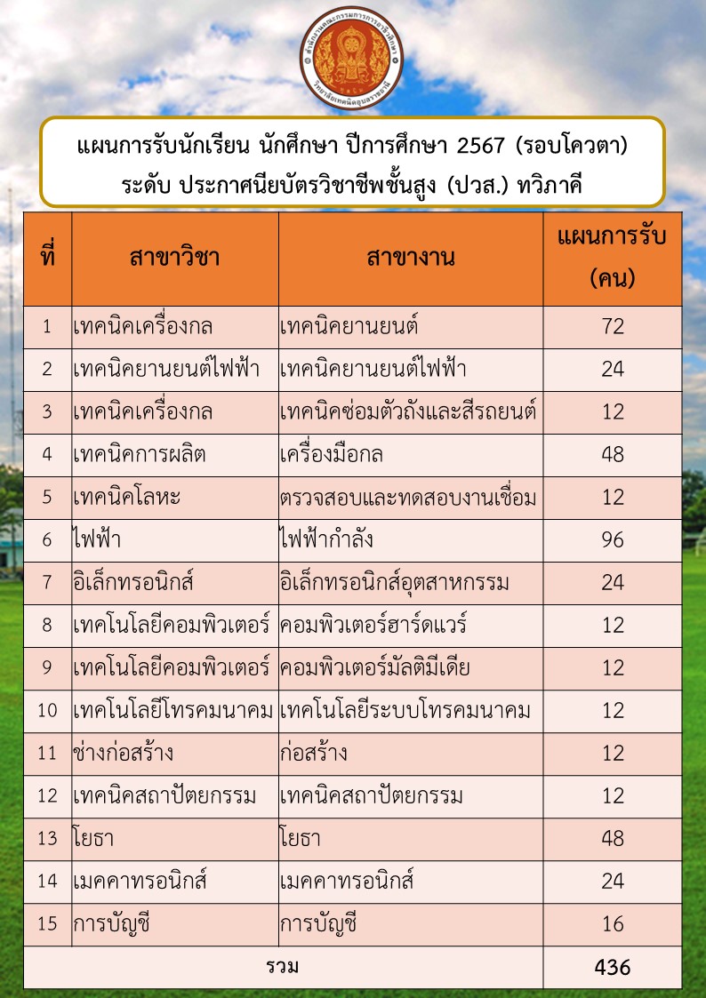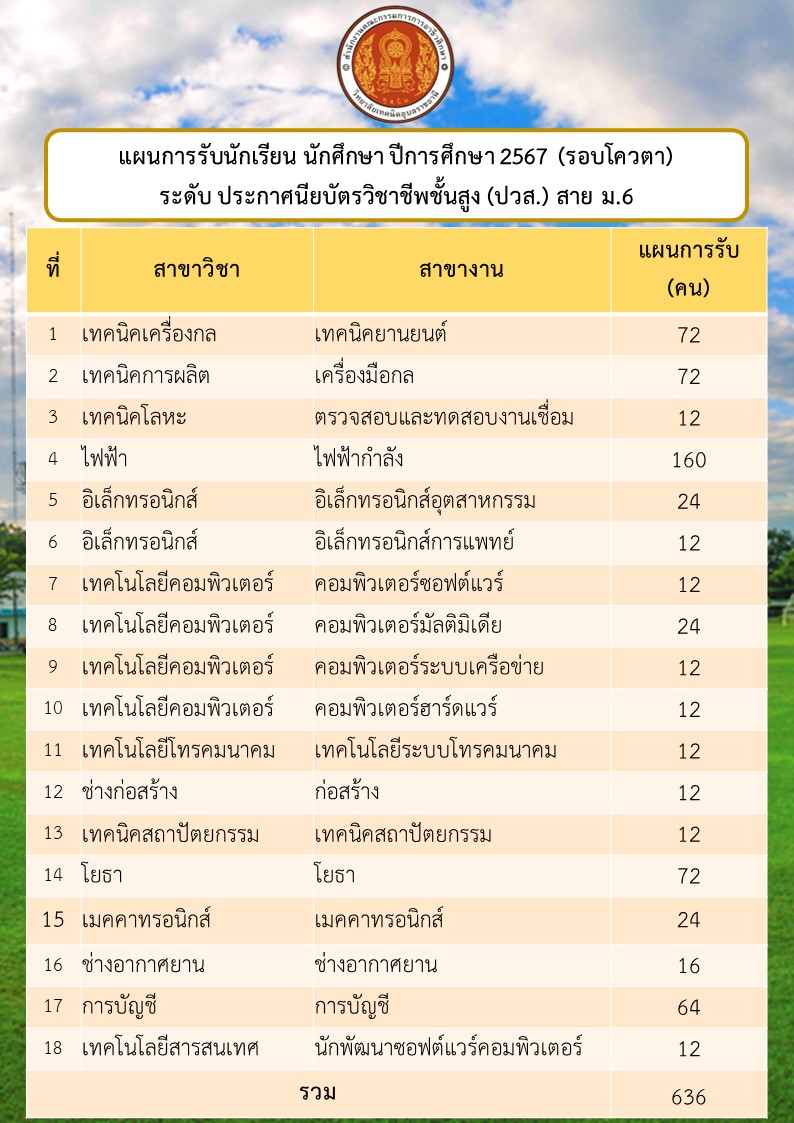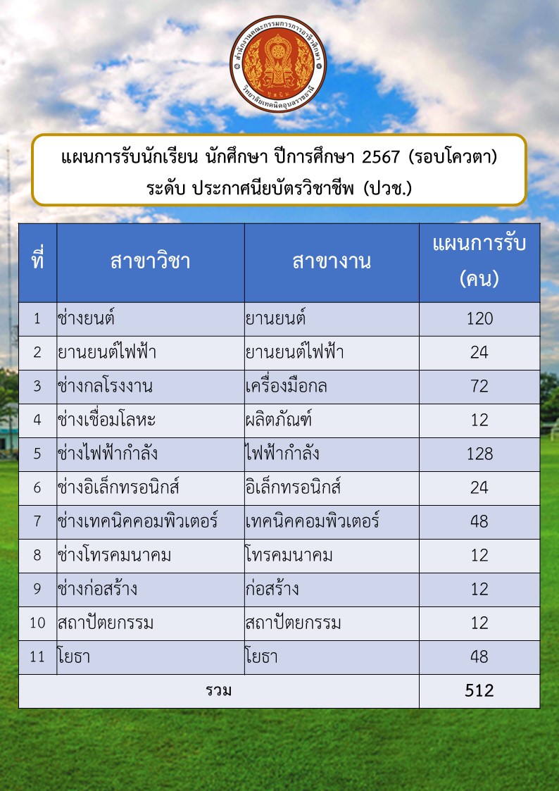 แผนการรับนักเรียน นักศึกษา ปีการศึกษา 2567 (รอบโควตา) วิทยาลัยเทคนิคอุบลราชธานี