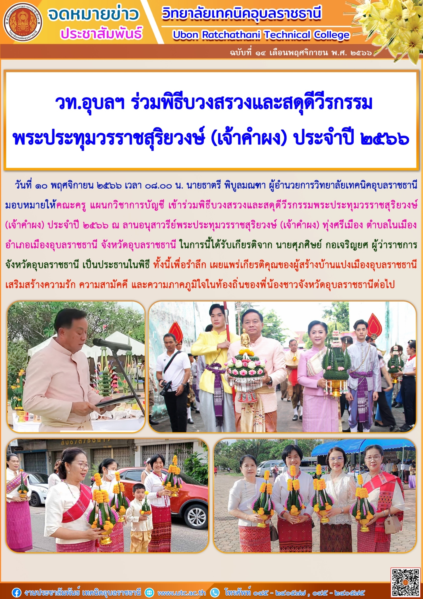 วันที่ ๑๐ พฤศจิกายน ๒๕๖๖ เวลา ๐๘.๐๐ น. นายธาตรี พิบูลมณฑา ผู้อำนวยการวิทยาลัยเทคนิคอุบลราชธานี มอบหมายให้คณะครู แผนกวิชาการบัญชี เข้าร่วมพิธีบวงสรวงและสดุดีวีรกรรมพระประทุมวรราชสุริยวงษ์ (เจ้าคำผง) ประจำปี ๒๕๖๖ ณ ลานอนุสาวรีย์พระประทุมวรราชสุริยวงษ์ (เจ้าคำผง) ทุ่งศรีเมือง ตำบลในเมือง อำเภอเมืองอุบลราชธานี จังหวัดอุบลราชธานี ในการนี้ได้รับเกียรติจาก นายศุภศิษย์ กอเจริญยศ ผู้ว่าราชการจังหวัดอุบลราชธานี เป็นประธานในพิธี ทั้งนี้เพื่อรำลึก เผยแพร่เกียรติคุณของผู้สร้างบ้านแปงเมืองอุบลราชธานี เสริมสร้างความรัก ความสามัคคี และความภาคภูมิใจในท้องถิ่นของพี่น้องชาวจังหวัดอุบลราชธานีต่อไป