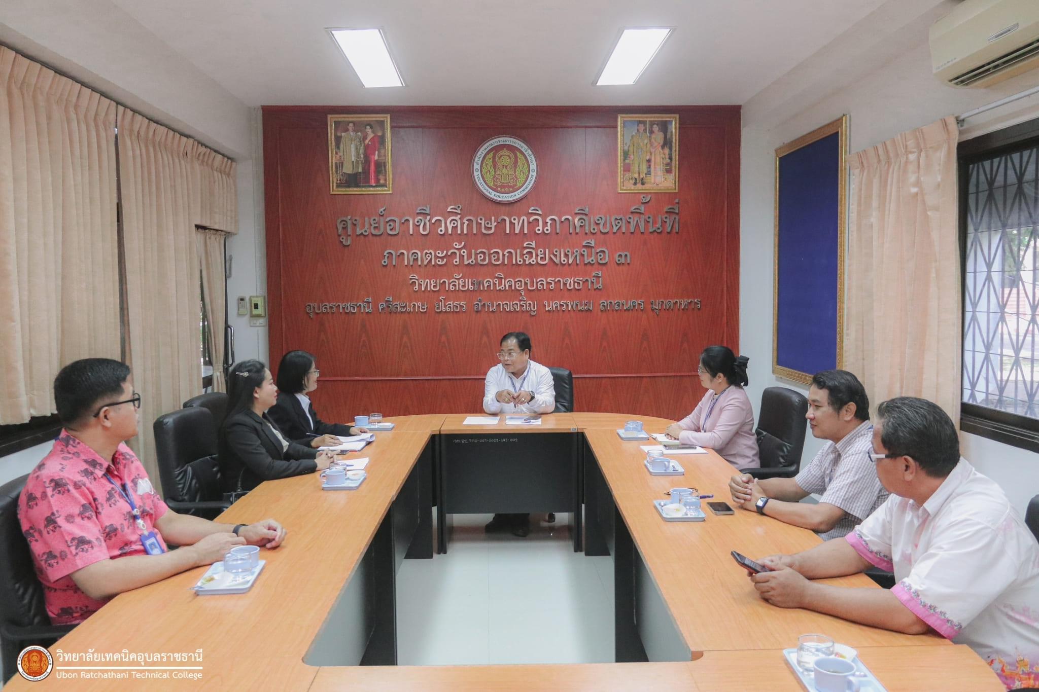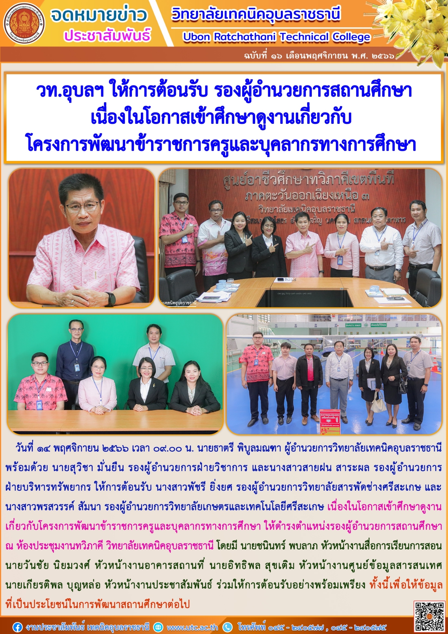 วันที่ ๑๔ พฤศจิกายน ๒๕๖๖ เวลา ๐๙.๐๐ น. นายธาตรี พิบูลมณฑา ผู้อำนวยการวิทยาลัยเทคนิคอุบลราชธานี พร้อมด้วย นายสุวิชา มั่นยืน รองผู้อำนวยการฝ่ายวิชาการ และนางสาวสายฝน สาระผล รองผู้อำนวยการฝ่ายบริหารทรัพยากร ให้การต้อนรับ นางสาวพัชรี ยิ่งยศ รองผู้อำนวยการวิทยาลัยสารพัดช่างศรีสะเกษ และนางสาวพรสวรรค์ สัมนา รองผู้อำนวยการวิทยาลัยเกษตรและเทคโนโลยีศรีสะเกษ เนื่องในโอกาสเข้าศึกษาดูงานเกี่ยวกับโครงการพัฒนาข้าราชการครูและบุคลากรทางการศึกษา ให้ดำรงตำแหน่งรองผู้อำนวยการสถานศึกษา ณ ห้องประชุมงานทวิภาคี วิทยาลัยเทคนิคอุบลราชธานี โดยมี นายชนินทร์ พบลาภ หัวหน้างานสื่อการเรียนการสอน นายวันชัย นิยมวงศ์ หัวหน้างานอาคารสถานที่ นายอิทธิพล สุขเติม หัวหน้างานศูนย์ข้อมูลสารสนเทศ นายเกียรติพล บุญหล่อ หัวหน้างานประชาสัมพันธ์ ร่วมให้การต้อนรับอย่างพร้อมเพรียง ทั้งนี้เพื่อให้ข้อมูลที่เป็นประโยชน์ในการพัฒนาสถานศึกษาต่อไป