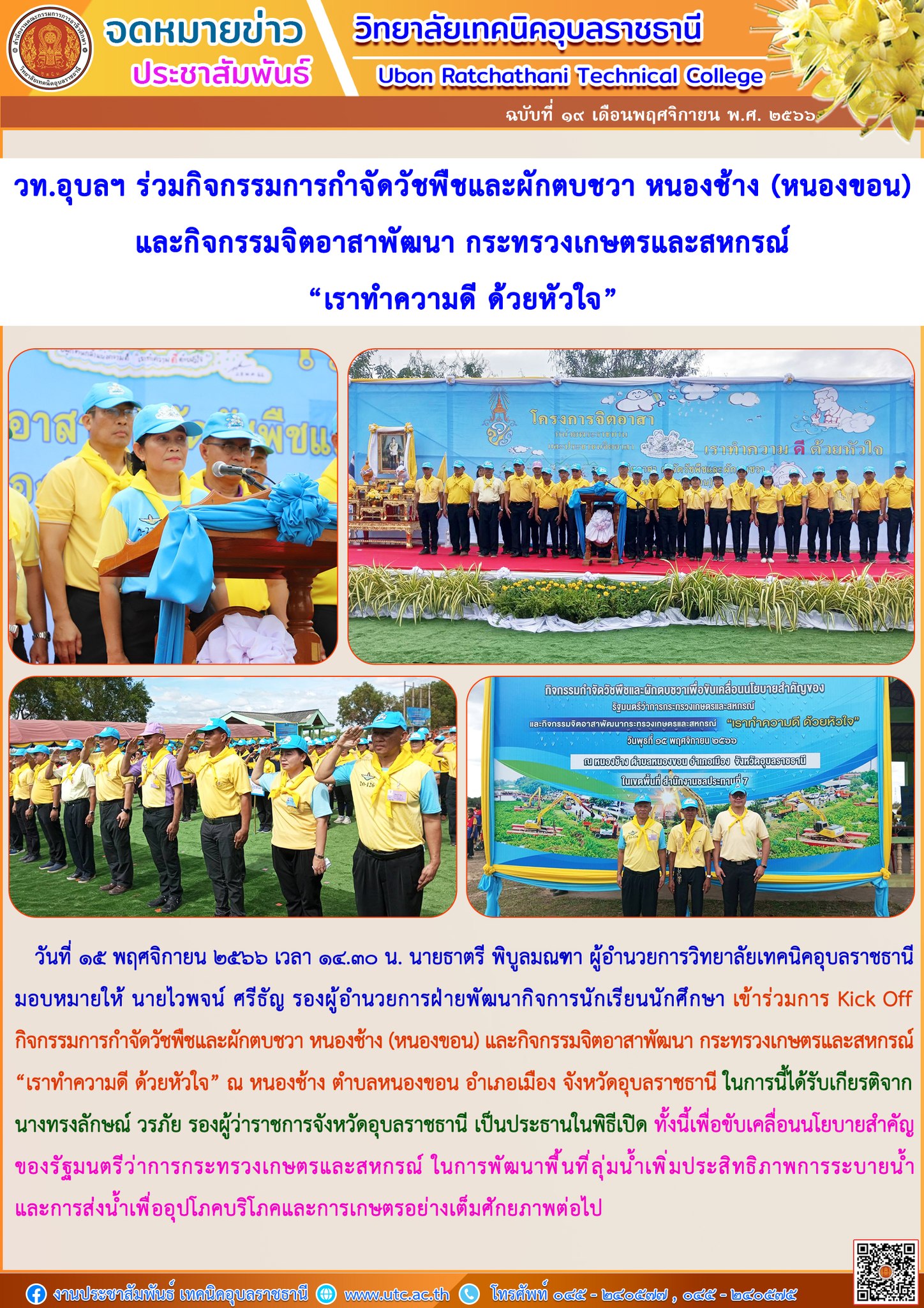 วันที่ ๑๕ พฤศจิกายน ๒๕๖๖ เวลา ๑๔.๓๐ น. นายธาตรี พิบูลมณฑา ผู้อำนวยการวิทยาลัยเทคนิคอุบลราชธานี มอบหมายให้ นายไวพจน์ ศรีธัญ รองผู้อำนวยการฝ่ายพัฒนากิจการนักเรียนนักศึกษา เข้าร่วมการ Kick Off กิจกรรมการกำจัดวัชพืชและผักตบชวา หนองช้าง (หนองขอน) และกิจกรรมจิตอาสาพัฒนา กระทรวงเกษตรและสหกรณ์ “เราทำความดี ด้วยหัวใจ” ณ หนองช้าง ตำบลหนองขอน อำเภอเมือง จังหวัดอุบลราชธานี ในการนี้ได้รับเกียรติจาก นางทรงลักษณ์ วรภัย รองผู้ว่าราชการจังหวัดอุบลราชธานี เป็นประธานในพิธีเปิด ทั้งนี้เพื่อขับเคลื่อนนโยบายสำคัญของรัฐมนตรีว่าการกระทรวงเกษตรและสหกรณ์ ในการพัฒนาพื้นที่ลุ่มน้ำเพิ่มประสิทธิภาพการระบายน้ำ และการส่งน้ำเพื่ออุปโภคบริโภคและการเกษตรอย่างเต็มศักยภาพต่อไป