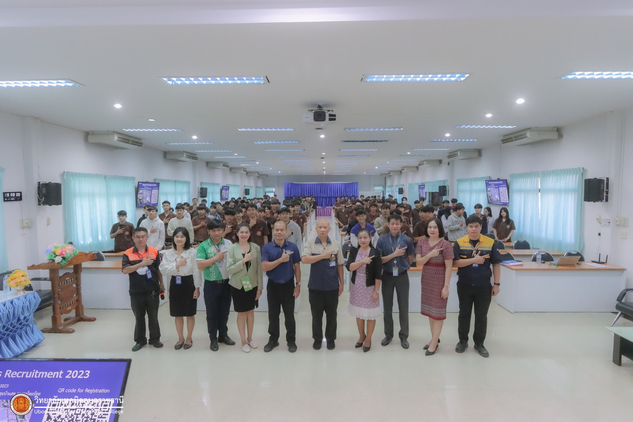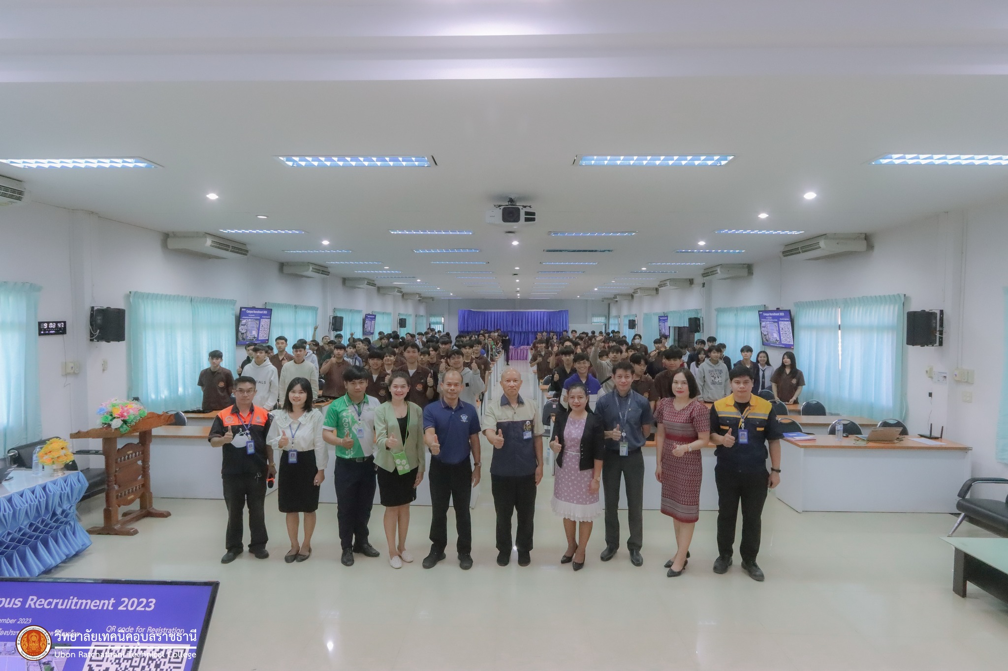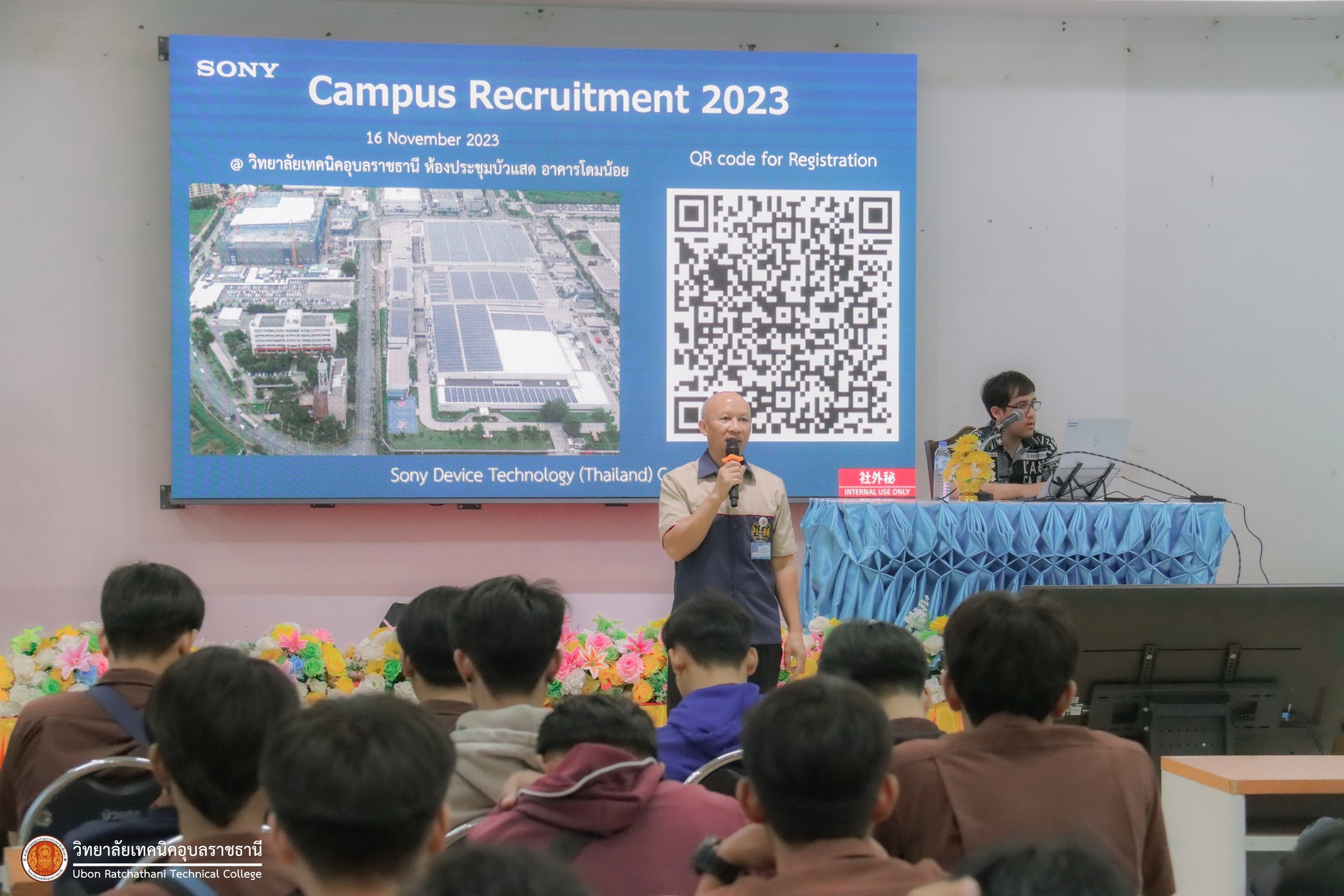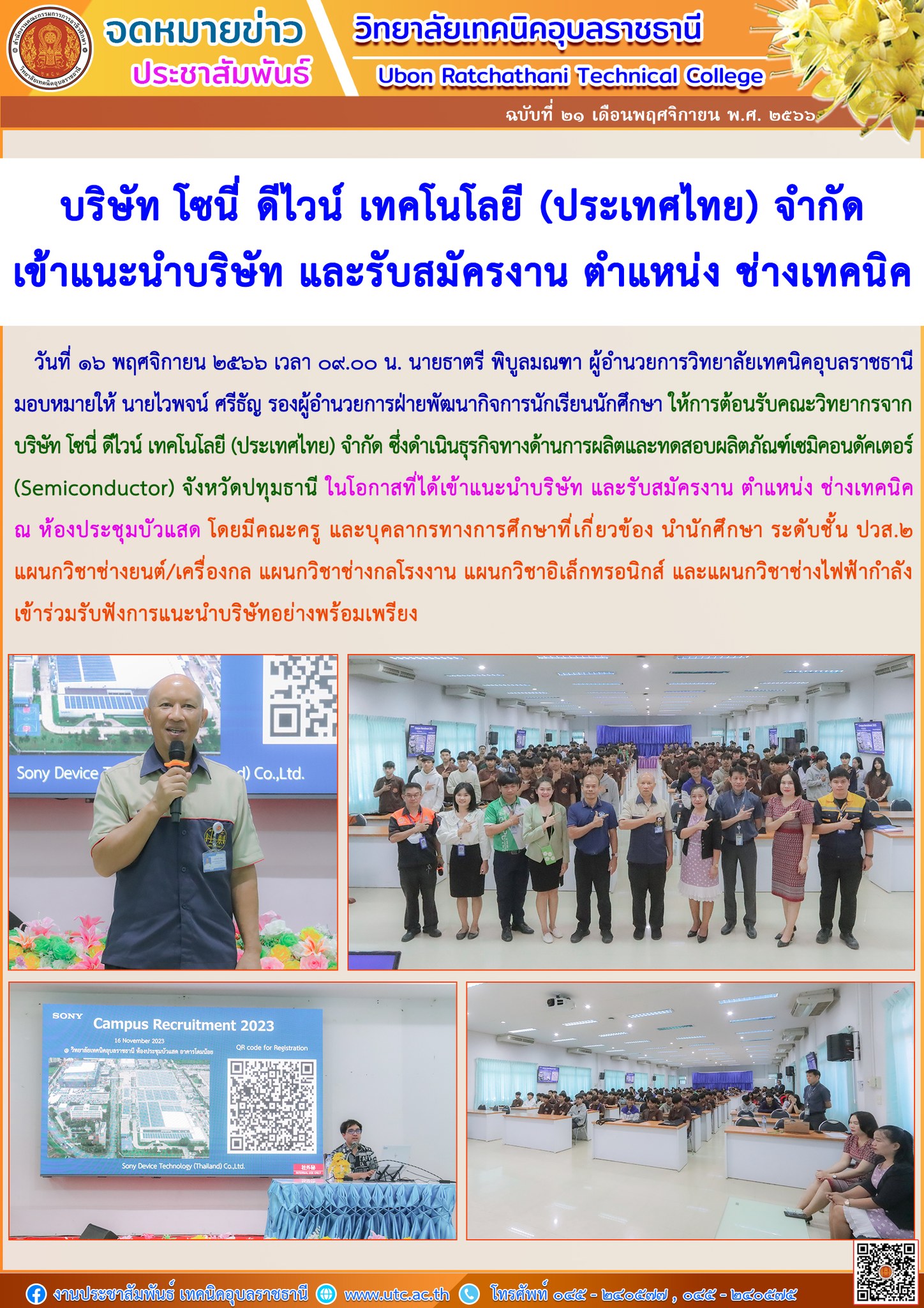 วันที่ ๑๖ พฤศจิกายน ๒๕๖๖ เวลา ๐๙.๐๐ น. นายธาตรี พิบูลมณฑา ผู้อำนวยการวิทยาลัยเทคนิคอุบลราชธานี มอบหมายให้ นายไวพจน์ ศรีธัญ รองผู้อำนวยการฝ่ายพัฒนากิจการนักเรียนนักศึกษา ให้การต้อนรับคณะวิทยากรจากบริษัท โซนี่ ดีไวน์ เทคโนโลยี (ประเทศไทย) จำกัด ซึ่งดำเนินธุรกิจทางด้านการผลิตและทดสอบผลิตภัณฑ์เซมิคอนดัคเตอร์ (Semiconductor) จังหวัดปทุมธานี ในโอกาสที่ได้เข้าแนะนำบริษัท และรับสมัครงานตำแหน่ง ช่างเทคนิค ณ ห้องประชุมบัวแสด โดยมีคณะครู และบุคลากรทางการศึกษาที่เกี่ยวข้อง นำนักศึกษาระดับชั้น ปวส.๒ แผนกวิชาช่างยนต์/เครื่องกล แผนกวิชาช่างกลโรงงาน แผนกวิชาอิเล็กทรอนิกส์ และแผนกวิชาช่างไฟฟ้ากำลัง เข้าร่วมรับฟังการแนะนำบริษัทอย่างพร้อมเพรียง