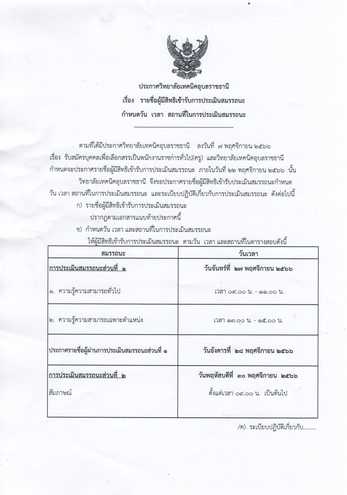 ตามที่ได้มีประกาศวิทยาลัยเทคนิคอุบลราชธานี ลงวันที่ 7 พฤศจิกายน 2566 เรื่อง รับสมัครบุคคลเพื่อเลือกสรรเป็นพนักงานราชการทั่วไป(ครู) และวิทยาลัยเทคนิคอุบลราชธานี กำหนดจะประกาศรายชื่อผู้มีสิทธิเข้ารับการประเมินสมรรถนะ ภายในวันที่ 22 พฤศจิกายน 2566 นั้น วิทยาลัยเทคนิคอุบลราชธานี จึงขอประกาศรายชื่อผู้มีสิทธิเข้ารับการประเมินสมรรถนะ กำหนดวัน เวลา สถานที่ในการประเมินสมรรถนะ และระเบียบปฏิบัติเกี่ยวกับการประเมินสมรรถนะ ดังต่อไปนี้